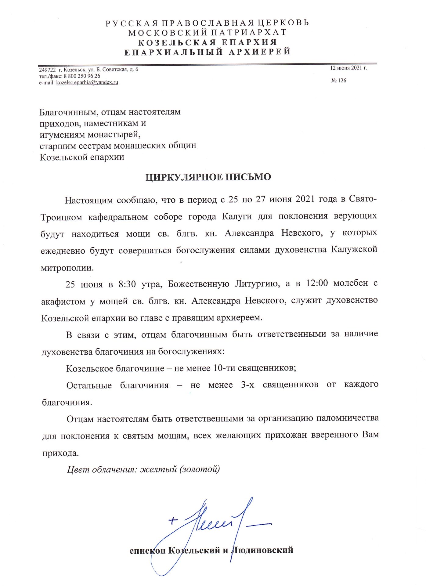 25 июня в 8. 30 Божественную литургию, а в 12. 00 молебен с акафистом у мощей святого благоверного князя совершит духовенство Козельской епархии во главе с правящим архиереем.