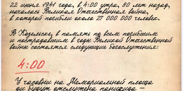 22 июня в 4. 00 состоится панихида на Мемориальной площади Козельска