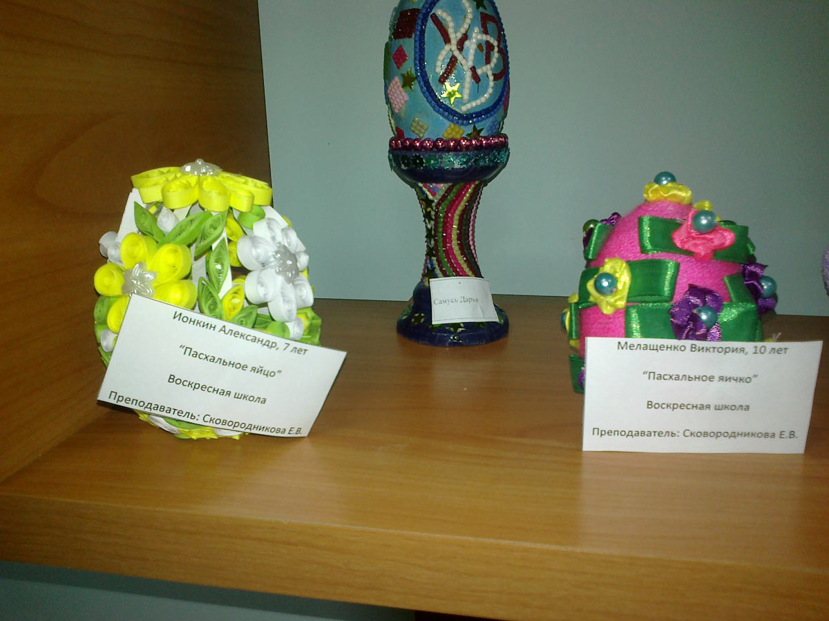 8 апреля во Дворце культуры г. Сухиничи прошло открытие выставки «Пасхальный сувенир». На ней представлены рукодельные работы учащихся средних школ города и Воскресной школы при храме Смоленской иконы Божией Матери, посвященные празднику Пасхи.
