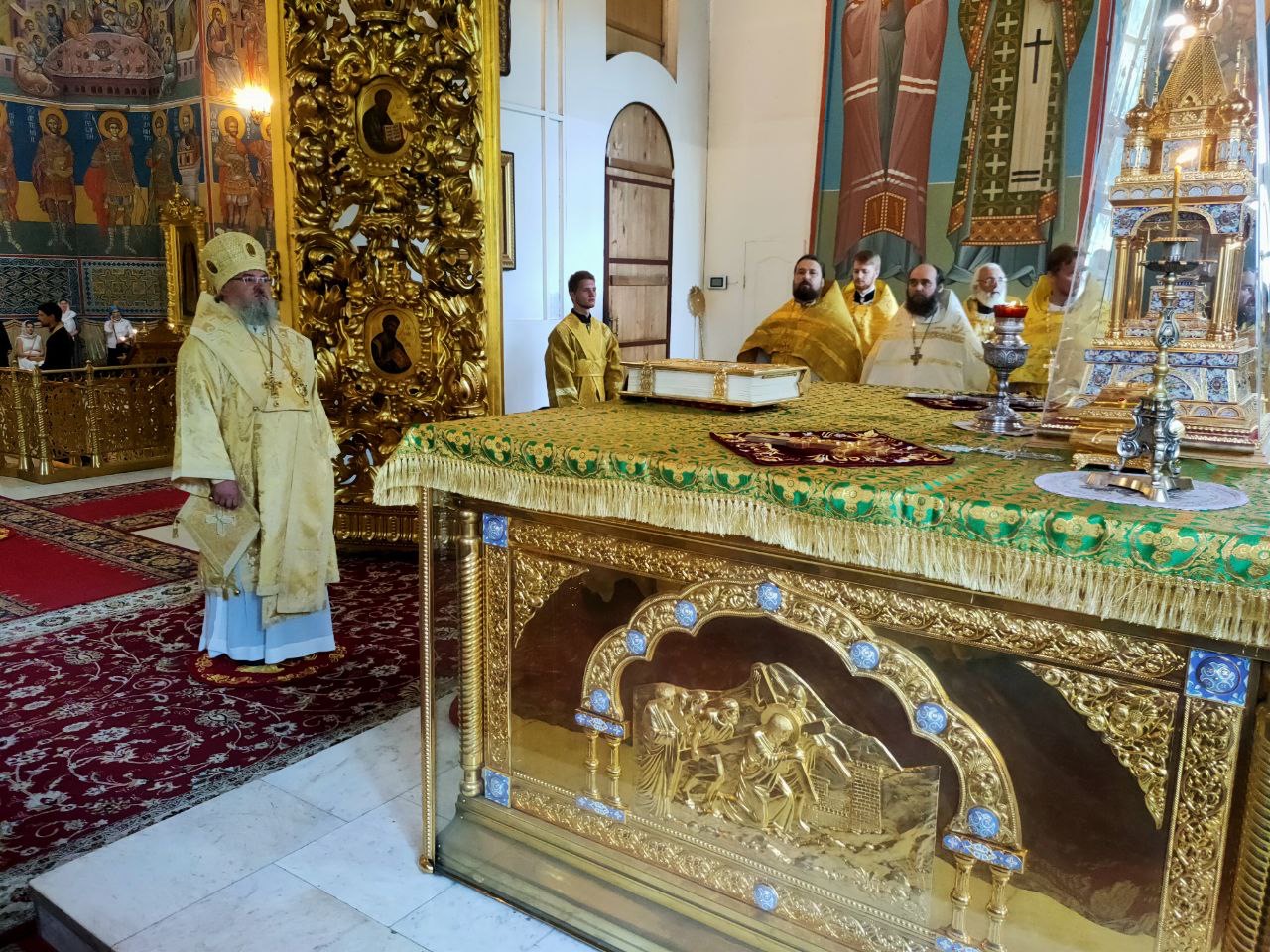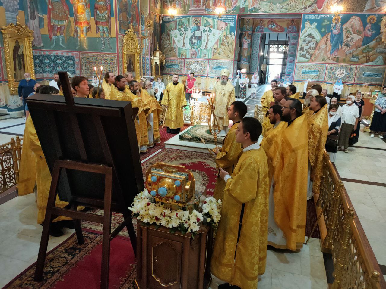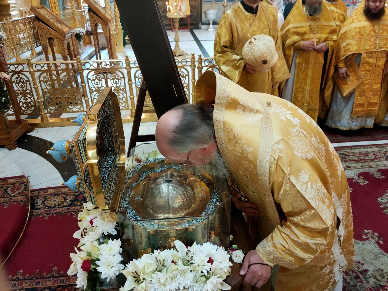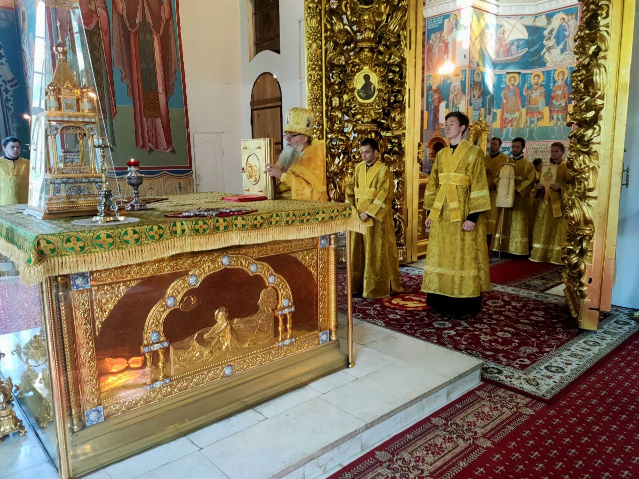 Первую Божественную литургию по прибытию святыни совершил епископ Козельский и Людиновский Никита в сослужении духовенства Козельской епархии.