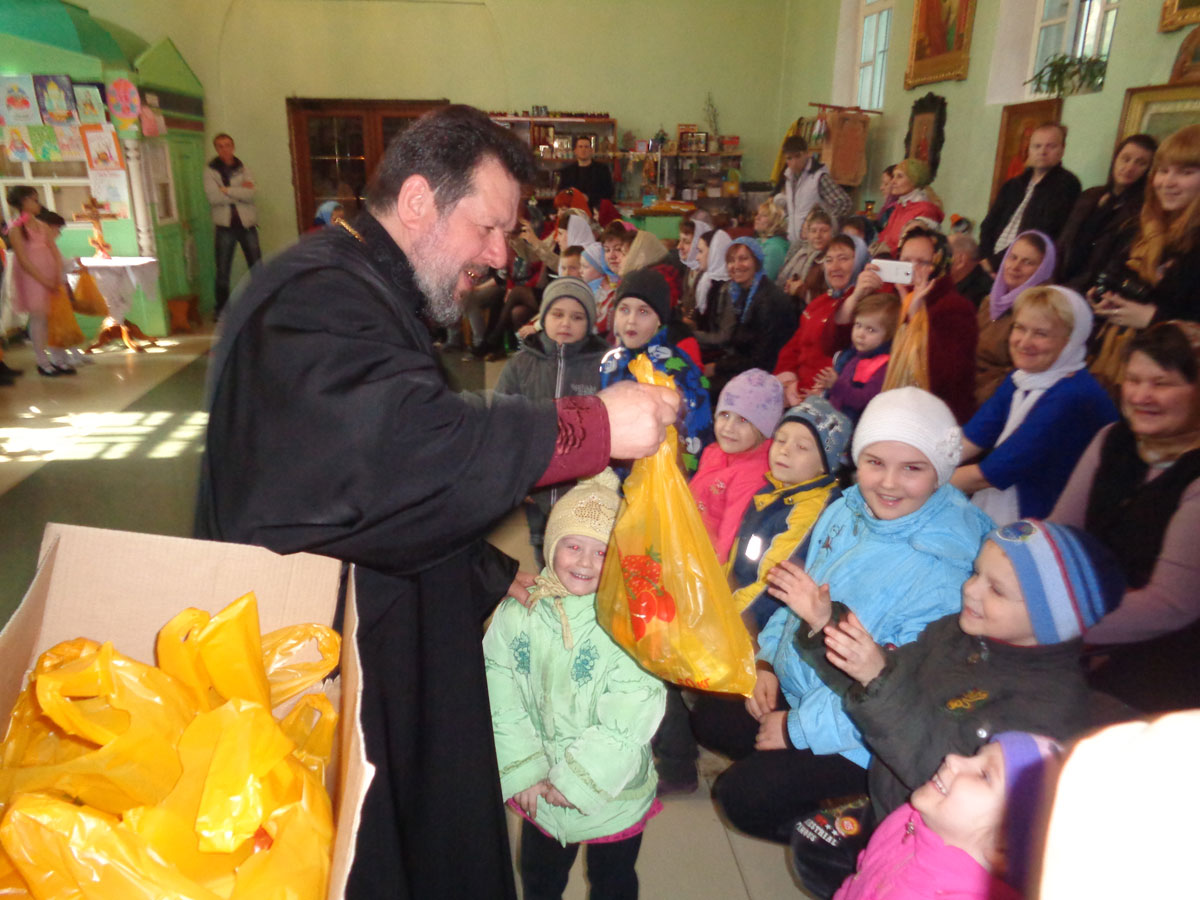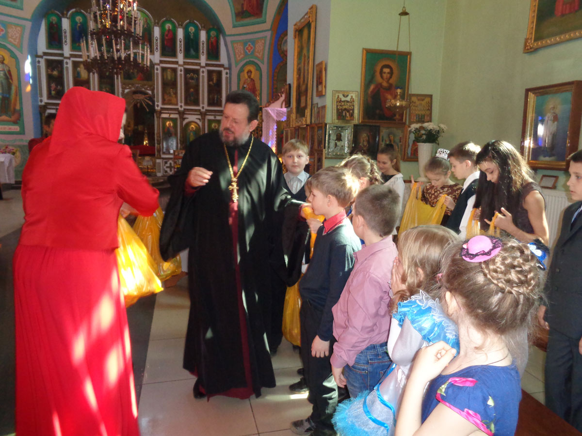 После выступления детей, настоятель храма протоиерей Василий Биляк поздравил всех со Светлым Христовым Воскресением и вручил подарки. Все присутствовавшие на празднике получили в подарок красное яйцо.