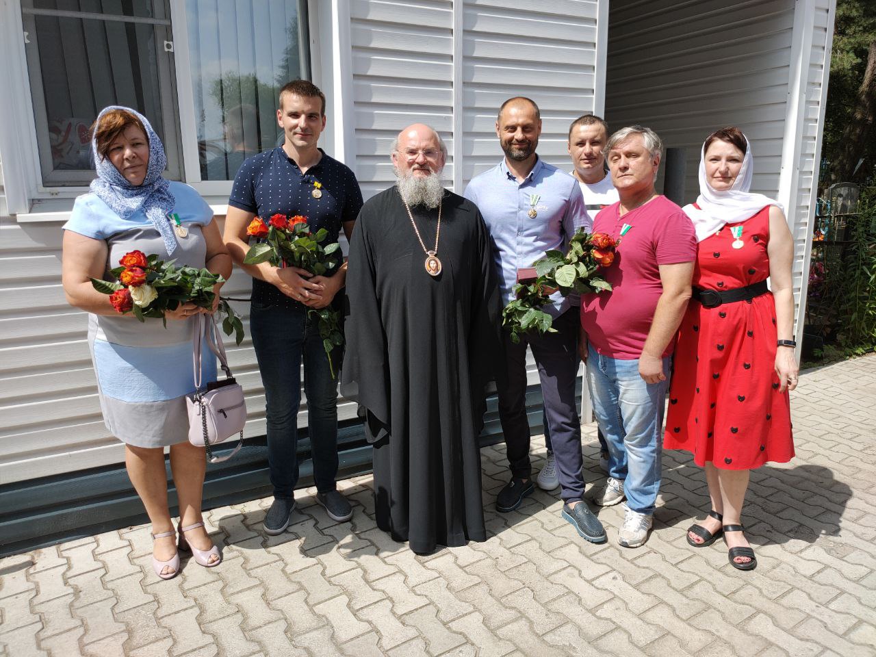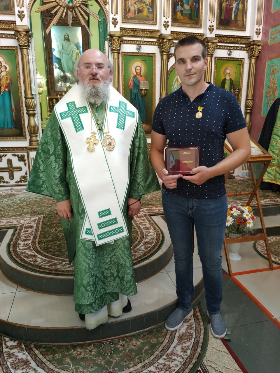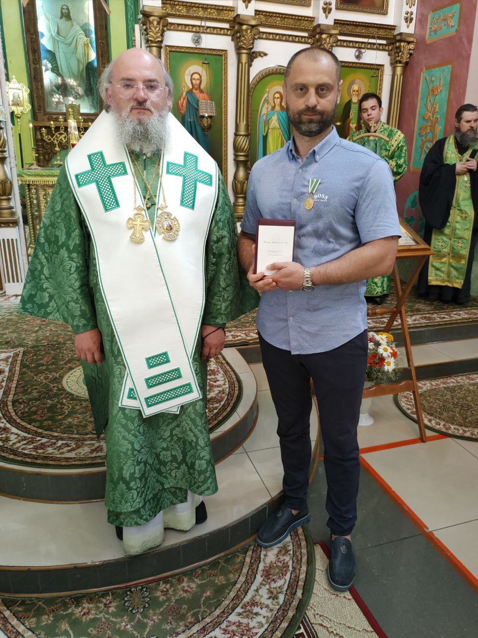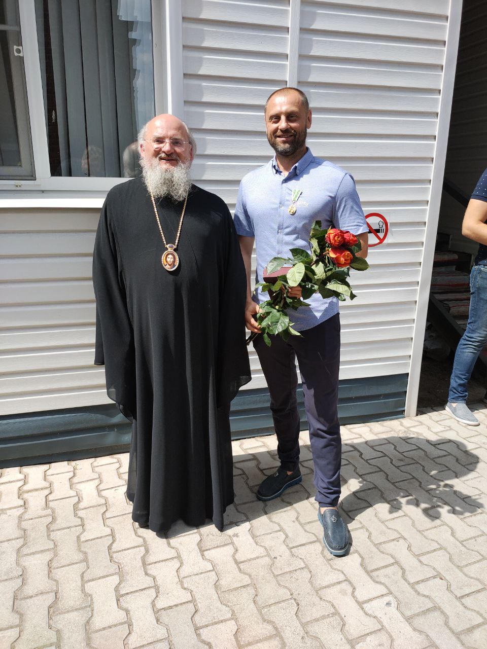 Владыка поблагодарил настоятеля храма – протоиерея Василия Биляка за неустанную заботу о храме  и вручил его помощникам и благотворителям прихода церковные награды: Алексею Владимировичу Моисеенкову – директору Фонда имени святого благоверного князя Александра Невского вручена медаль Русской Православной Церкви преподобного Серафима Саровского.