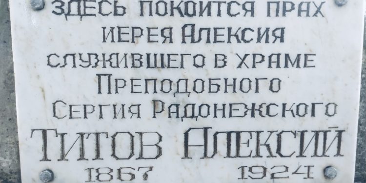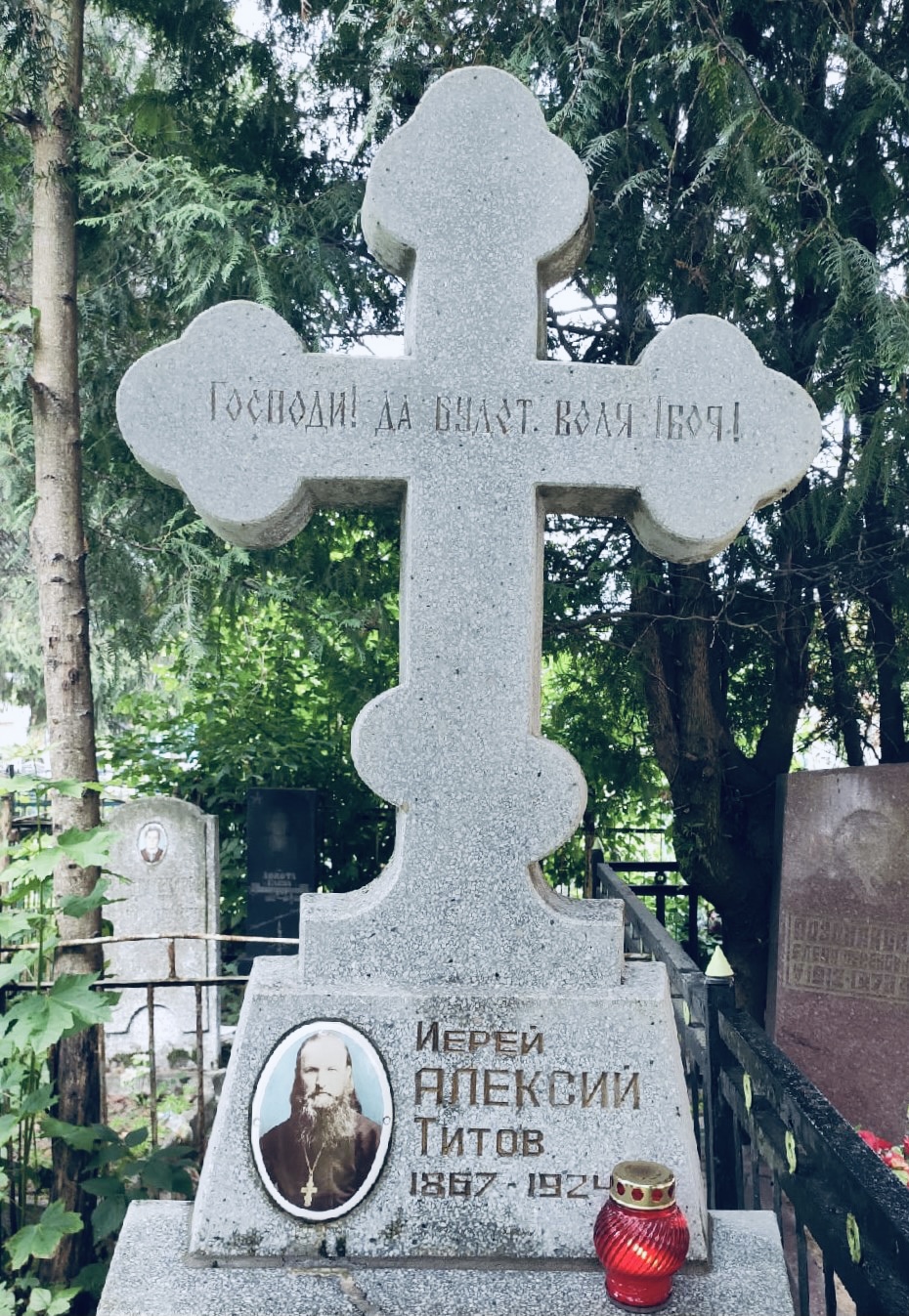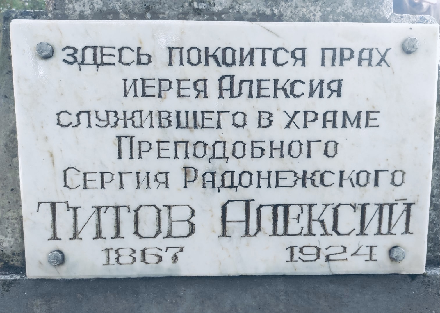 Историческая справка: известно, что иерей Алексий Титов был настоятелем храма в честь преподобного Сергия Радонежского город Людиново. Скончался в 1924 году и похоронен с северной стороны храма.
