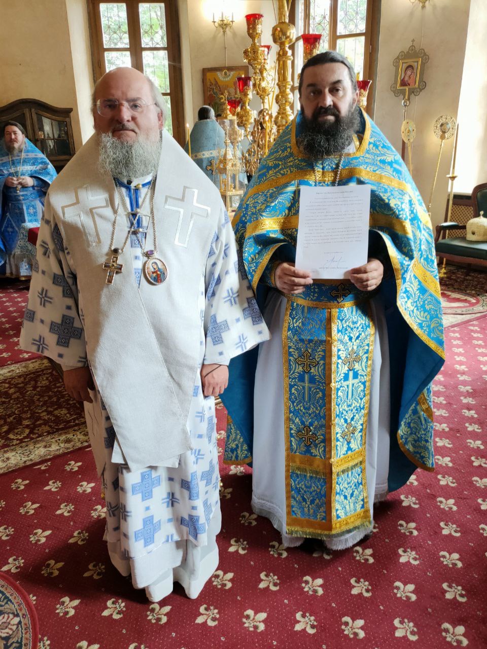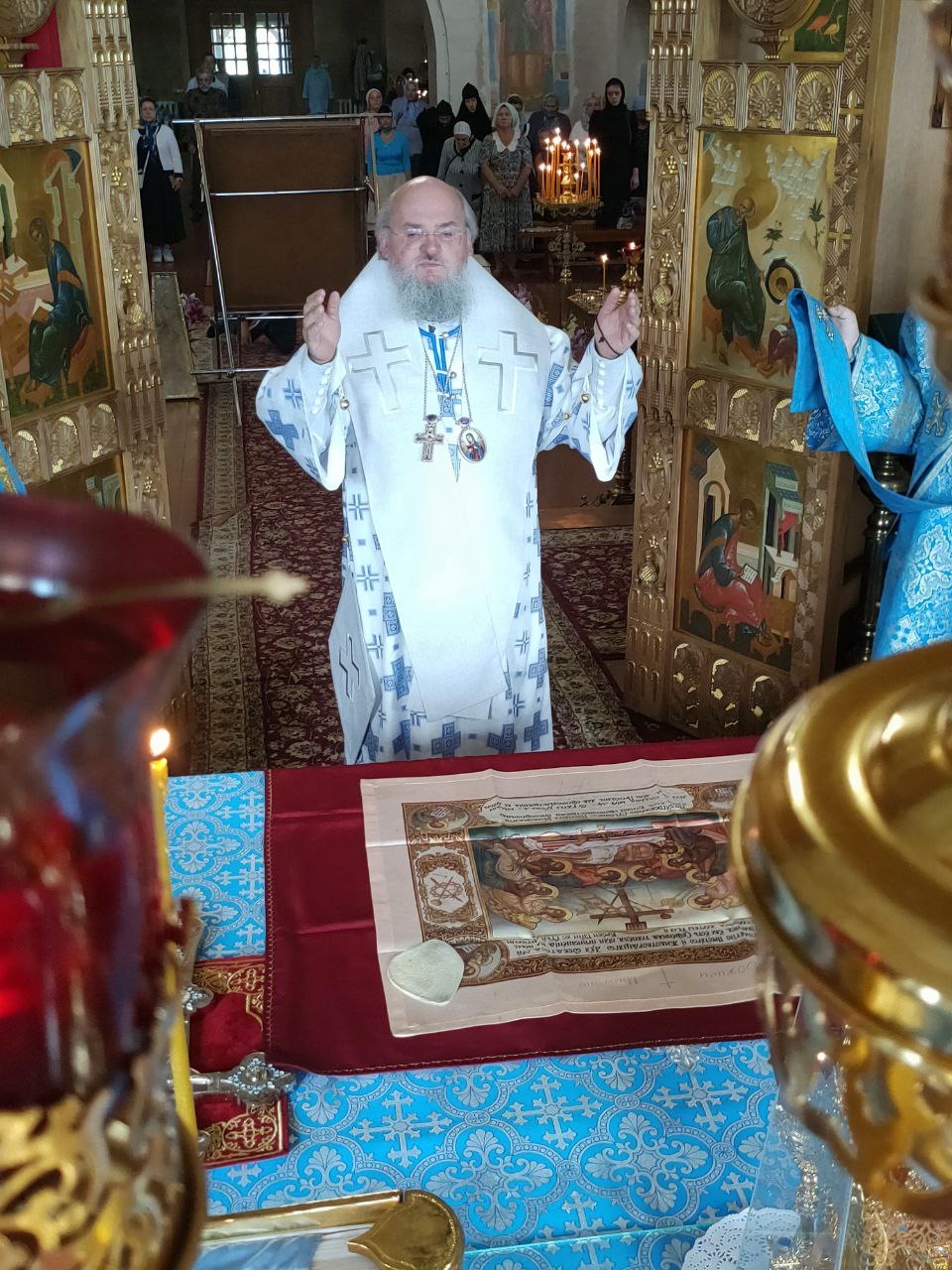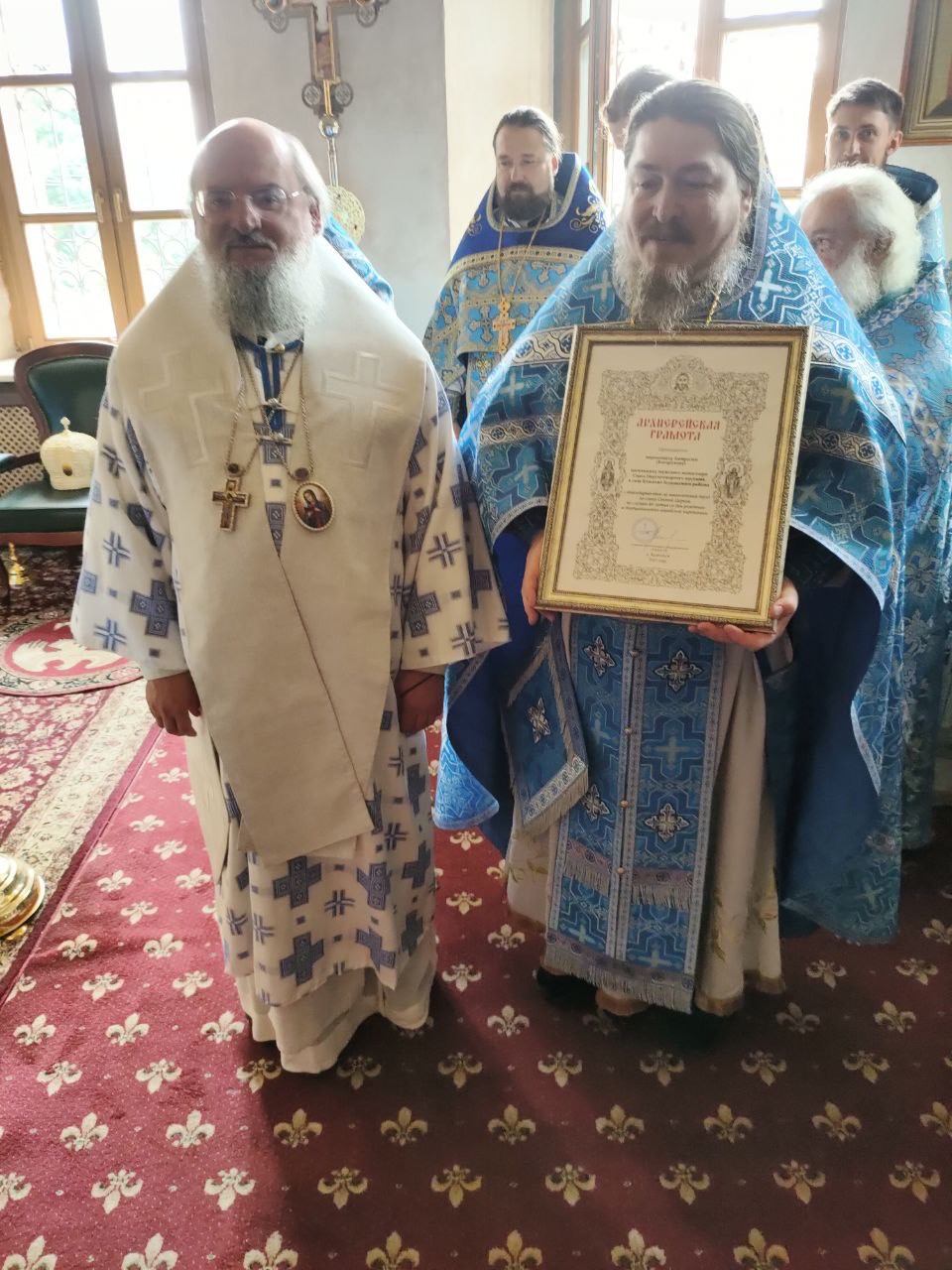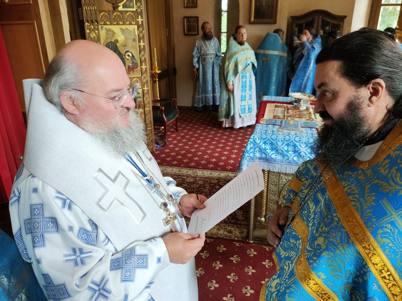 За богослужением владыка поздравил с памятными датами клириков епархии: насельника монастыря Спаса Нерукотворного пустынь иеромонаха Амвросия Косорукова с сорокапятилетием со дня рождения и вручил ему благодарственную Архиерейскую грамоту; клирика Вознесенского храма города Козельска иерея Ярослава Стрельникова и клирика Преображенского храма села Нижние Прыски иерея Симеона Худякова с десятилетием со дня венчания и вручил им поздравительные письма.