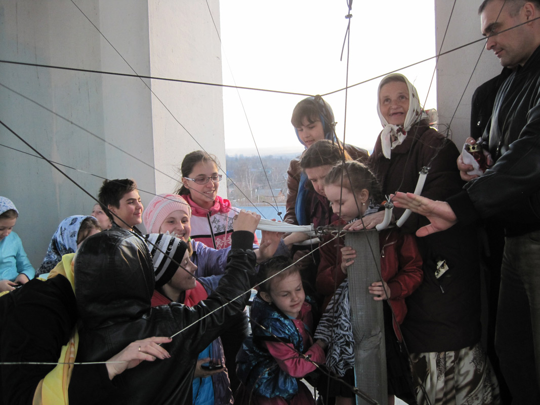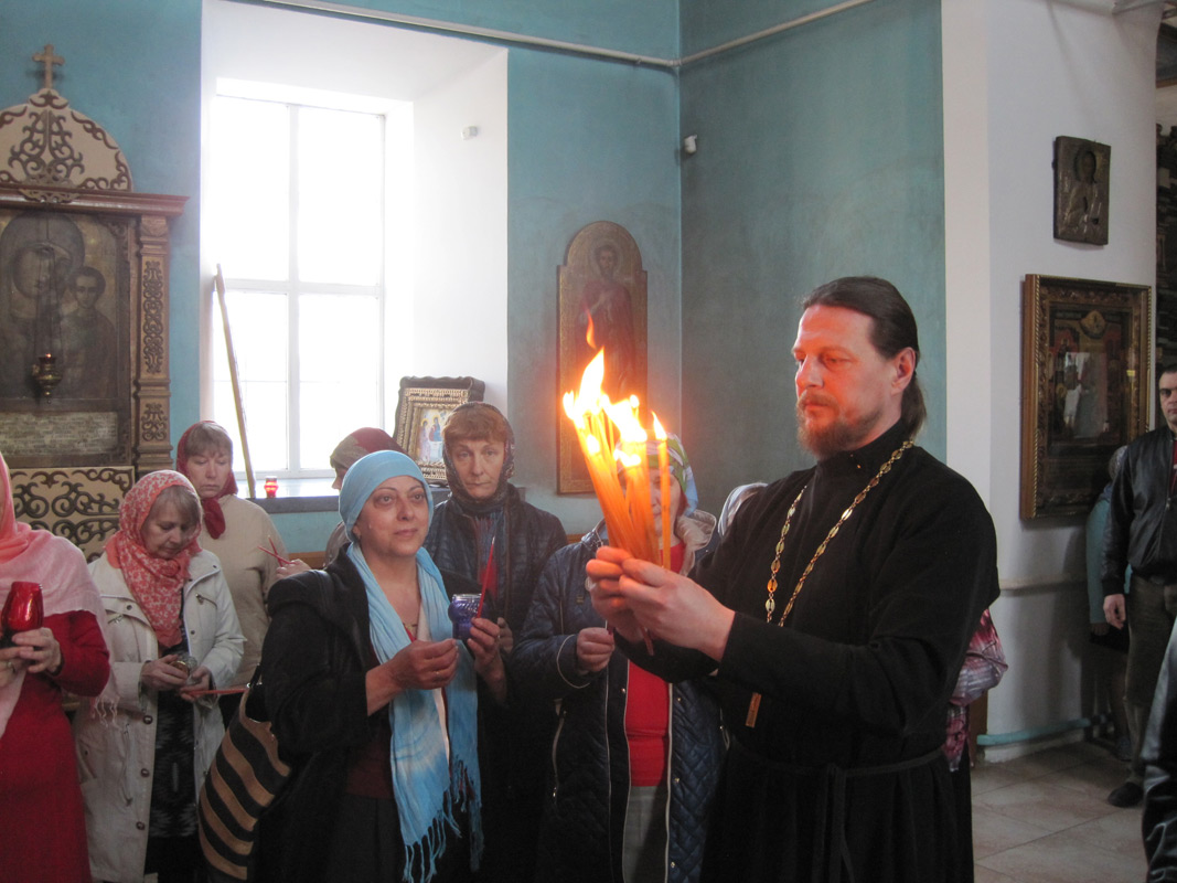 В течение дня все желающие побывали на колокольне храма и радовали сухиничан Пасхальными звонами. Днем состоялось торжественная встреча Благодатного огня, а вечером была совершена Пасхальная вечерня.