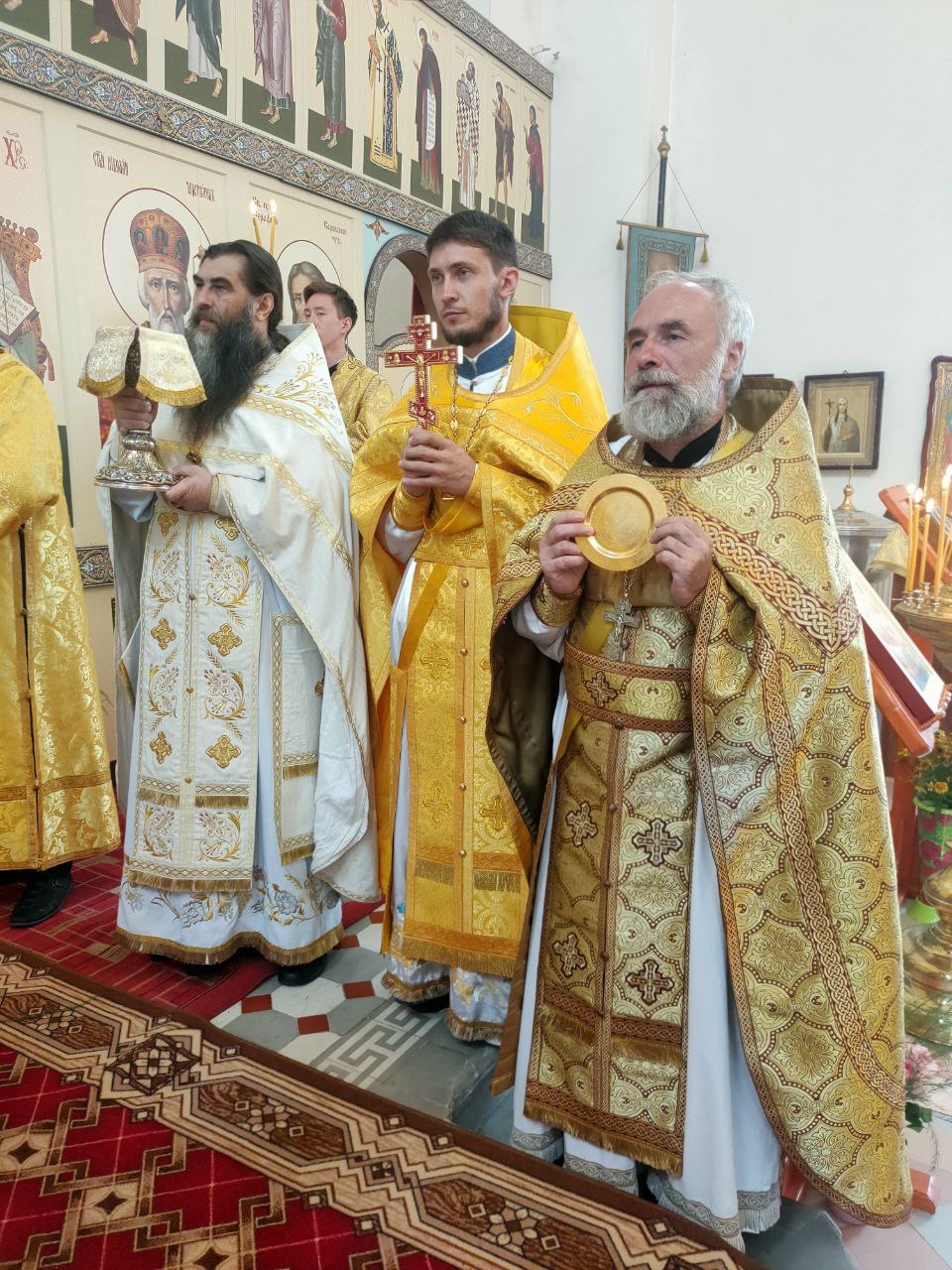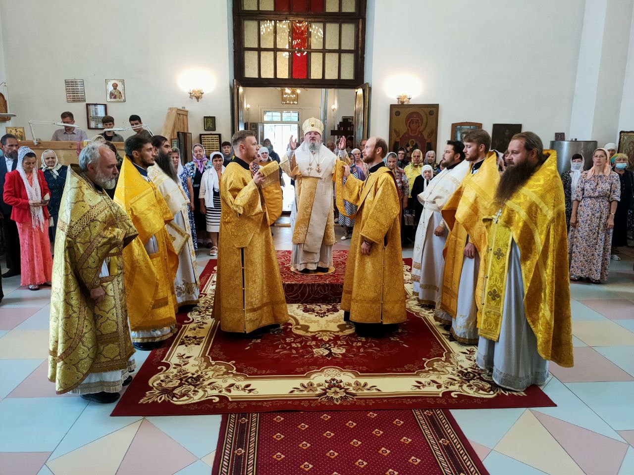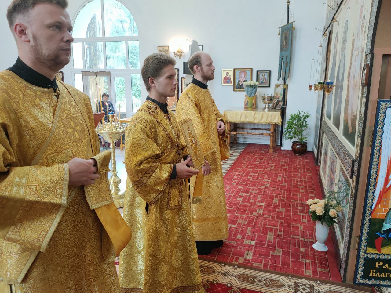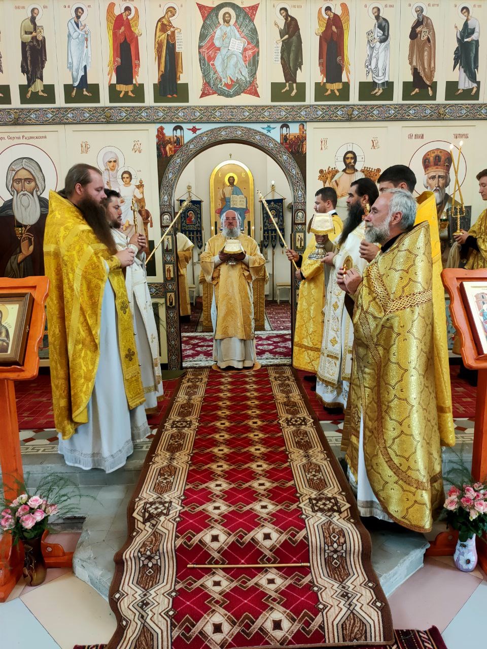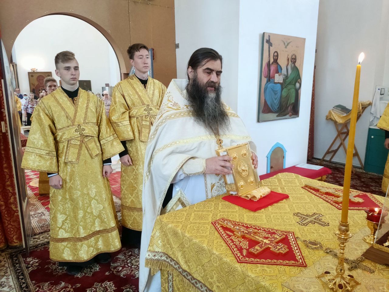 Преосвященному владыке сослужили: игумен Михаил (Семенов), протоиерей Антоний Хатунцев, иерей Евгений Мягков – настоятель храма, иерей Елисей Тимофеев, иерей Евгений Чуркин, диакон Евгений Ковригин и иеродиакон Лука (Старостин).