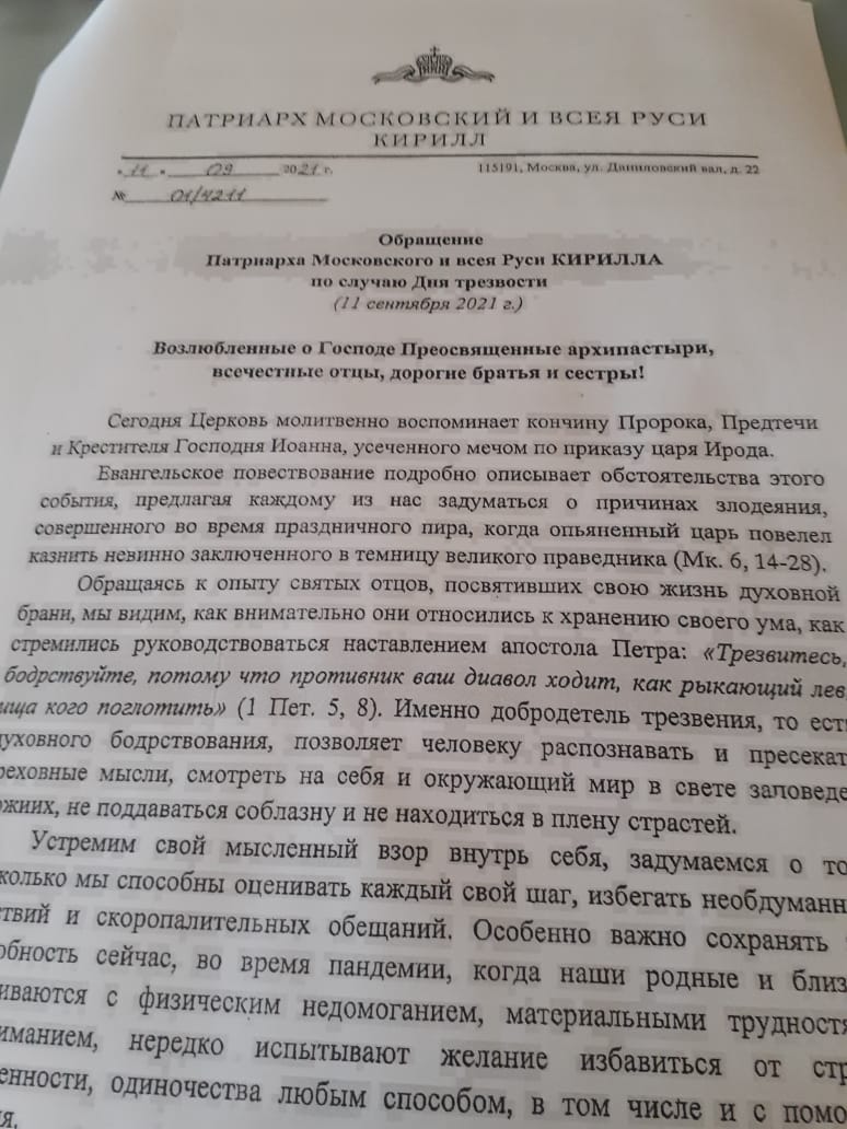 «…Именно добродетель трезвения, то есть духовного бодрствования, позволяет человеку распознавать и пресекать греховные мысли, смотреть на себя и окружающий мир в свете заповедей Божиих, не поддаваться соблазну и не находиться в плену страстей» … (Из обращения Святейшего Патриарха Московского и всея Руси Кирилла по случаю Всероссийского Дня трезвости).