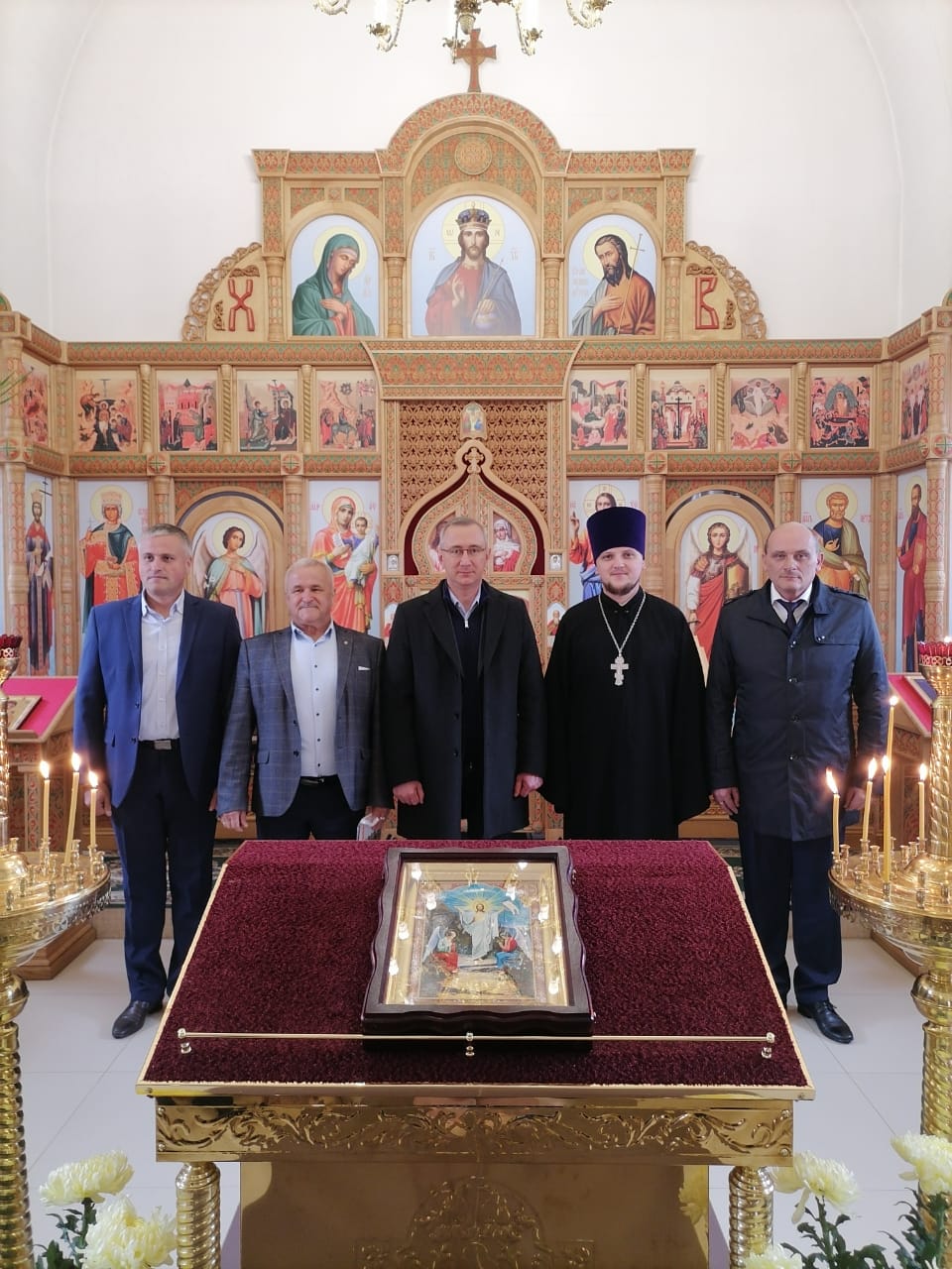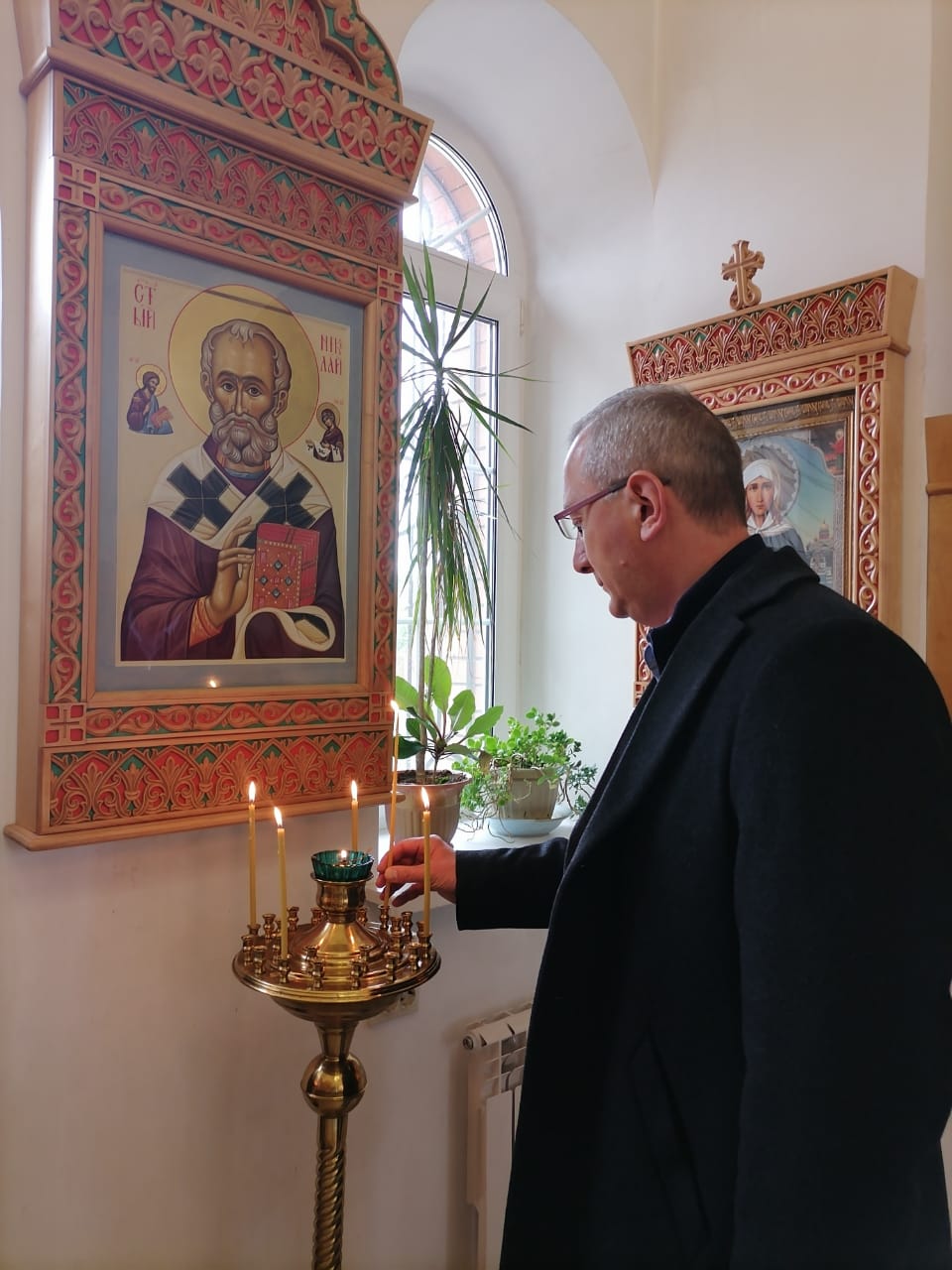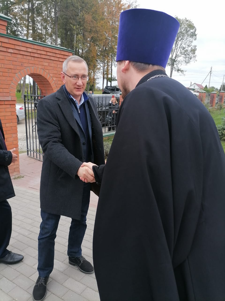 Настоятель храма иерей Иоанн Майоров вместе с ктитором храма Николаем Николаевичем Кленовым встретили губернатора под звон колоколов.