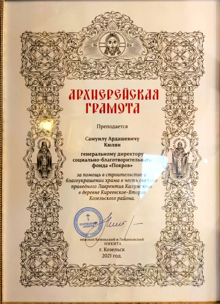 Ряд благотоврителей, принимавших активное участие в строительстве и благоукрашении храма были удостоены Архиерейских грамот.