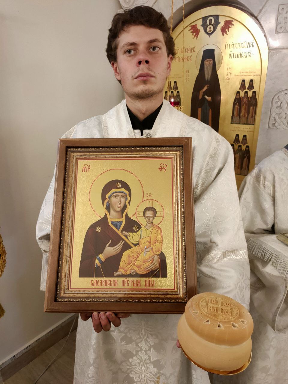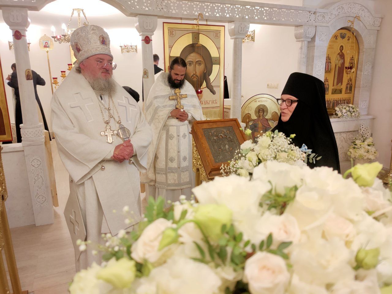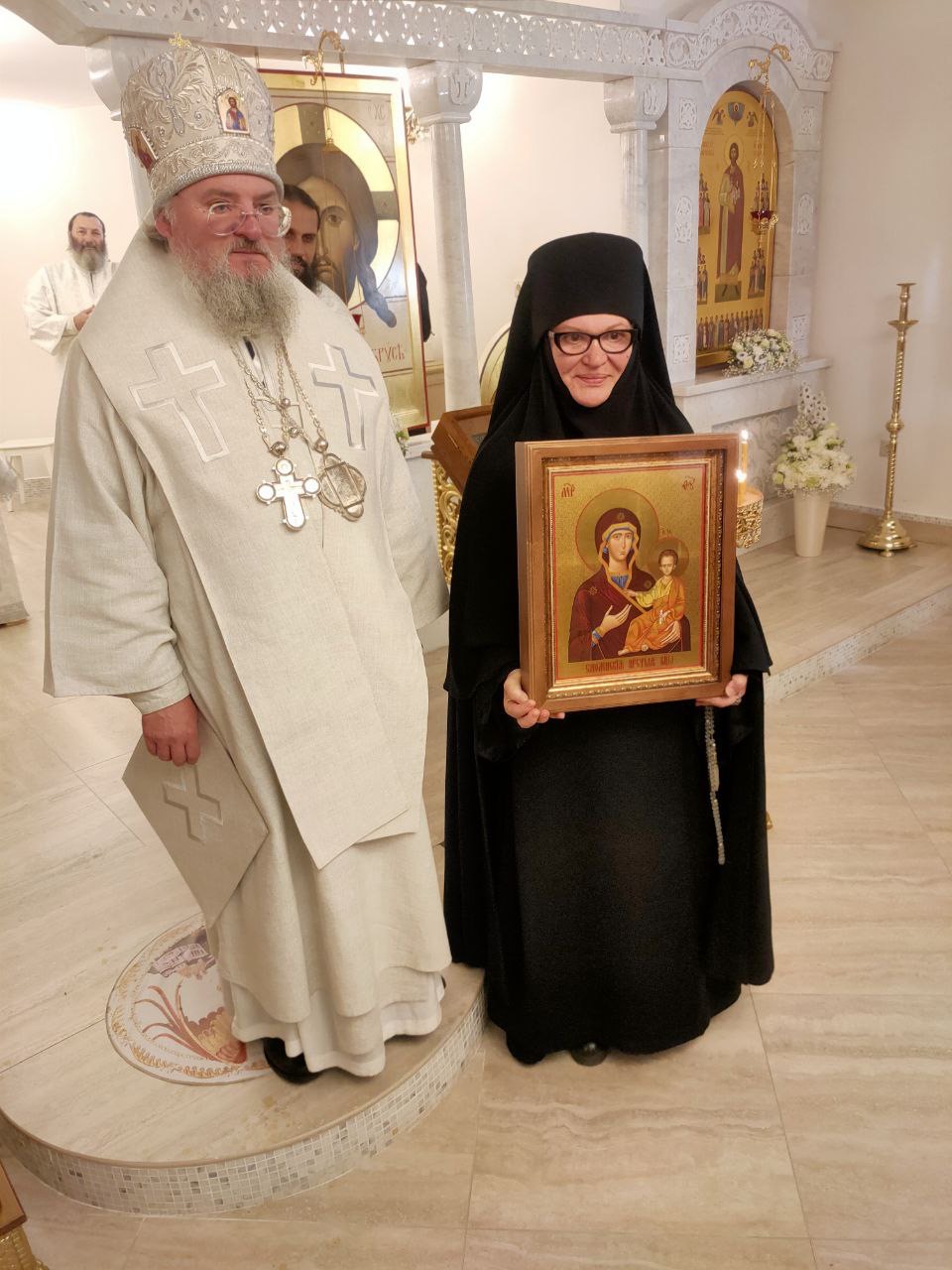 Владыка также вручил матушке Иоанне благодарственную Архиерейскую грамоту и преподнес ей Смоленскую икону Пресвятой Богородицы, а также святую просфору.