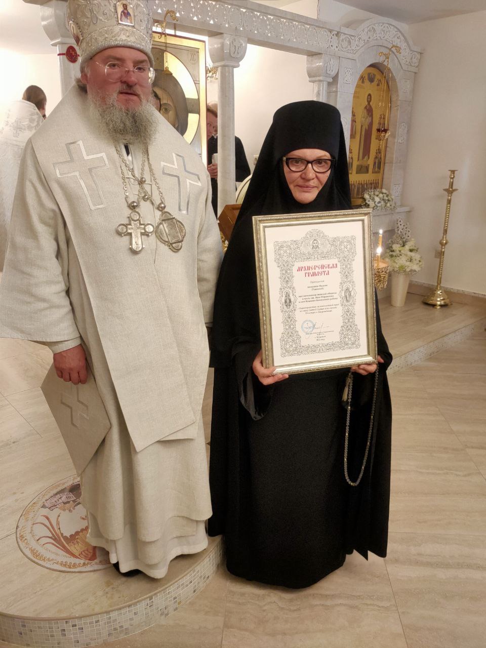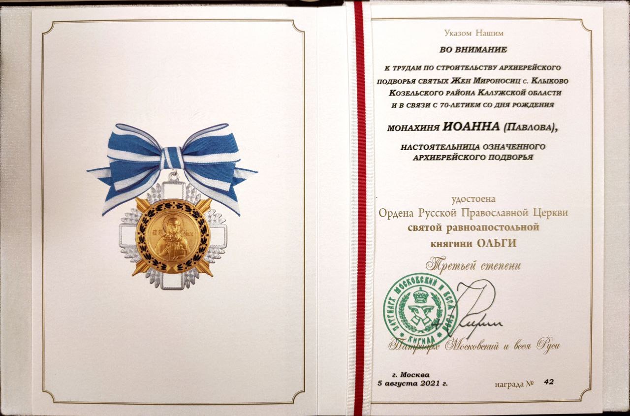 Во внимание к усердным трудам в устроении Архиерейского подворья женской монашеской общины в честь святых Жен Мироносиц и в связи с семидесятилетием со дня рождения настоятельница подворья монахиня Иоанна (Павлова), по благословению Святейшего Патриарха Московского и всея Руси КИРИЛЛА, была удостоена ордена Русской Православной Церкви святой равноапостольной княгини Ольги.