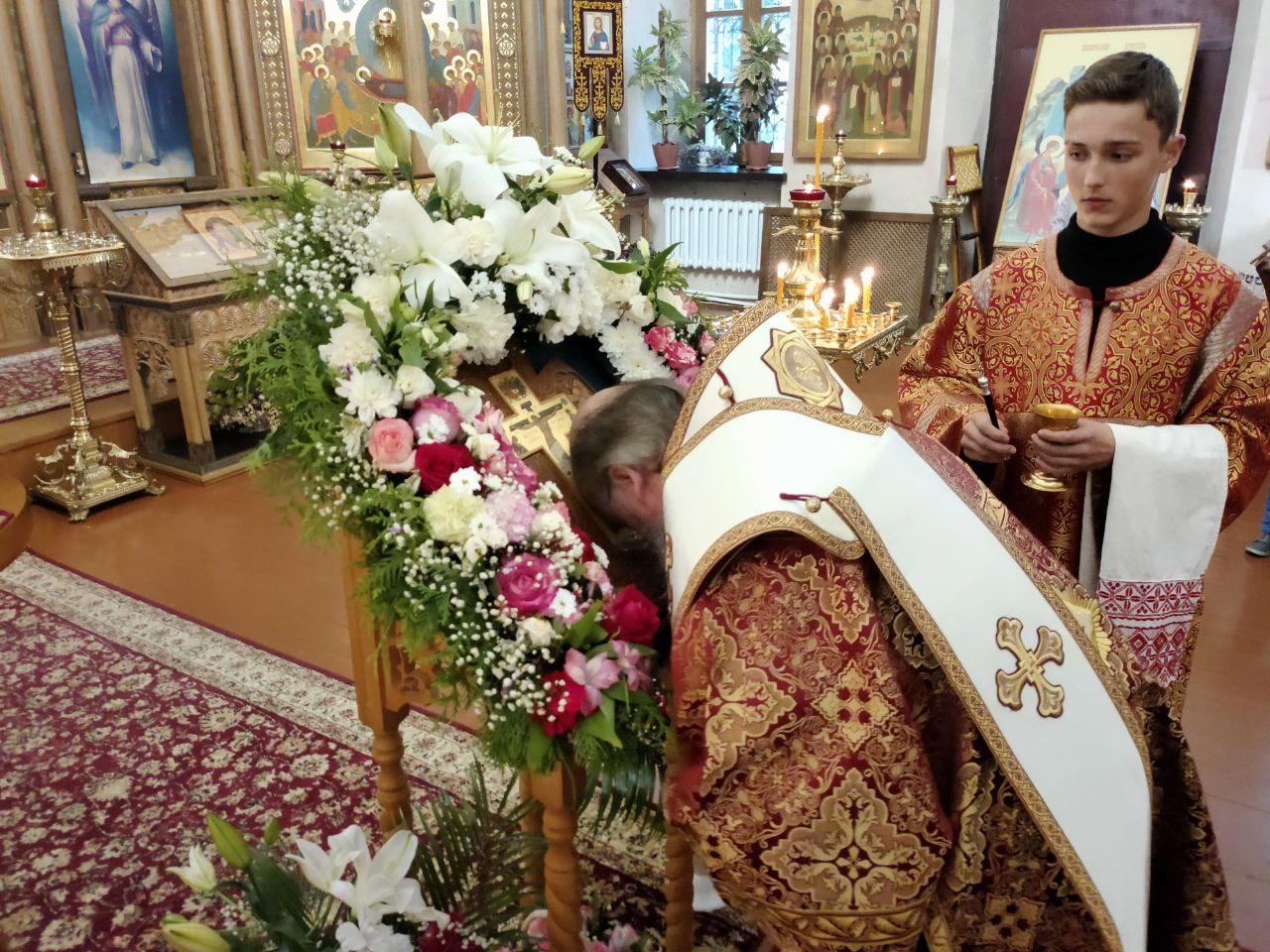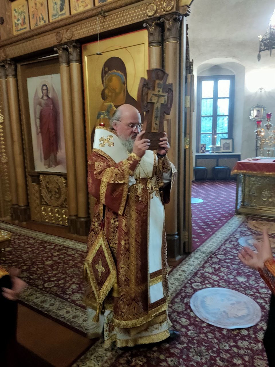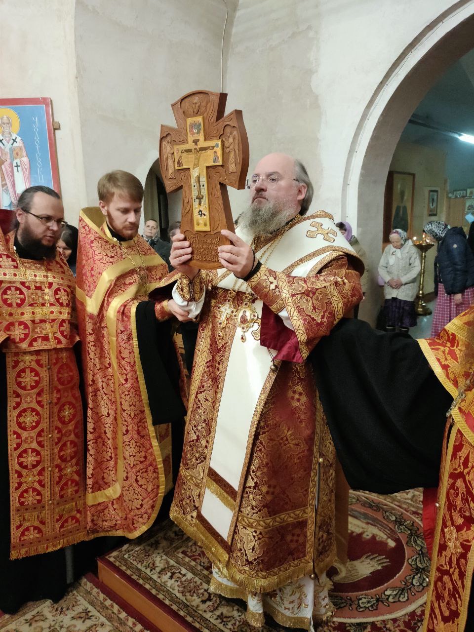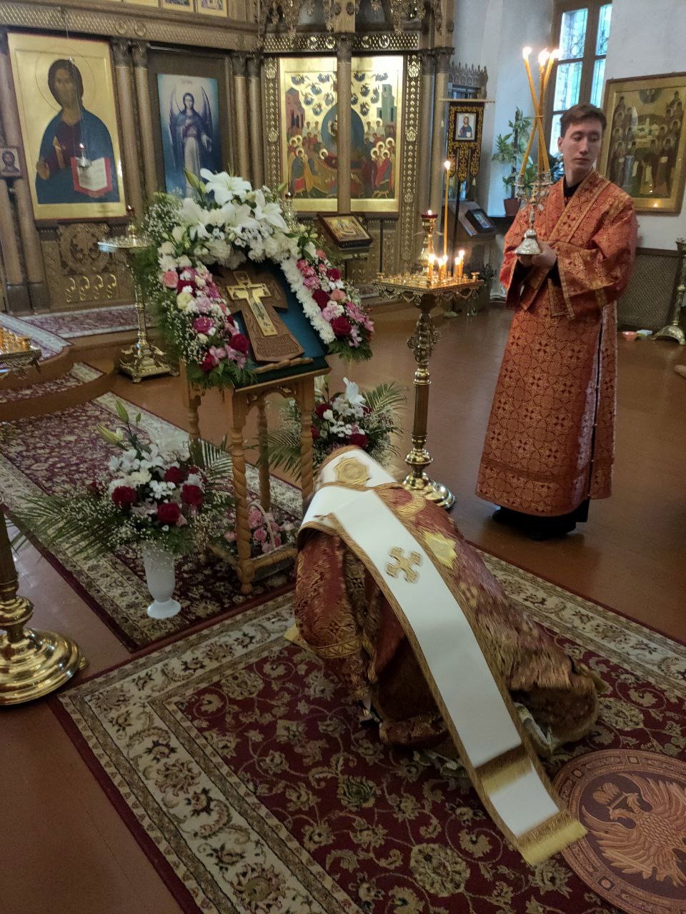 После великого славословия на утрени священнослужители совершили вынос и воздвижение Креста Господня.
