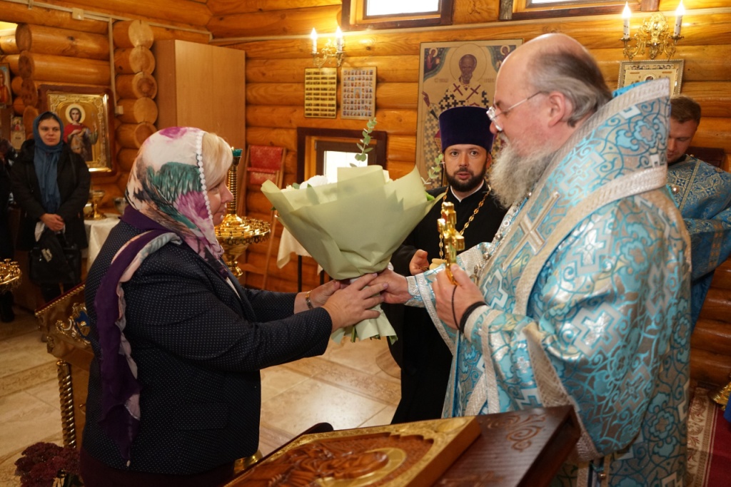 По окончании молебна архипастырь поблагодарил главврача больницы Светлану Алексеевну за труды и доброе отношение к храму и преподнёс ей букет цветов и святую просфору. Затем настоятель храма поздравил владыку и всех присутствующих с праздником и поблагодарил за совместную молитву. Воспитанники ДПИКЦ «Достояние» исполнили песнопения и прочитали стихотворения, посвященные Царице Небесной.