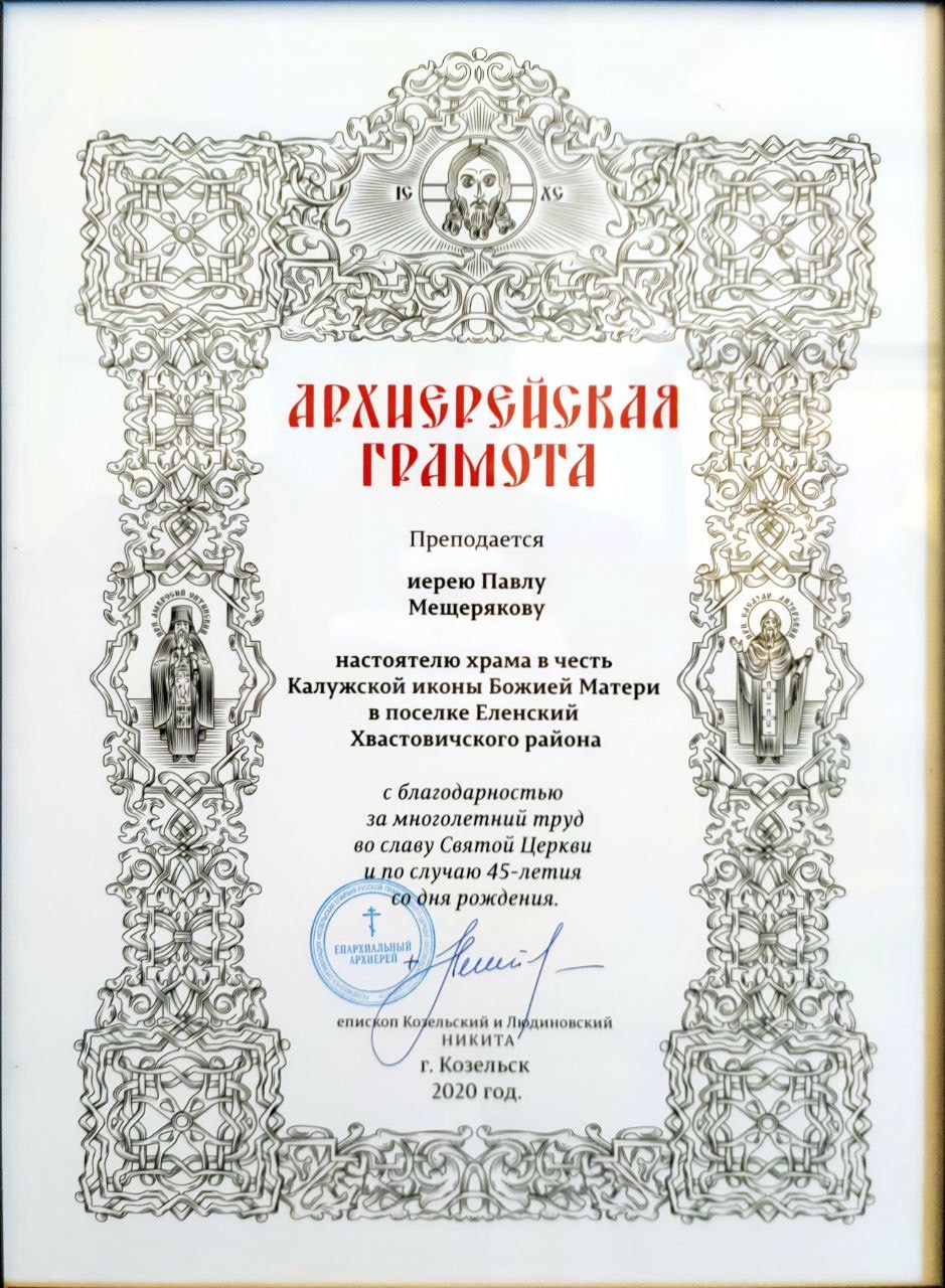 Владыка поздравил иерея Павла Мещерякова с сорокапятилетием со дня рождения и вручил ему благодарственную Архиерейскую грамоту.
