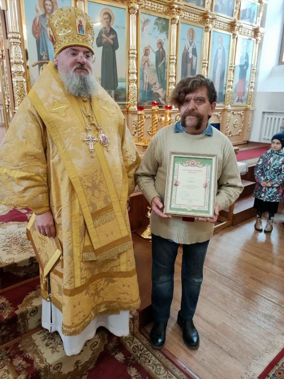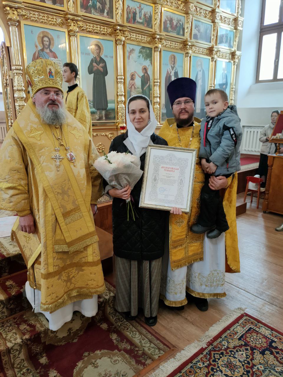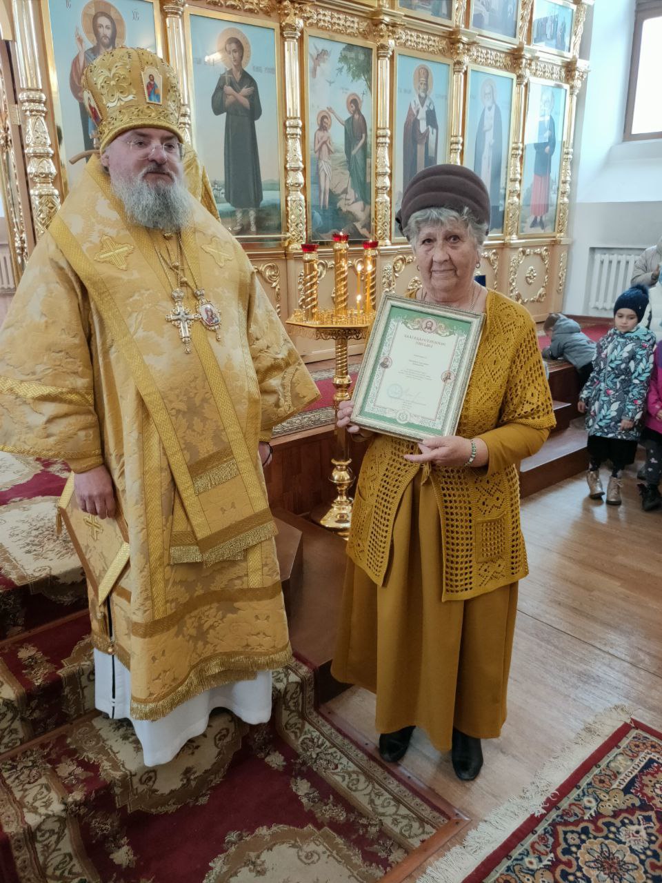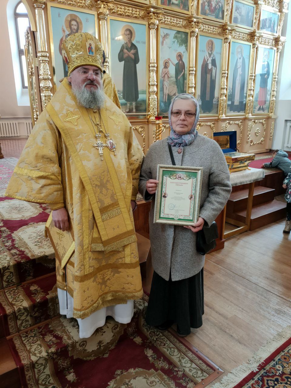 31 октября в Богоявленском храме города Козельска епископ Козельский и Людиновский Никита во внимание к многолетнему бескорыстному труду во славу Божию удостоил активных прихожан архиерейских Благодарственных грамот и писем. Архиерейская грамота была вручена Куваевой Анастасии Владимировне регенту храма за многолетний усердный труд и в связи с личной юбилейной датой. Благодарственные письма владыка вручил следующим прихожанам: монахине Иулиании (Прохоровой), монахине Вере (Самариной), Денисовой Людмиле Сергеевне, Даниной Марине Владимировне, Грибовой Светлане Викторовне, Ванифатьевой Татьяне Васильевне, Стёпиной Елене Александровне, Матвеевой Татьяне Ивановне, Бабиной Любови Владимировне и Дорохову Андрею Марковичу. Архипастырь поздравил награжденных, пожелал им Божией помощи в их трудах по заботе о храме Божием, здоровья и долголетия.