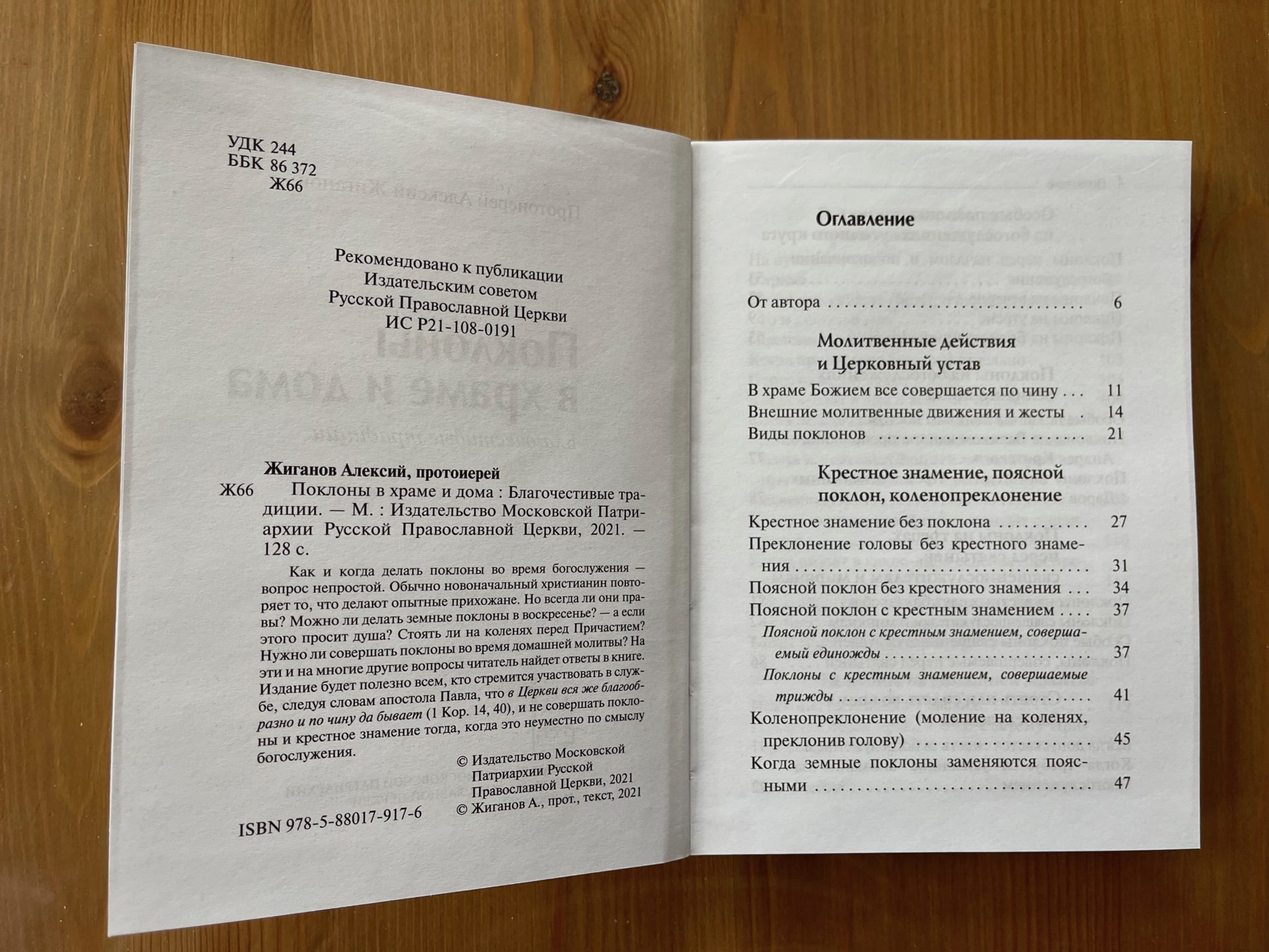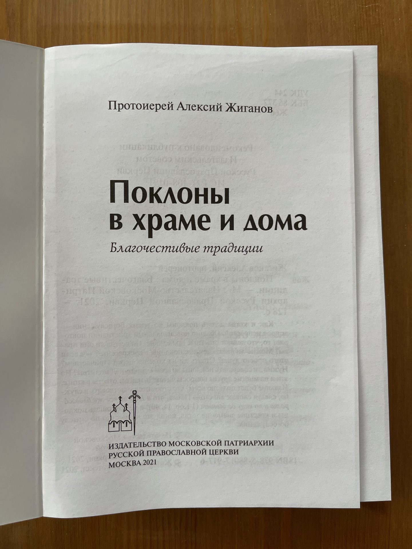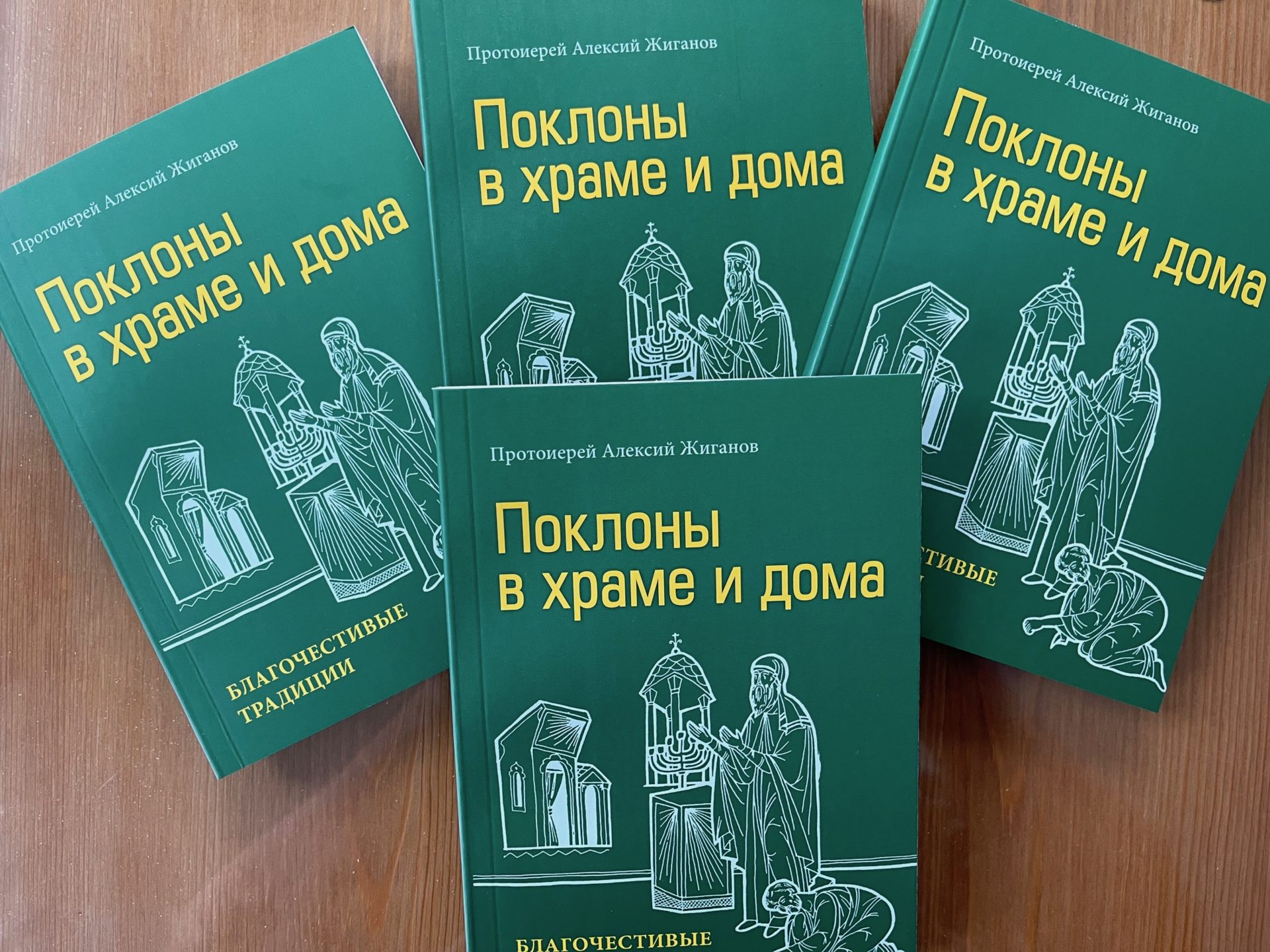 В Издательстве Московской Патриархии вышла в свет книга протоиерея Алексия Жиганова настоятеля Казанского собора города Людиново Козельской епархии:  Поклоны в храме и дома. Благочестивые традиции. Как и когда делать поклоны во время богослужения − вопрос непростой. Обычно новоначальный христианин повторяет то, что делают опытные прихожане. Но всегда ли они правы? Можно ли делать земные поклоны в воскресенье? − а если этого просит душа? Стоять ли на коленях перед причастием? Нужно ли совершать поклоны во время домашней молитвы? На эти и на многие другие вопросы читатель найдет ответы в книге. Издание будет полезно всем, кто стремится участвовать в службе, следуя словам апостола Павла, что в Церкви вся же благобразно и по чину да бывает (1 Кор. 14,40), и не совершать поклоны и крестное знамение тогда, когда это неуместно по смыслу богослужения.