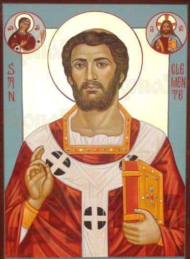 Священномученик Климент — Апостол от 70-ти, четвертый епископ Рима родился в очень знатной семье, состоявшей в родстве с императорской фамилией. Будучи разлучен в младенчестве с родителями и братьями, он вырос среди чужих людей. Как и все знатные римские юноши, Климент получил блестящее образование, но светские науки его не увлекали. Едва став совершеннолетним, он покидает Рим. В Святую Землю, в Палестину, где жил и страдал Христос и проповедуют его Апостолы — вот куда влечет юного Климента. Приехав в Александрию, он слушает проповеди ученого благовестника Варнавы и становится горячим приверженцем нового учения. По прошествии некоторого времени Климент в своих странствованиях встречает апостола Петра, принимает от него святое крещение, становится одним из его ближайших учеников (Филипп IV. 3). Евангельская проповедь помогла Клименту чудесным образом обрести свою семью, которую он считал погибшей: среди учеников первоверховного апостола оказываются два его брата-близнеца, чуть позже он находит родителей. Надо ли говорить, что вся семья после этого приняла христианство и стала проповедовать спасительное учение. Незадолго до своей мученической кончины апостол Петр рукополагает Климента во епископа. После смерти святого Петра, святого Лина и святого Анаклета, с 92 по 101 год Римским епископом является апостол Климент. Добродетельная жизнь и святительский подвиг Климента являли благотворный пример для гордых римских граждан, многие из которых стали последователями Христа. Житие священномученика сохранило нам пример того, как однажды на праздник Пасхи после проповеди апостола крестилось сразу 424 человека, среди которых были представители всех римских сословий — от рабов до членов императорской семьи. Обеспокоенные успехами христианского иерарха, язычники донесли о нем императору Траяну, обвинив святителя в неуважении к римским богам. Разгневанный император велит изгнать Климента из столицы, приговорив его к ссылке. Многие из учеников апостола последовали за ним в Инкерманские каменоломни, находящиеся недалеко от Херсонеса Таврического, предпочитая добровольную ссылку разлуке с духовным отцом. Инкерманские каменоломни были традиционным местом ссылки христиан. Нелегкая жизнь подвижников была особенно тяжела из-за отсутствия питьевой воды. По молитве святителя Климента, Ангел Господень, явившийся в виде Агнца, указывает место источника. Это чудо привлекло к святителю Клименту множество людей. Слушая ревностного проповедника, сотни язычников обращались ко Христу. Каждый день крестилось по пятьсот и более человек. Там же в каменоломнях был вырублен храм, в котором он проповедовал. В 101 году священномученик Климент был умерщвлен по приказу императора; его утопили, бросив в море с грузом на шее. Климент прославился многими чудесами, череда которых не прекратилась и после его кончины. По молитвам его верных учеников — Корнилия и Фивы и всего христианского населения Херсонеса море отошло, и они нашли на дне, в нерукотворной «Ангельской » церкви нетленное тело своего учителя. После этого каждый год в день мученической кончины Климента море отступало и в течение семи дней люди молились у мощей праведника. Так было до начала IX века. В это время мощи стали недоступны, море не отступало. В начале 60-х годов IX века мощи чудесным о