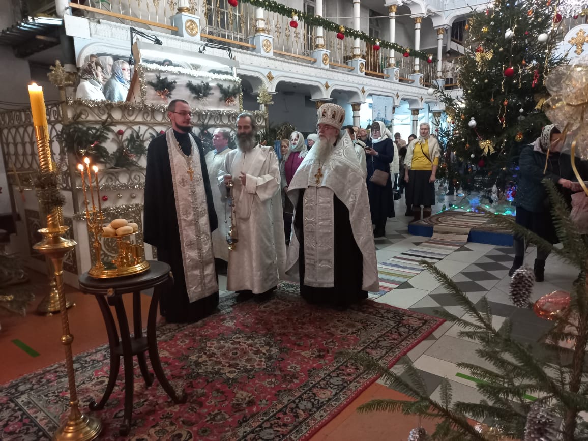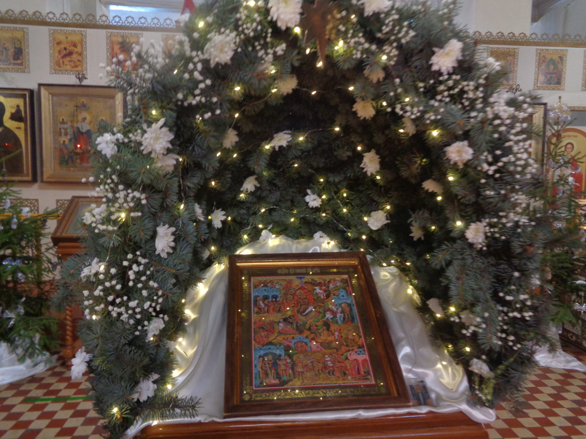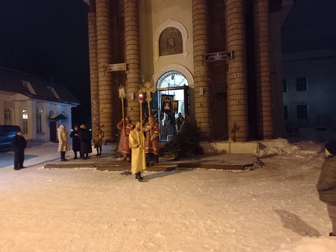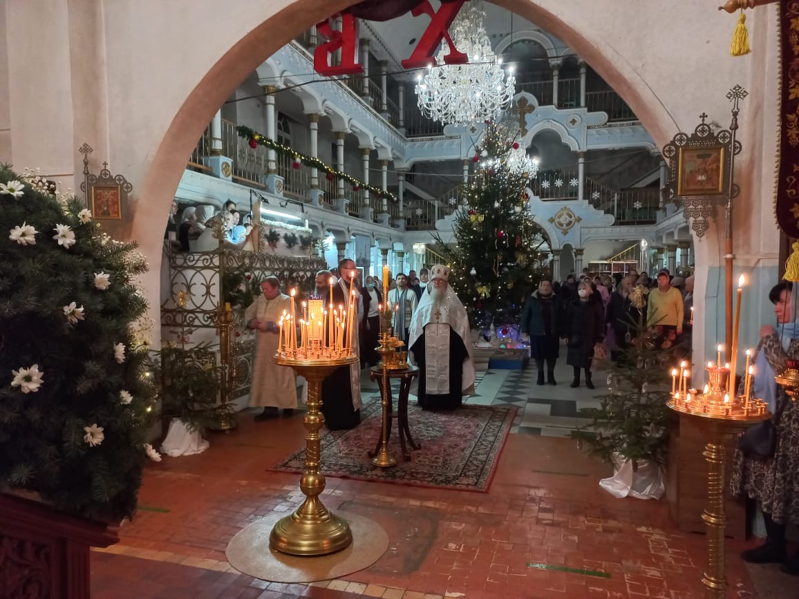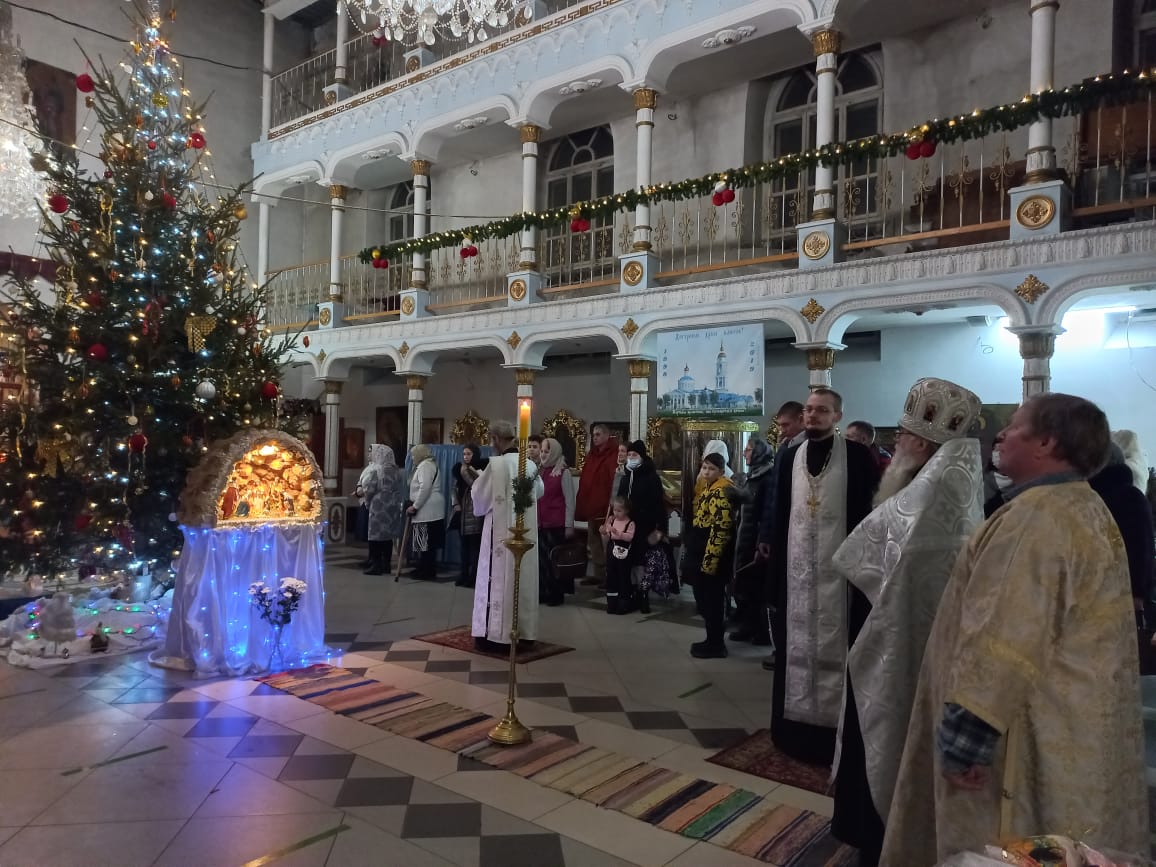 Рождественские торжества в Казанском соборе города Людиново начались праздничным всенощным бдением, которое вечером 6 января возглавил настоятель собора протоиерей Алексий Жиганов в сослужении клириков храма иерея Алексия Сначева и диакона Андрея Соколова. Во время полиелея на утрене духовенство в центре храма пред иконой Рождества пропело величание праздника, после чего было прочитано Евангельское зачало от Матфея, повествующее о рождении в мир Спаса Христа. Затем прихожане храма приложились к праздничному образу и помазались освященным елеем.  После вечернего богослужения, по доброй местной традиции Казанского собора, был совершен крестный ход вокруг храма с пением тропаря праздника. 7 января, в полночь, в Казанском соборе совершилась праздничная Божественная литургия. В храме к этому часу было особенно торжественно. Радость переполняла сердца людей, пришедших в эту светозарную ночь прославить родившегося Младенца Христа в главный храм города. Перед началом Божественной литургии протоиерей Алексий Жиганов огласил Рождественское послание Святейшего Патриарха Московского и всея Руси Кирилла архипастырям, пастырям и всем верным чадам Русской Православной Церкви, и Рождественское послание Преосвященнейшего Никиты, епископа Козельского и Людиновского. По окончании богослужения традиционно настоятель пригласил прихожан прославить Богомладенца пением колядок и Рождественских стихов. Самые смелые и подготовленные получили от настоятеля сладкие подарки.