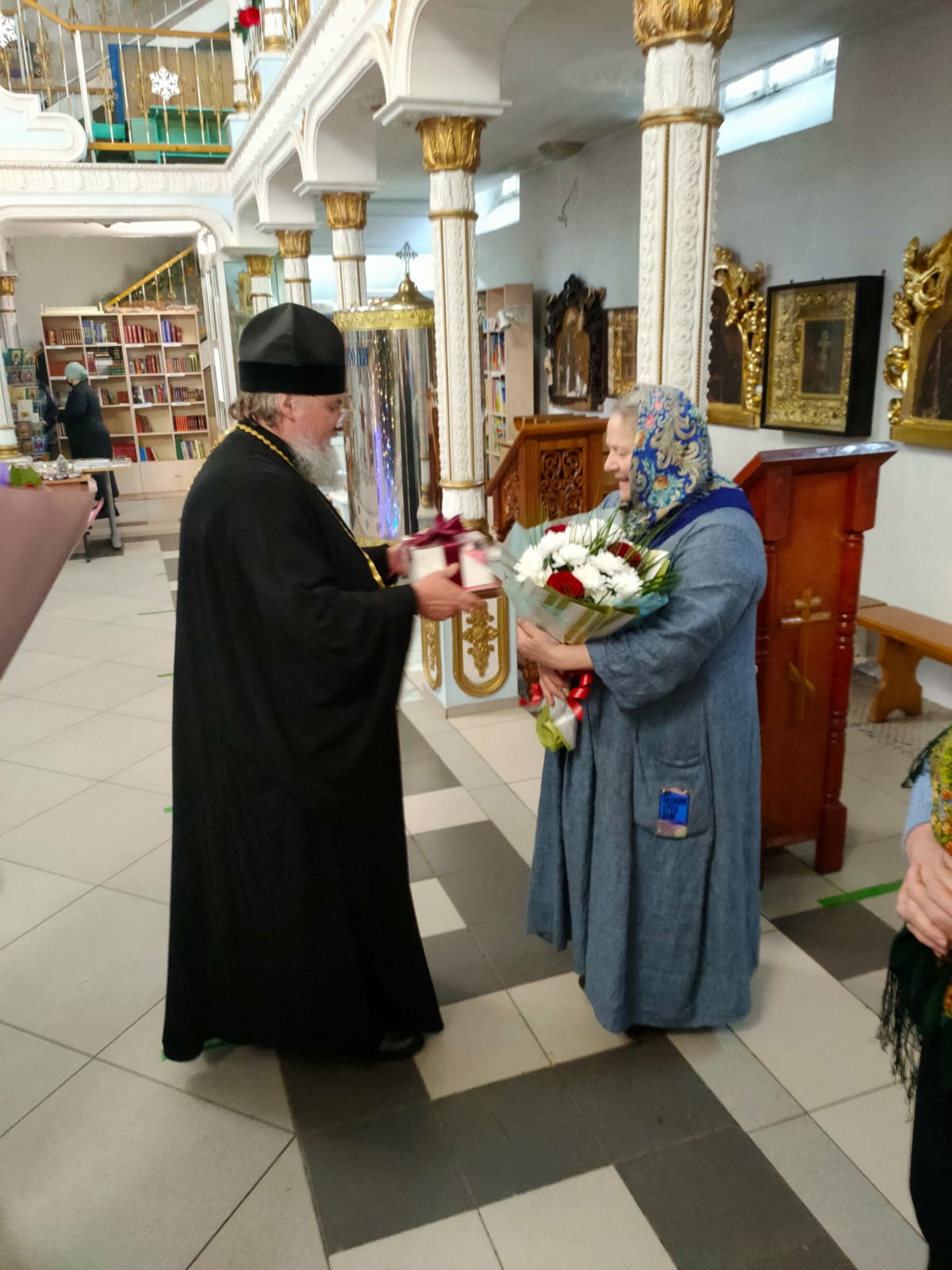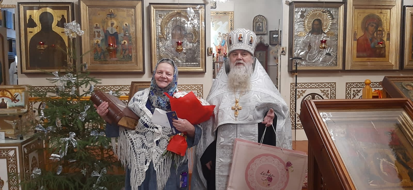 Батюшка подарил Ольге Дмитриевне цветы и преподнес на молитвенную память подарочное издание Библии. Отец Алексий поблагодарил старосту за труды и пожелал ей крепкого здоровья и духовной мудрости.