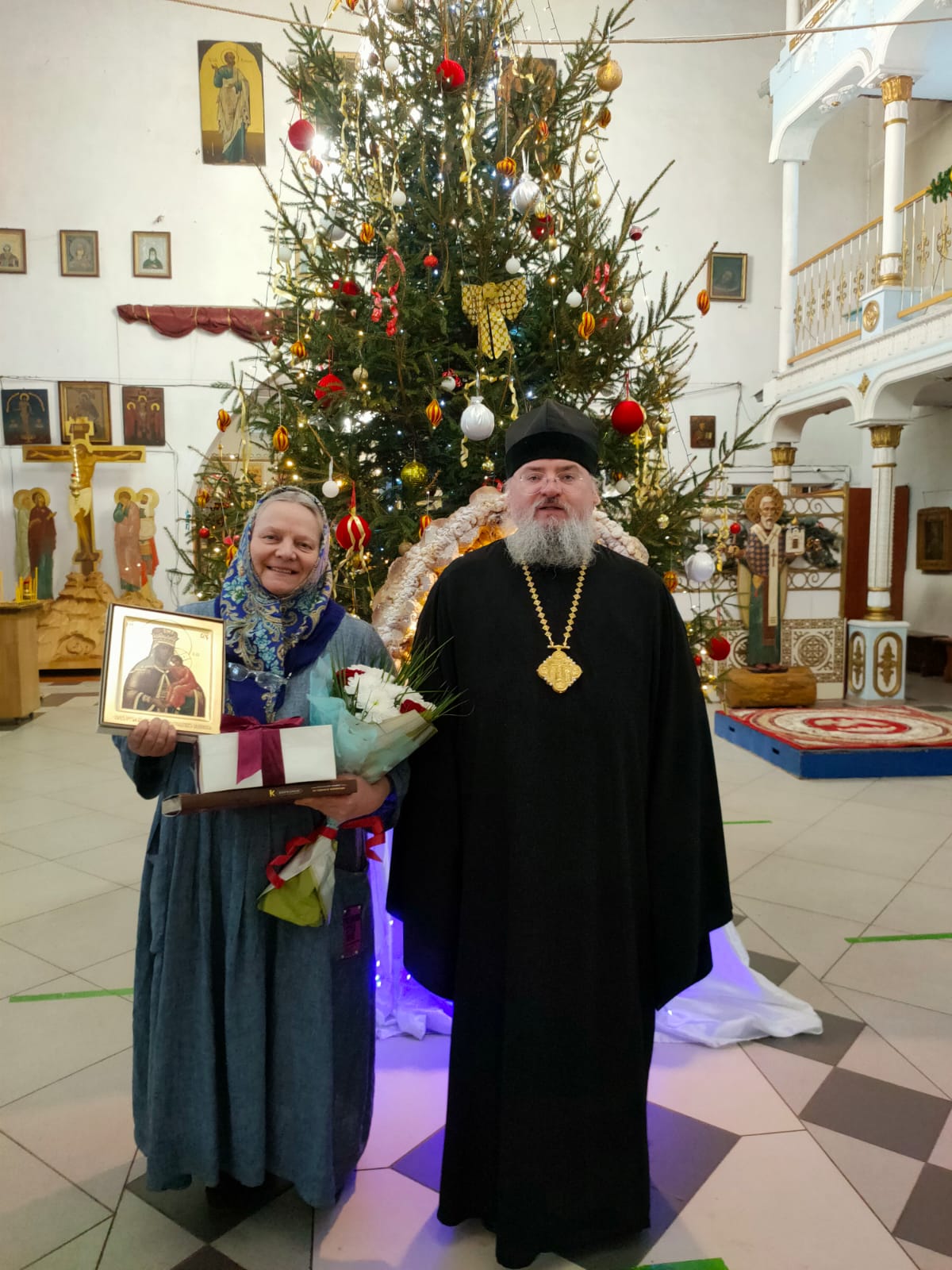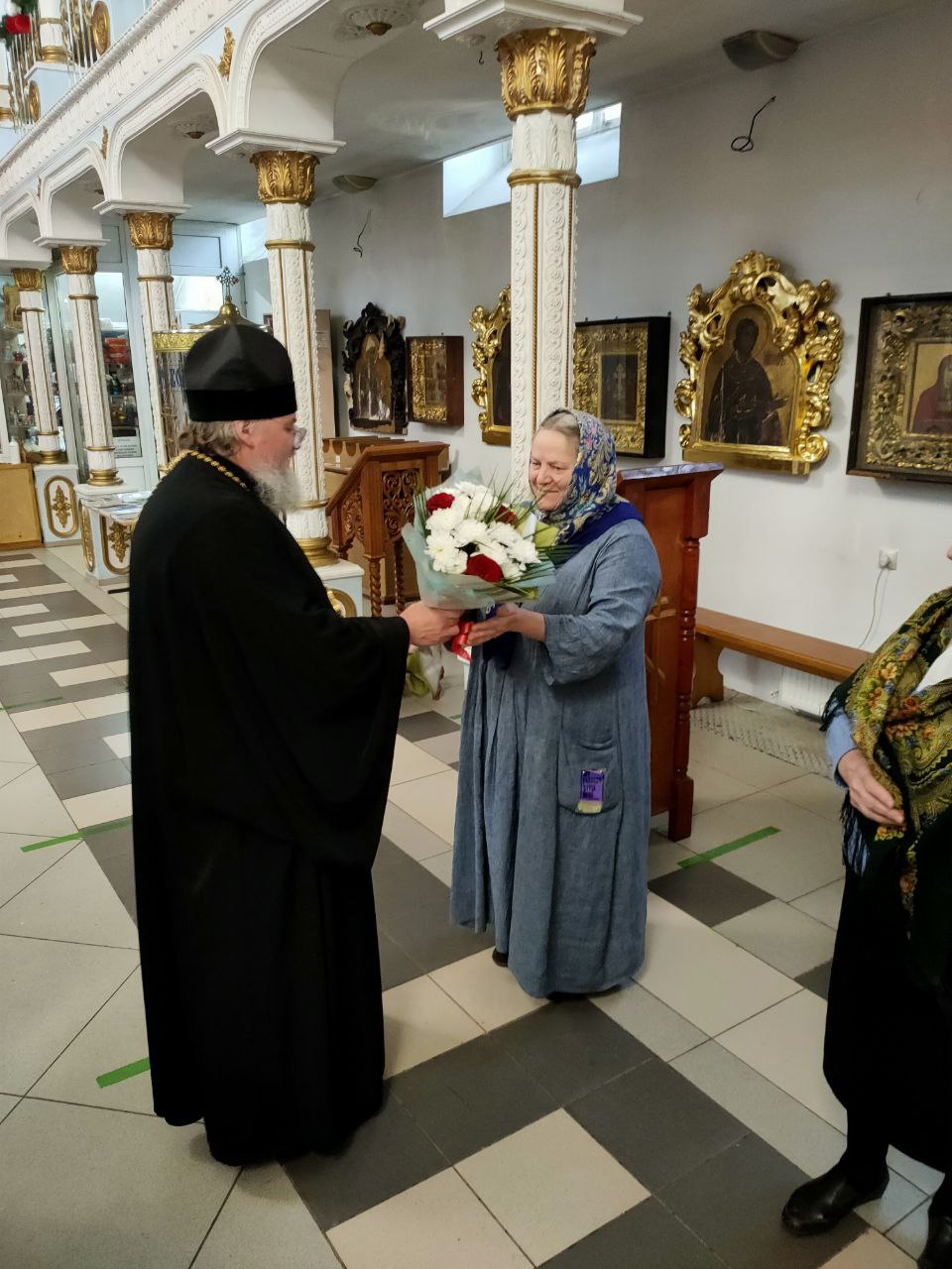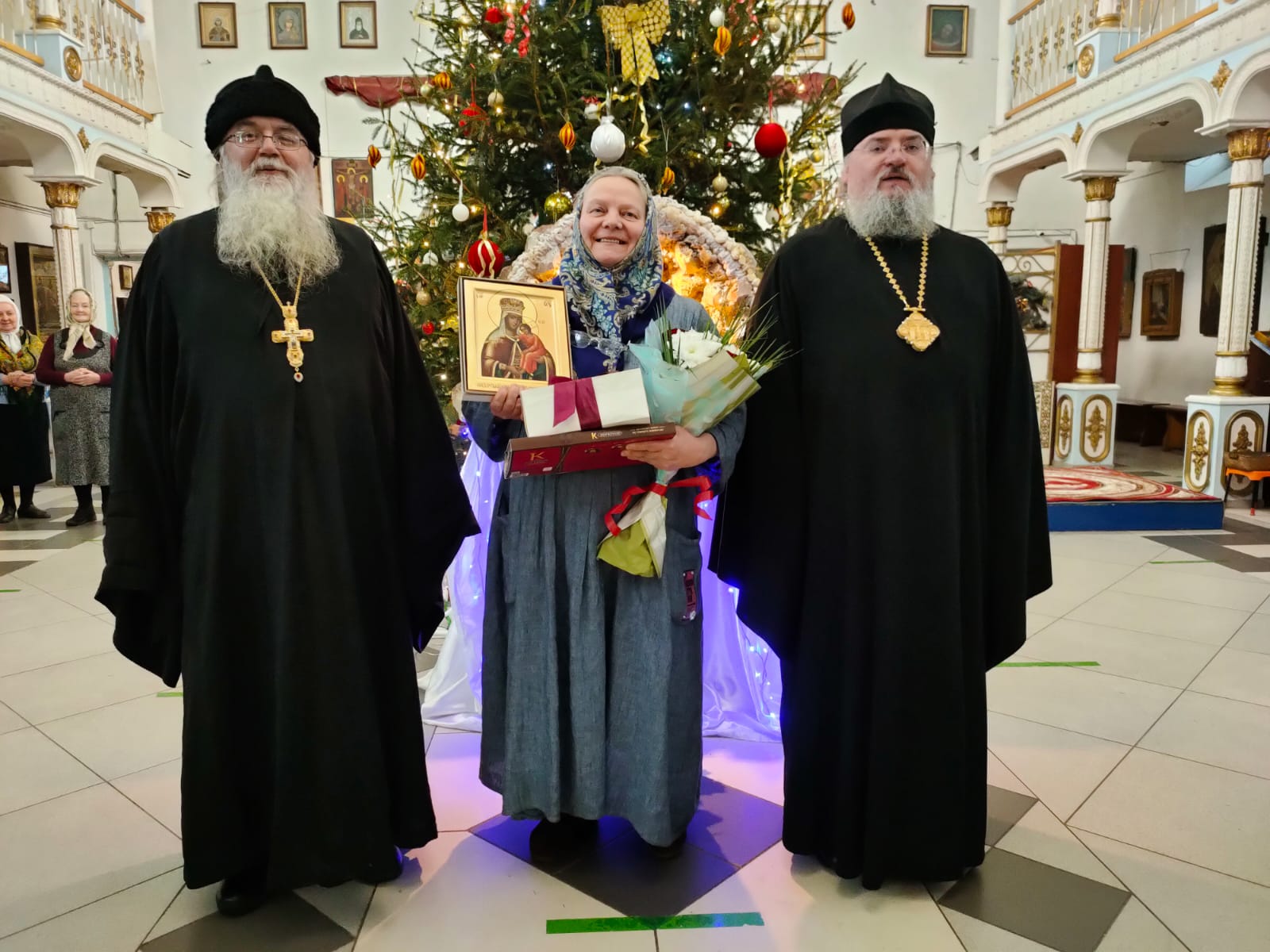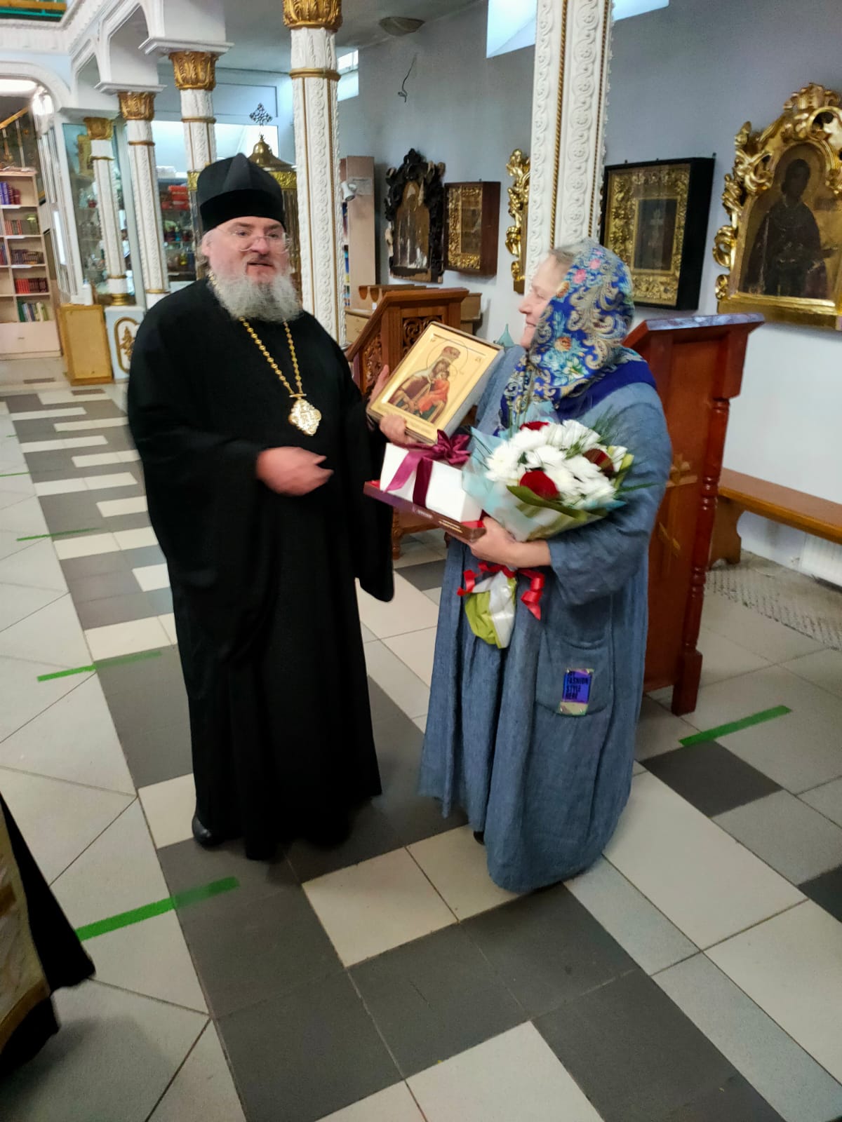 Его Преосвященство преподнес в дар Ольге Дмитриевне икону Божией Матери, именуемой «Людиновская», букет цветов и сладкие подарки; тепло и от души пожелав и дальше достойно нести послушание старосты в Казанском соборе, во всем помогая приходу и настоятелю, отцу Алексию.