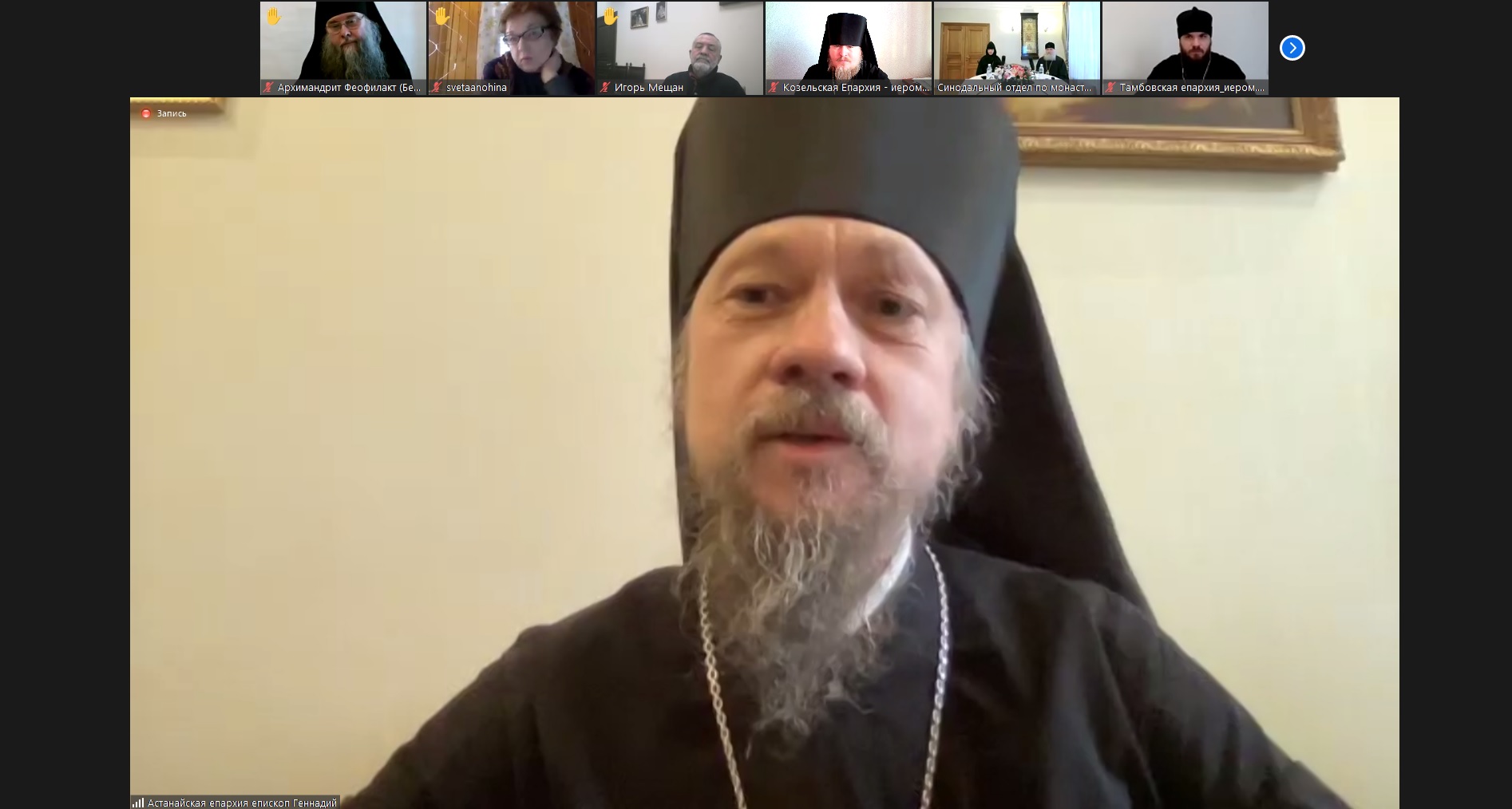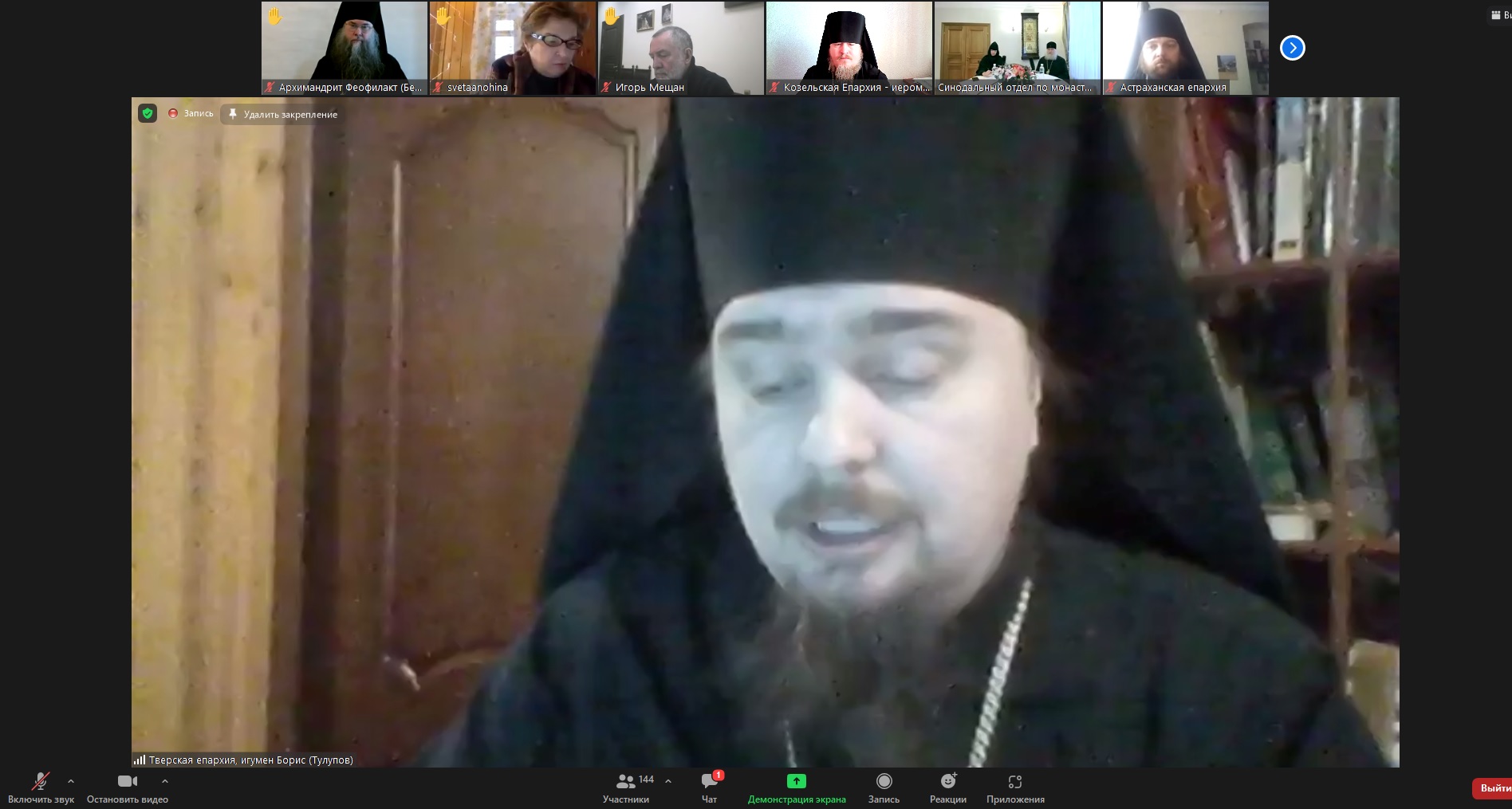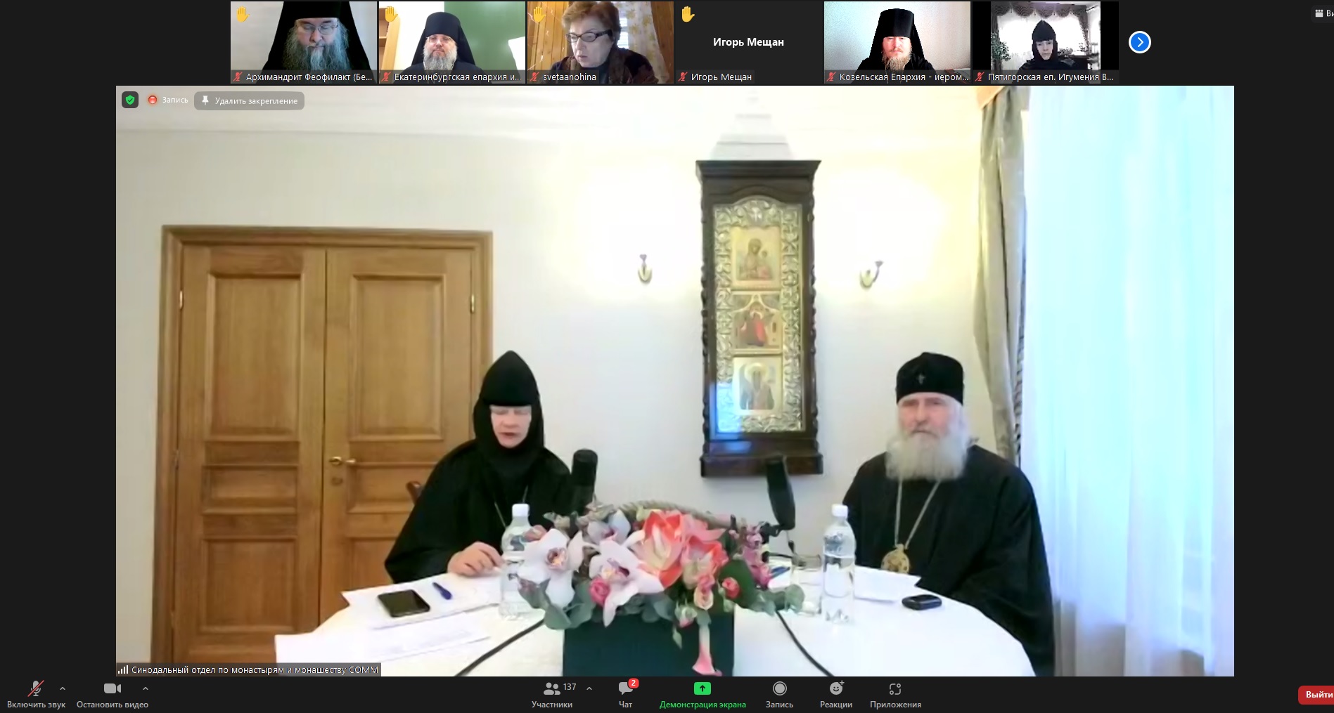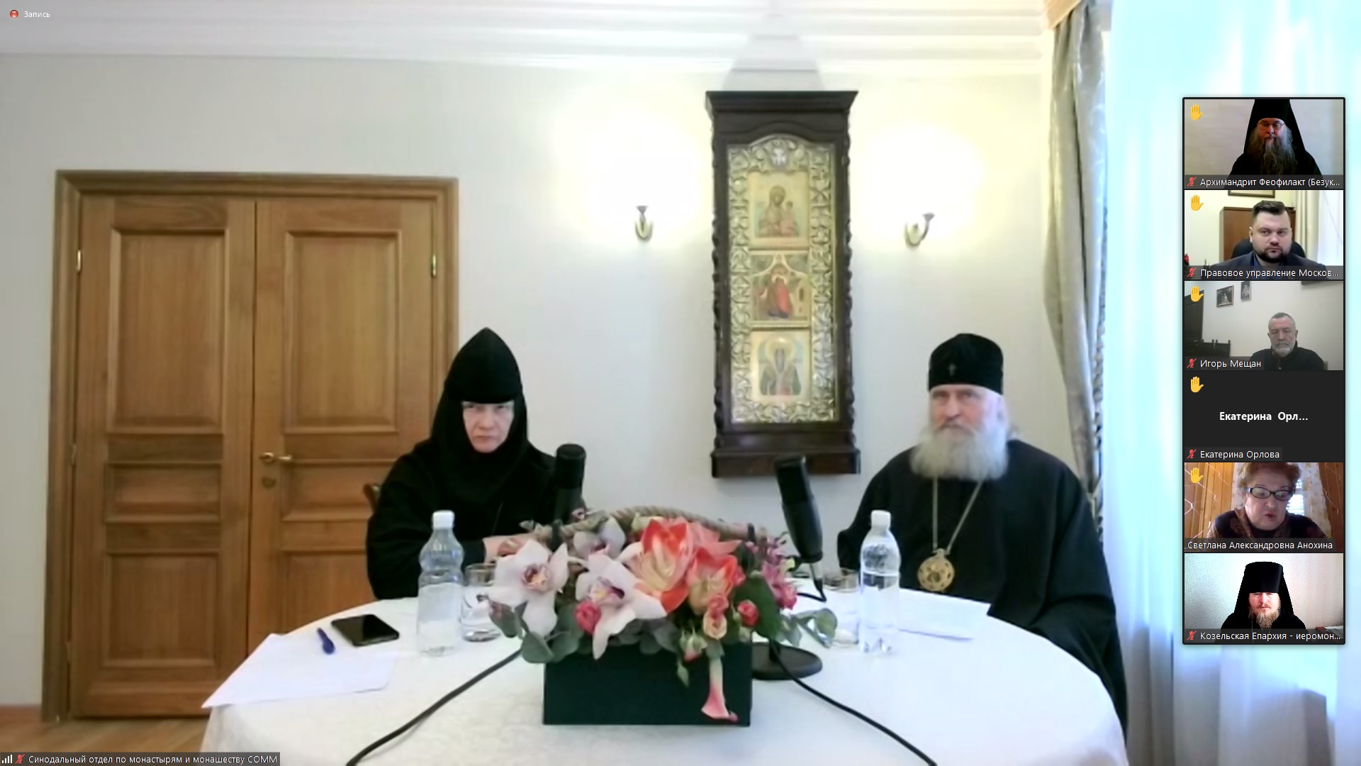 Синодальный отдел по монастырям и монашеству Русской Православной Церкви провел очередное собрание с участием епархиальных ответственных за монастыри. Собрание было организовано в формате видеоконференции. В Зачатьевском ставропигиальном женском монастыре Москвы на связи с участниками находились председатель Синодального отдела по монастырям и монашеству митрополит Каширский Феогност, наместник Донского ставропигиального мужского монастыря Москвы, и заместитель председателя СОММ, настоятельница Зачатьевской обители игумения Иулиания (Каледа).