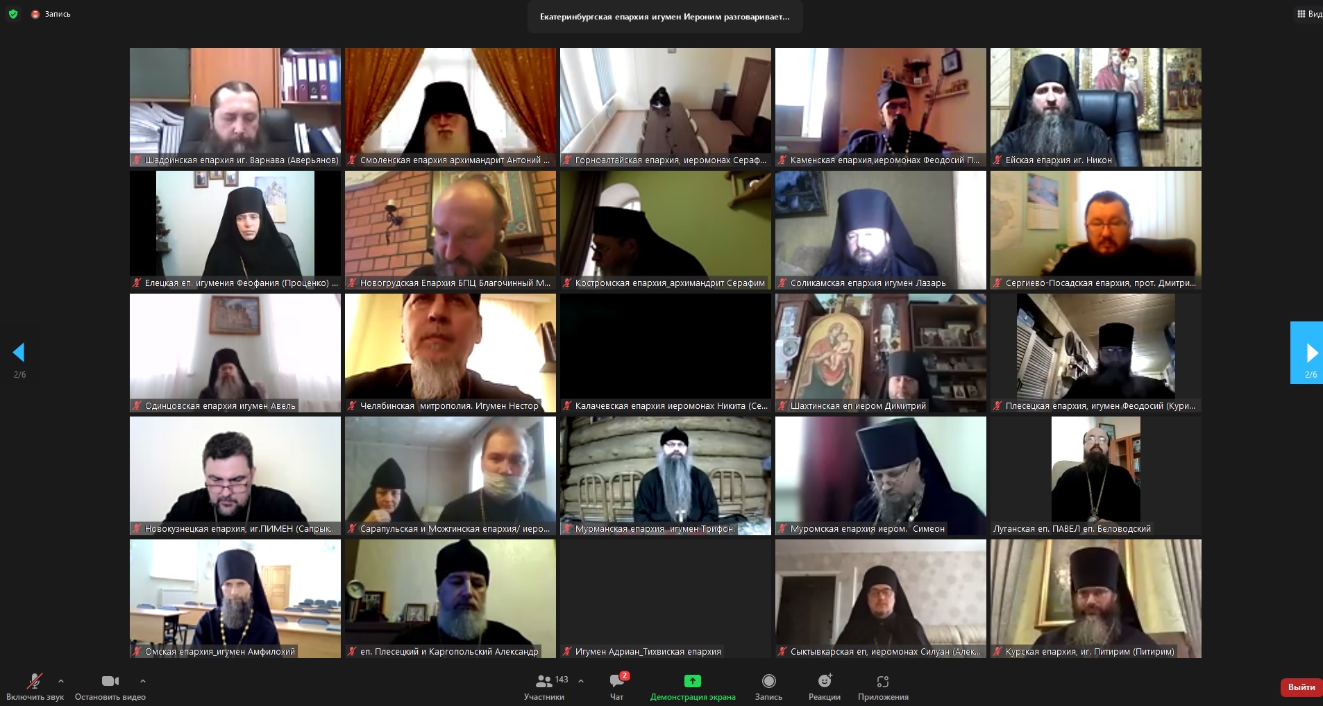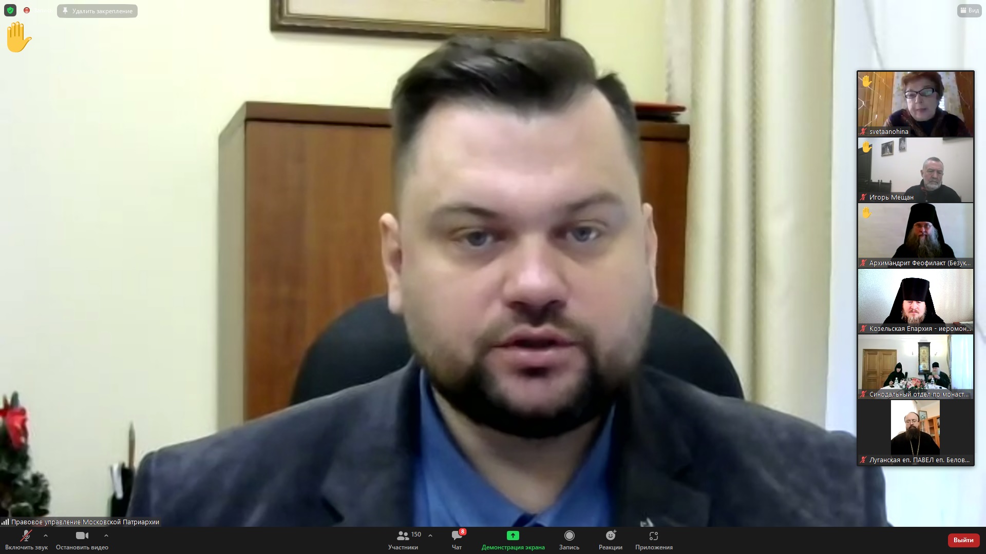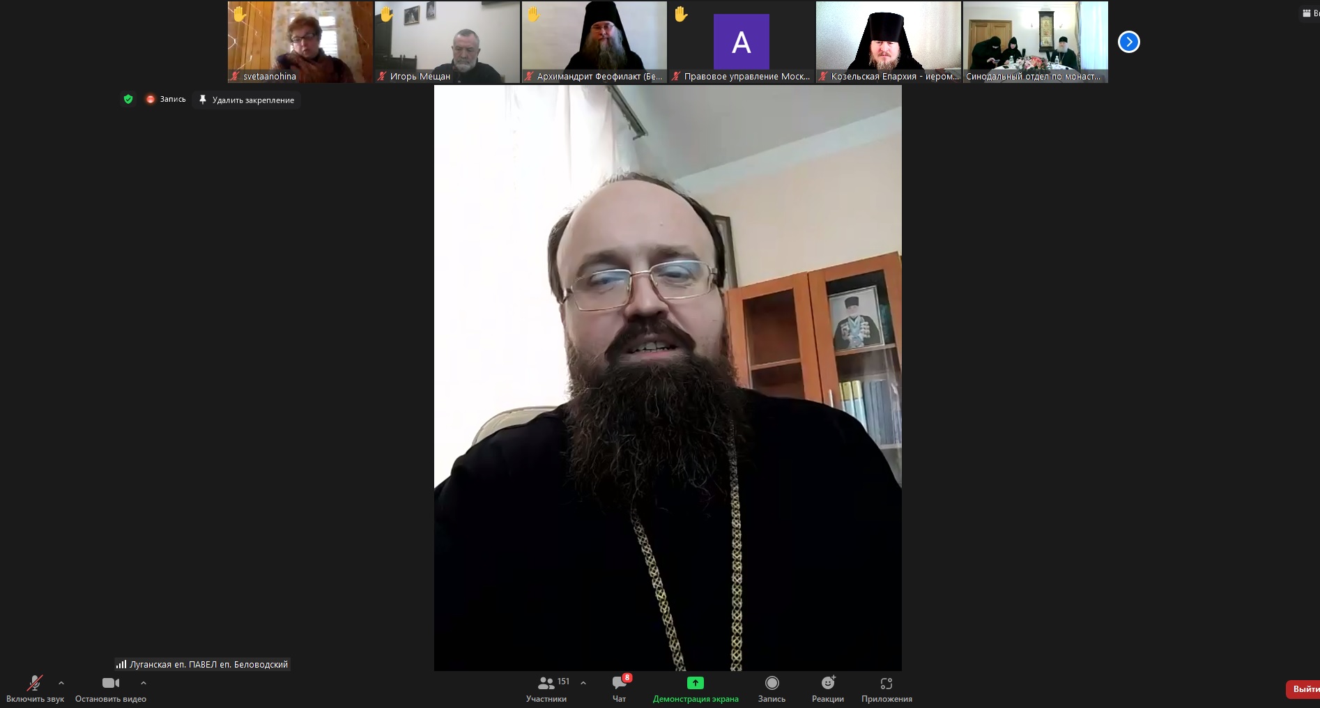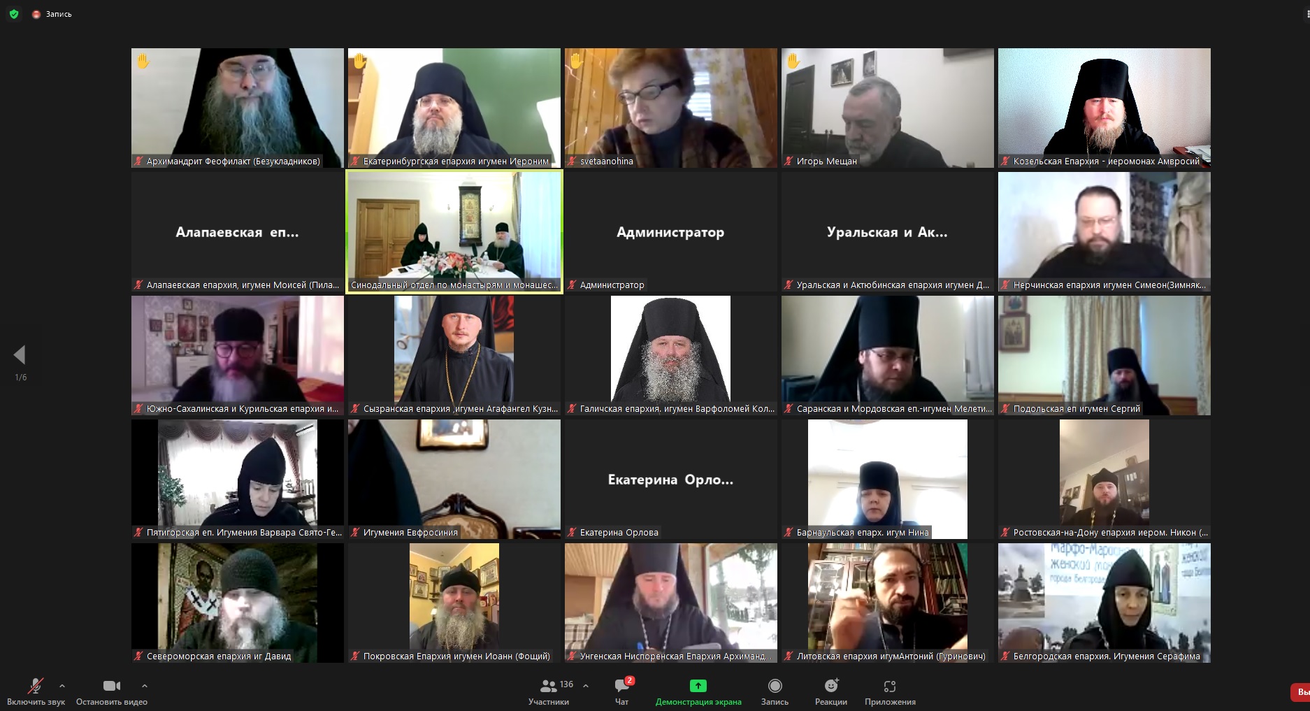 Синодальный отдел по монастырям и монашеству Русской Православной Церкви провел очередное собрание с участием епархиальных ответственных за монастыри. Собрание было организовано в формате видеоконференции. В Зачатьевском ставропигиальном женском монастыре Москвы на связи с участниками находились председатель Синодального отдела по монастырям и монашеству митрополит Каширский Феогност, наместник Донского ставропигиального мужского монастыря Москвы, и заместитель председателя СОММ, настоятельница Зачатьевской обители игумения Иулиания (Каледа).