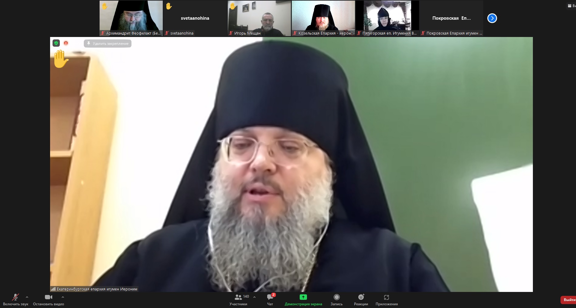 С сообщением о круглом столе «Добродетели как средоточие монашеского подвига», прошедшем 14 декабря 2021 года в Екатеринбургской митрополии, выступил игумен Иероним (Миронов), наместник Свято-Николаевского Верхотурского мужского монастыря, благочинный монастырей Екатеринбургской епархии. Отец Иероним рассказал, что в форуме, состоявшемся по благословению Святейшего Патриарха Московского и всея Руси Кирилла, приняли участие не только представители Екатеринбургской митрополии, но архипастыри, игумены, игумении, монашествующие 16 епархий и 31 монастыря, расположенных в Уральском федеральном округе. Общее количество участников составило 389 человек. Приглашение поделиться своим видением того, каков может быть ответ монашествующих на вызовы современного мира принял митрополит Лимассольский Афанасий (Кипрская Православная Церковь). Оргкомитет по подготовке и проведению круглого стола возглавил митрополит Екатеринбургский и Верхотурский Евгений. Мероприятие проводилось в формате видеоконференции.