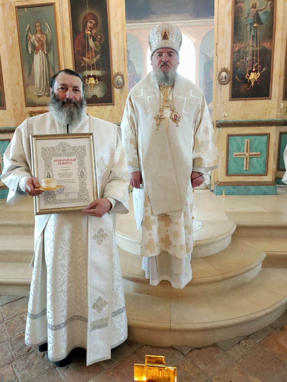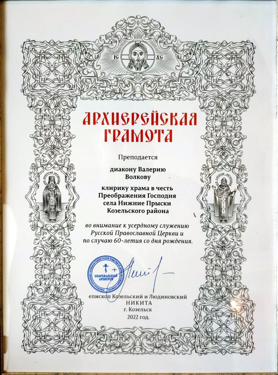 Во внимание к усердным трудам во славу Святой Церкви и в связи с шестидесятилетием со дня рождения штатный диакон храма Валерий Волков был удостоен благодарственной Архиерейской грамоты.