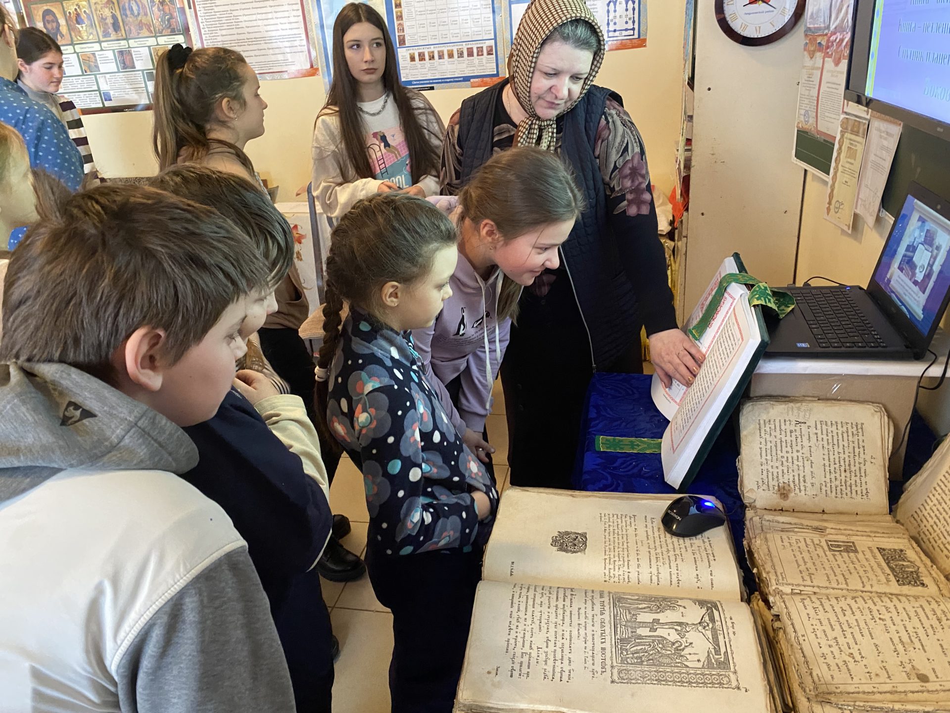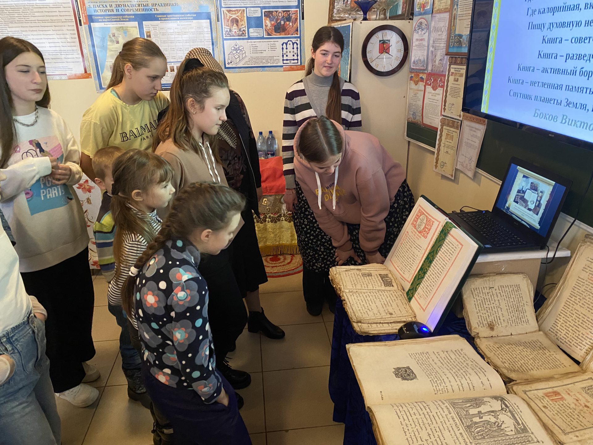 Так же рассказала о роли православной книги, о том, как нужно обращаться с книгой, особенно с православной, о значении духовной литературы в жизни православного человека и его духовном возрастании. С большим интересом дети рассматривали старинные богослужебные книги: Библию, Апостол, Часослов и Псалтирь, пробовали читать и старались понять о прочитанном.