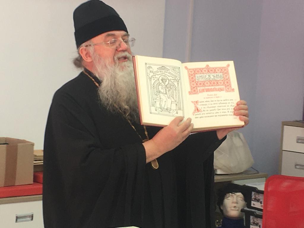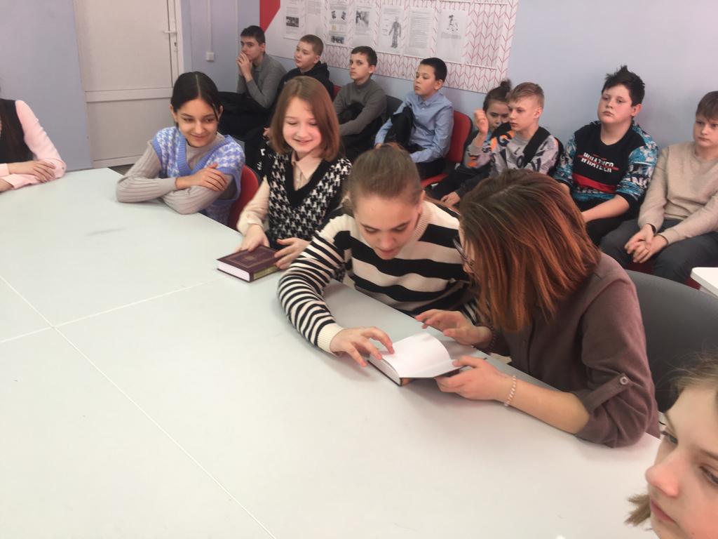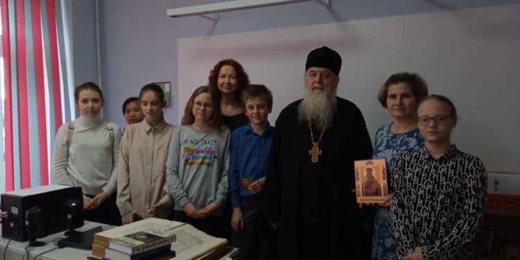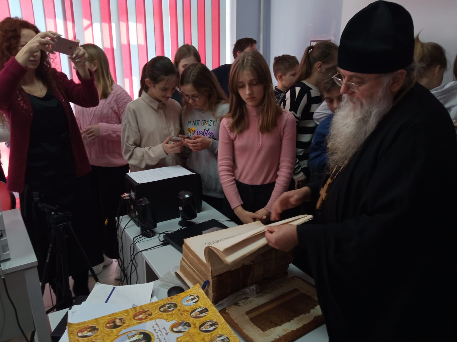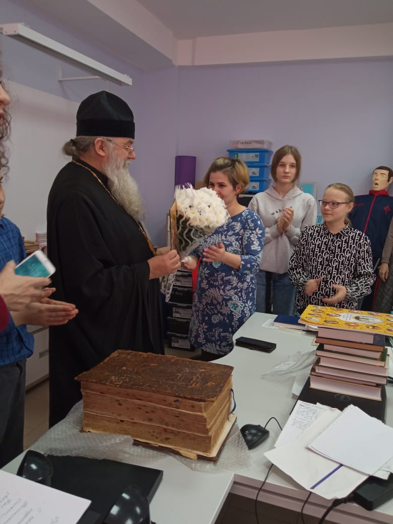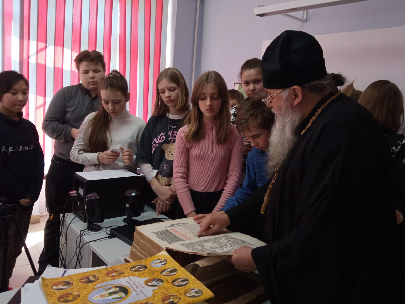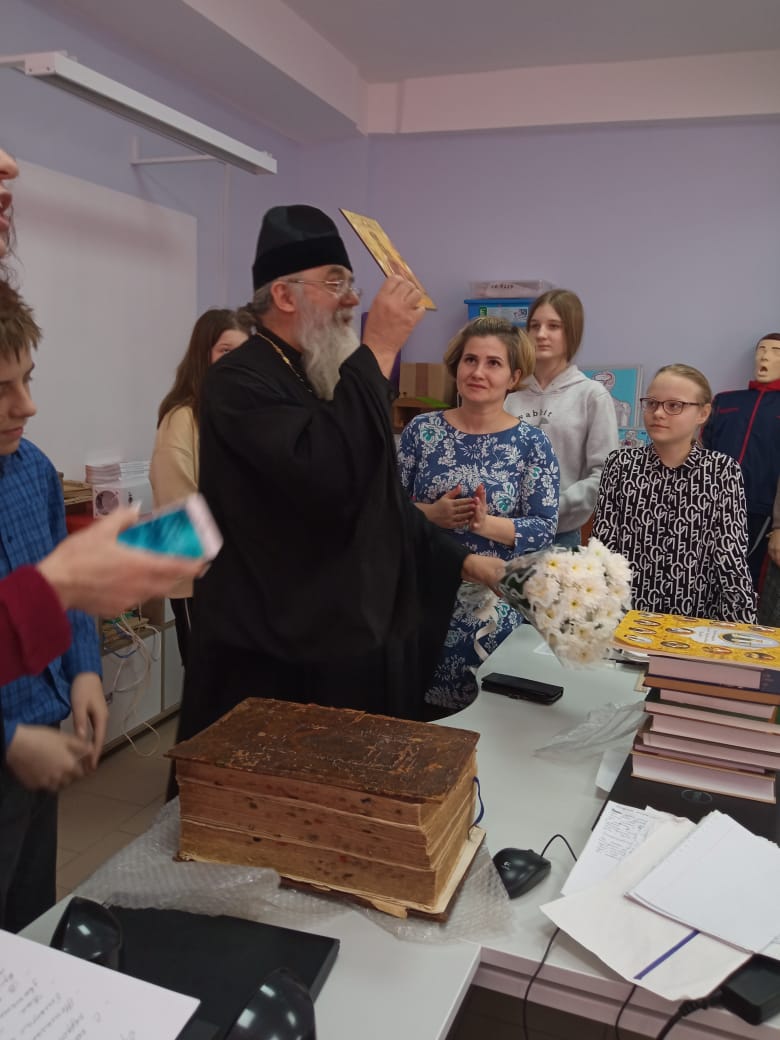Священник представил ученикам старинное издание «Толковое Евангелие» и Псалтирь, а также небольшие по размеру издания Евангелия, Библии, Закона Божия и молитвослова. Цель этой встречи была в том, чтобы показать подросткам, что и современный русский язык в своей исторической части имеет основой Священное Писание.