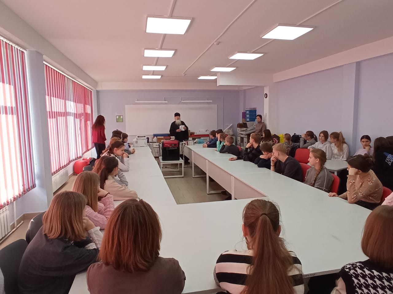 16 марта 2022 года настоятель Казанского собора города Людиново протоиерей Алексий Жиганов провел встречу с учащимися 6-х классов средней школы №1 города, приуроченную ко Дню православной книги.