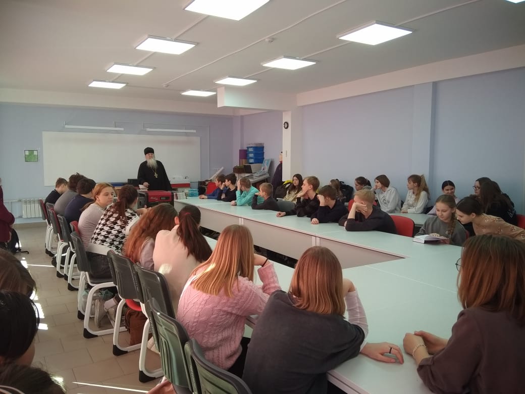 Батюшка рассказал ребятам и преподавателям о значении православной литературы в нашей жизни, о важности слова Божия. В своем выступлении отец Алексий обозначил, что в современном мире носителей информации множество, но ничто не может сравниться с книгой. Он особо подчеркнул важность православной книги и рассказал школьникам о том, в каком году и как появилось на Руси книгопечатание.
