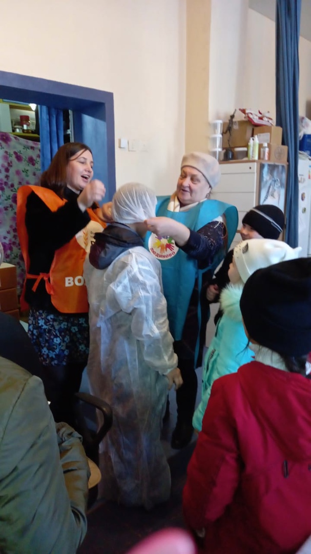 Ребята с живым интересом слушали о проводимой волонтерской деятельности, задавали много вопросов. Познакомились с волонтерскими фартуками — манишками, с «таинственными костюмами», в которых происходит разгрузка благотворительных партий продукции. Много дивного и необычного увидели и услышали ребята.