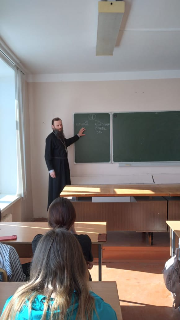 О чем может поговорить священник со студентами в солнечный мартовский день? Конечно, о счастье!! Как стать счастливым человеком? Что нужно сделать для этого? Именно на эту тему отец Сергий разговаривал со студентами около двух часов. Говорили о многом: о проблемах, которые сегодня волнует молодежь, о причинах формирования алкогольной и наркотической зависимости, о факторах семейного неблагополучия, об идеологии моргенштернов — милохиных, о целях и смысле жизни. Ребята слушали батюшку с большим интересом, ведь запрос на возможность изменения жизненных ориентиров уже сформирован.