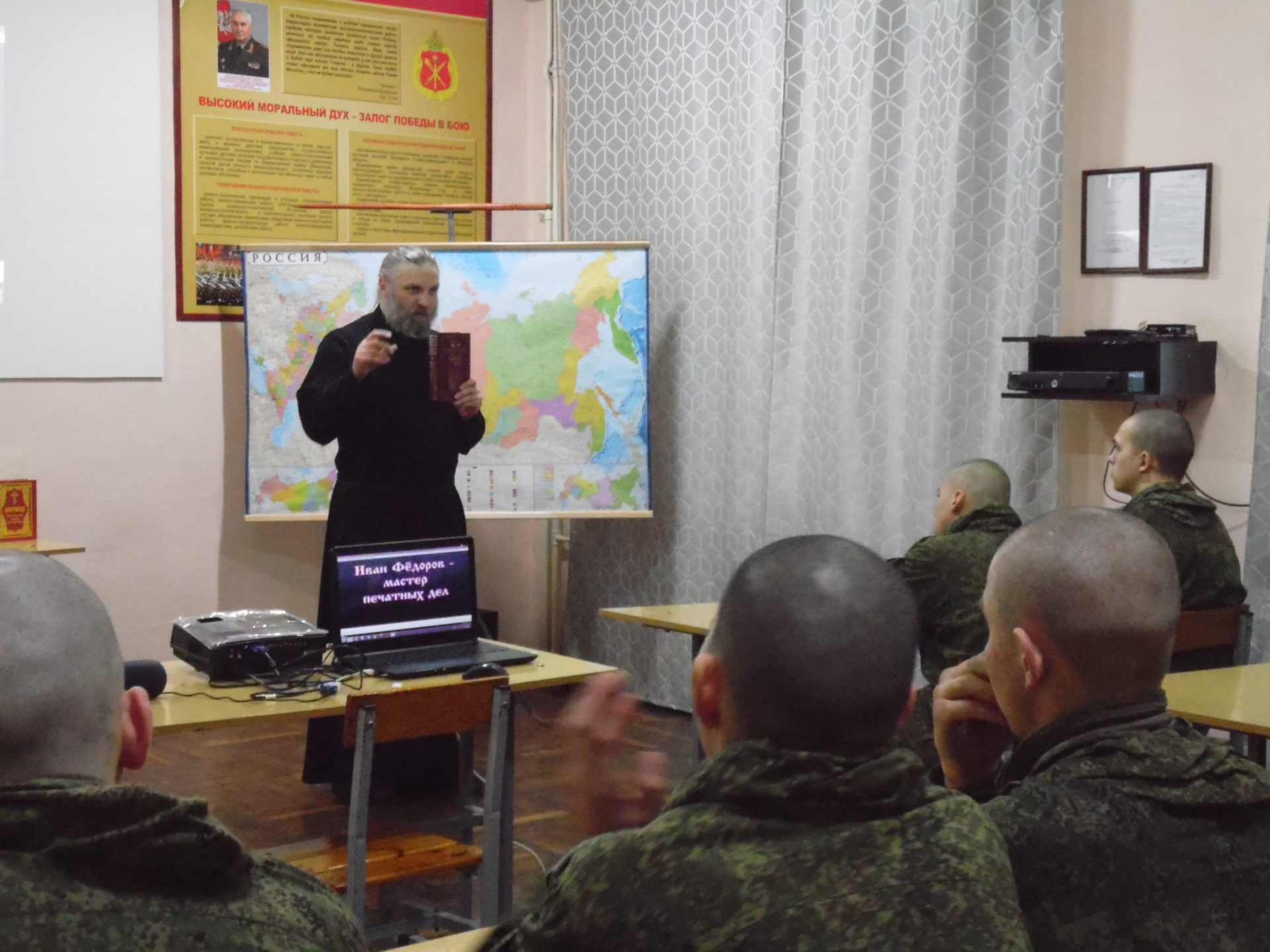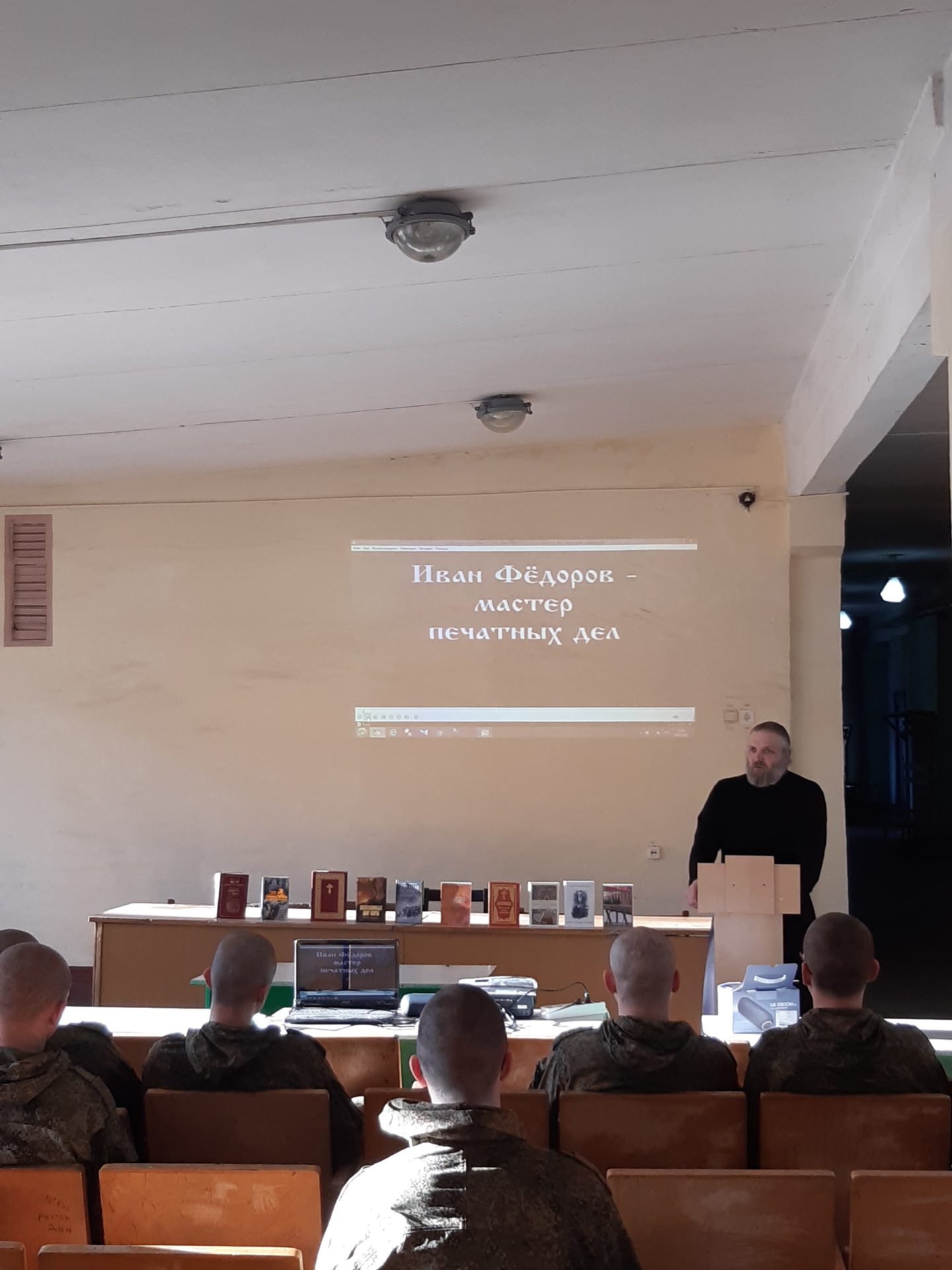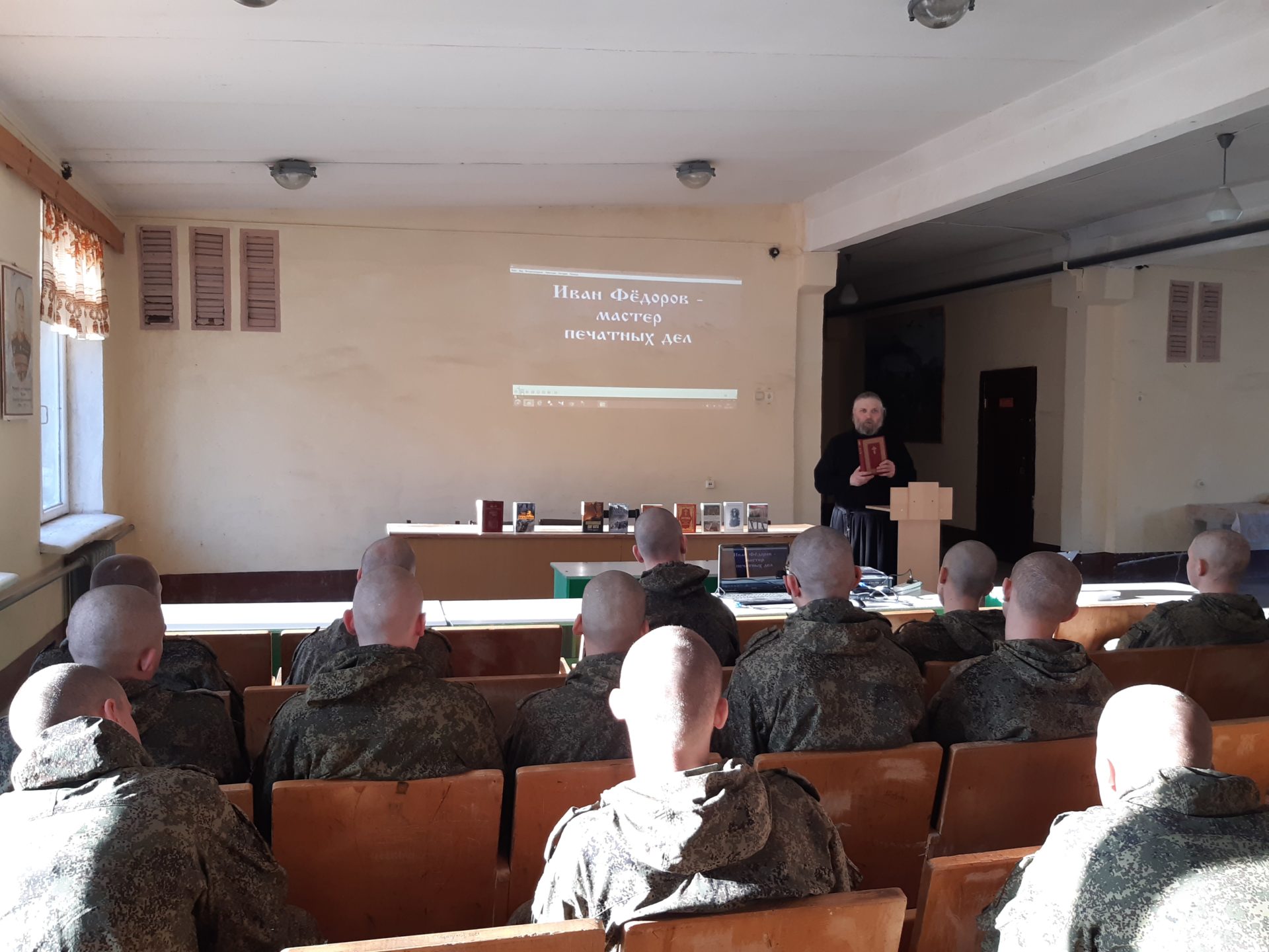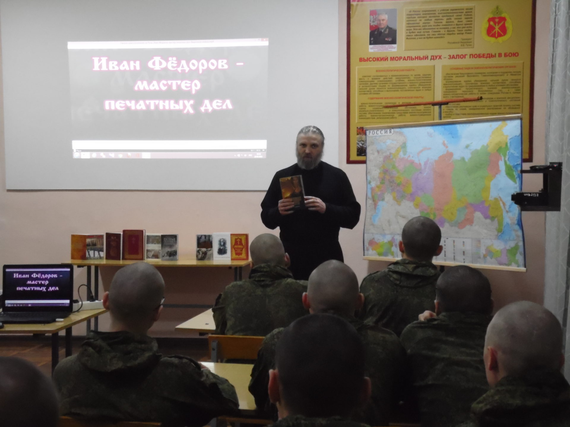 Священник рассказал военнослужащим о истории этого праздника, о возникновении первой печатной книги «Апостол». Был просмотрен видеофильм, посвященный жизни и деятельности первопечатника Ивана Федорова. Была представлена рукописная книга, вызвав неподдельный интерес присутствующих. Загаданы были загадки и произнесены пословицы о пользе чтения книг.