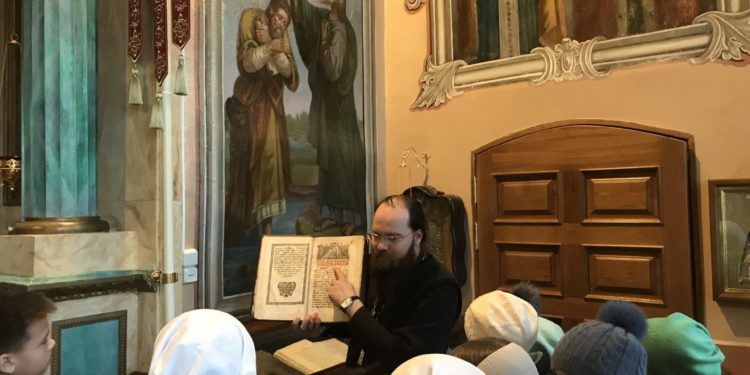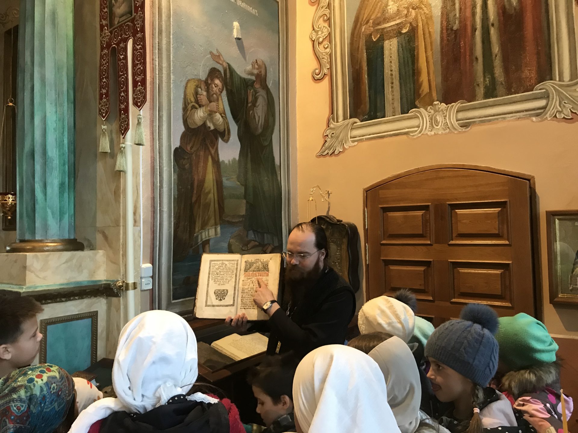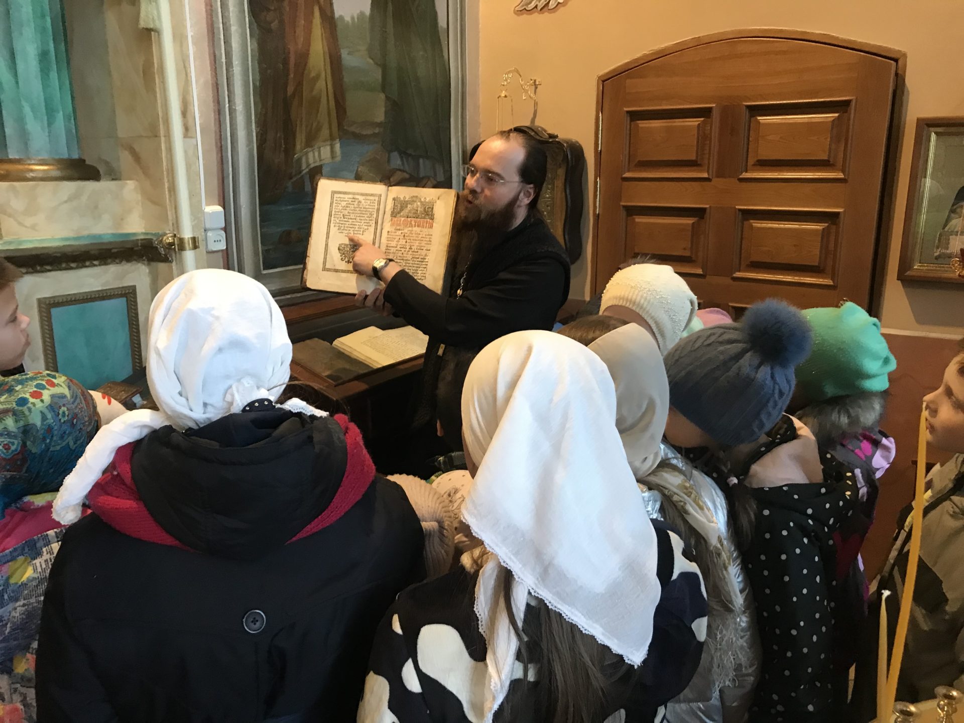 В самом храме после совместной молитвы перед началом доброго дела дети и их родители были ознакомлены с экспозицией старинных книг, а так же состоялась беседа с настоятелем храма иереем Тихоном Худяковым о первых книгоиздателях на Руси, о связи боярина Феодора Михайловича Ртищева с храмом и самим селом Нижние Прыски, (стоит заметить что потомок боярина Ртищева являлся владельцем села и одним из тех кто начал строительство большого трехпрестольного храма, а так же сохранились книги Ртищевской печати принадлежащие с тех пор храму) об особенностях славянской письменности и издательского дела, а так же о пользе душеспасительного чтения.