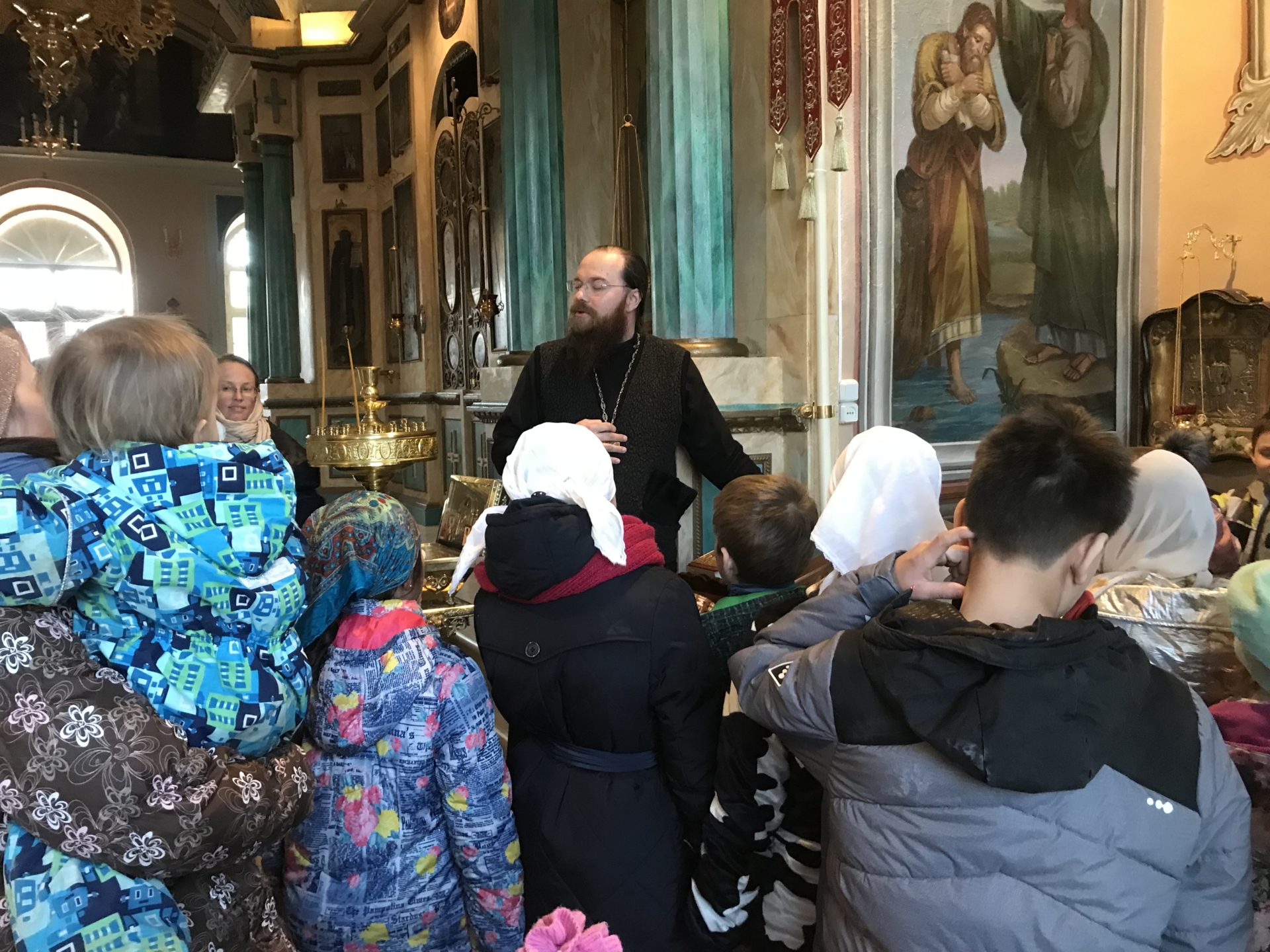 Потом ребята прикоснувшись к старинным книгам перешли в класс Воскресной школы, где их ждали увлекательные рассказы, старинные вещи и экспонаты (особенно ребятам понравились наконечник от копья, найденный на огородах близ храма и старинный утюг, которым еще в советские времена гладились священнические облачения при храме), чаепитие и выступление преподавателей Русской Классической школы на гуслях с духовными старинными песнопениями о душе, Евангелии и Руси.