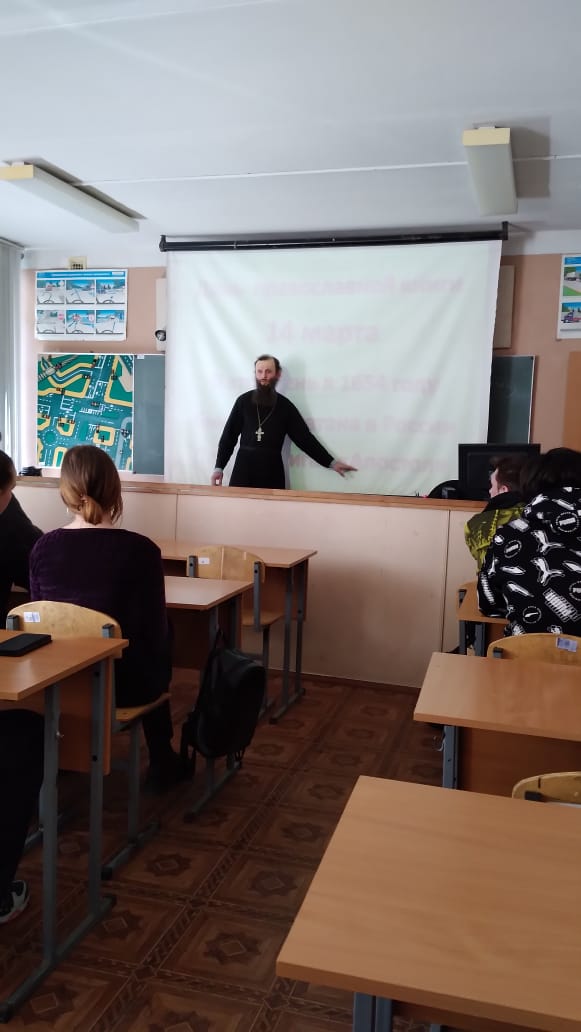 24 марта епархиальный координатор по утверждению трезвости иерей Сергий Дрозд провел беседу, посвященную Дню православной книги в Колледже транспорта и сервиса города Сухиничи. Поговорили о влиянии первых печатных книг «Апостол», «Часовник» и «Библия» на современность, об актуальности знания воли Творца мира для каждого из присутствующих, о смысле жизни. Ребята смогли подержать в руках старинные церковные книги, узнали о заповедях блаженства, как пути к обретению настоящего счастья в жизни, а также о духовных основах преодоления конфликтов.