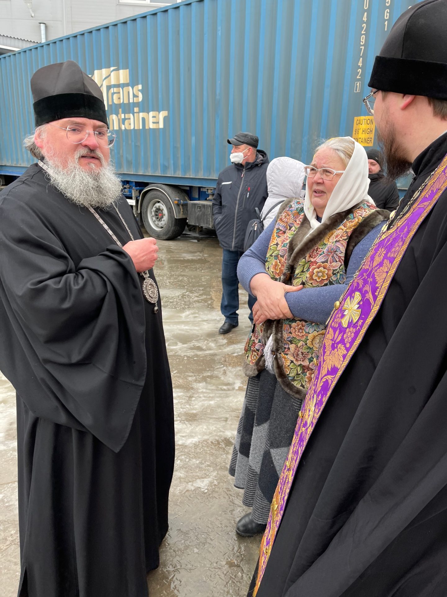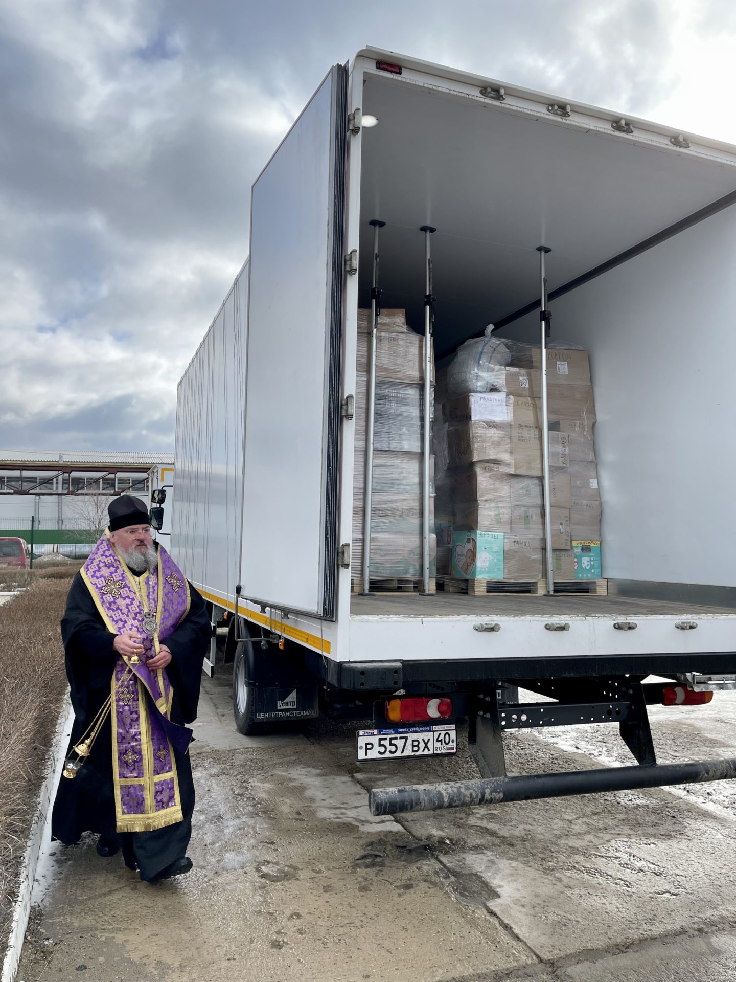 Груз сопровождают: Руководитель Социального отдела Козельской епархии иерей Дионисий Куваев; директор Социального центра «Рождественский» Марина Владимировна Куклина и несколько мирян.