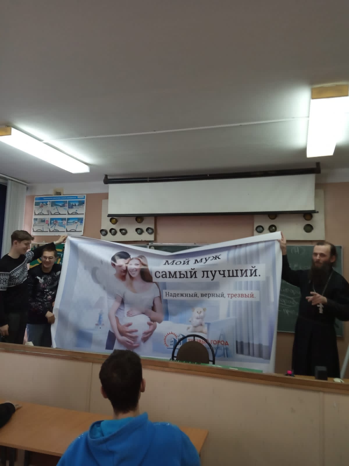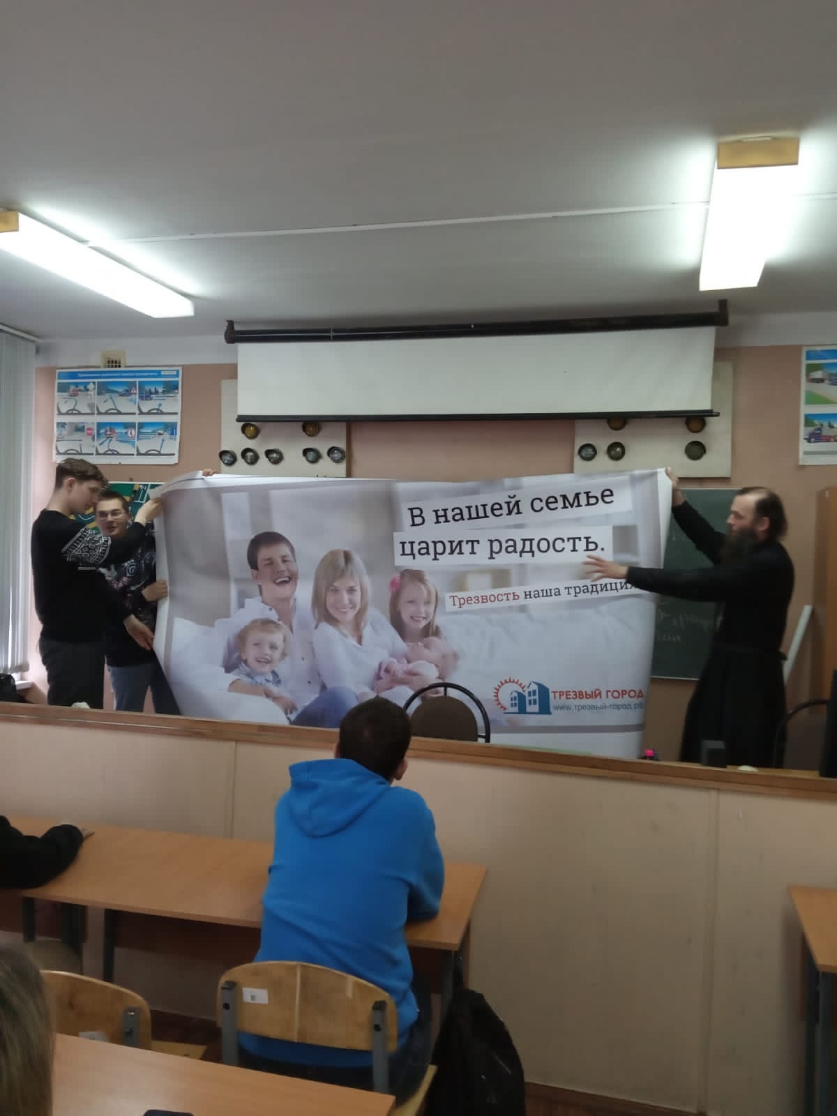 7 апреля в праздник Благовещения Пресвятой Богородицы епархиальный координатор по утверждению трезвости иерей Сергий Дрозд встретился с учащимися колледжа транспорта и сервиса города Сухиничи. Отец Сергий поздравил всех с праздником и провел беседу о смысле жизни, о смысле предстоящего праздника Светлого Христова Воскресения. В конце встречи он подарил колледжу два плаката из проекта «Трезвый город». Ребята слушали с интересом, вступали в дискуссию и в итоге пригласили приезжать ещё. По признанию ребят, вопросом о счастье и о смысле жизни из 22 человек задавались только двое, между тем этот вопрос краеугольный в профилактике различного рода зависимостей. Как сон разума порождает чудовищ, так и вакуум смыслов порождает «омоложение» наркомании, и рост числа зависимых в арифметической прогрессии. Если этой проблемой не заняться сейчас на самом широком уровне, можно потерять будущее страны. Приглашаем всех неравнодушных, активных христиан, желающих послужить Родине на ниве трезвенного просвещения к сотрудничеству. Телефон отца Сергия можно узнать на сайте епархии в разделе «Трезвость».