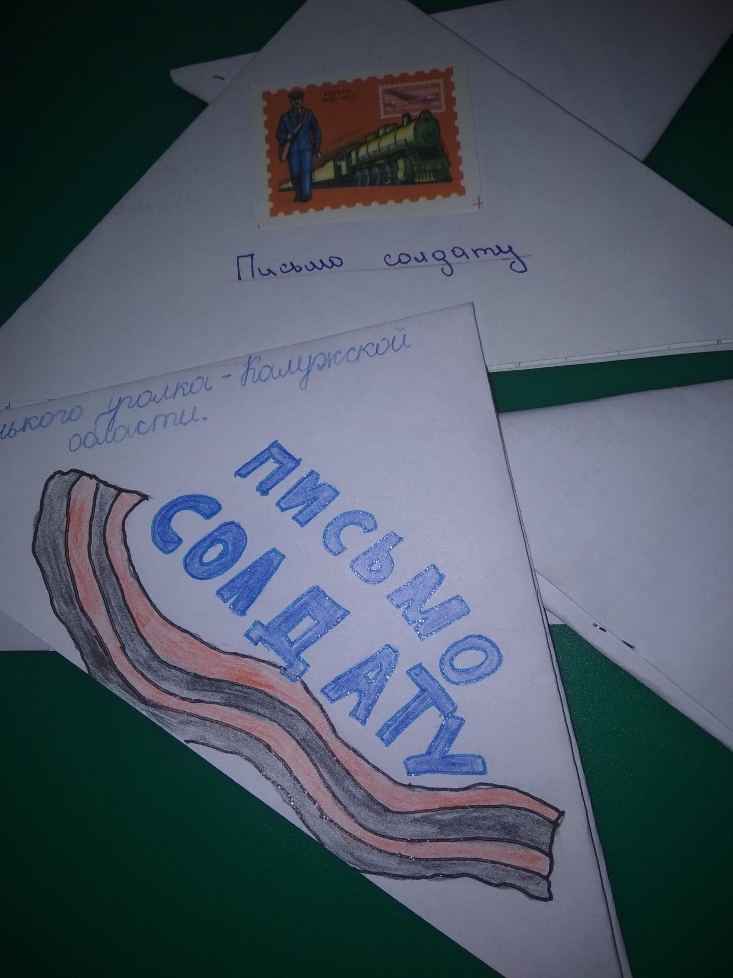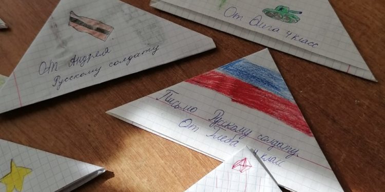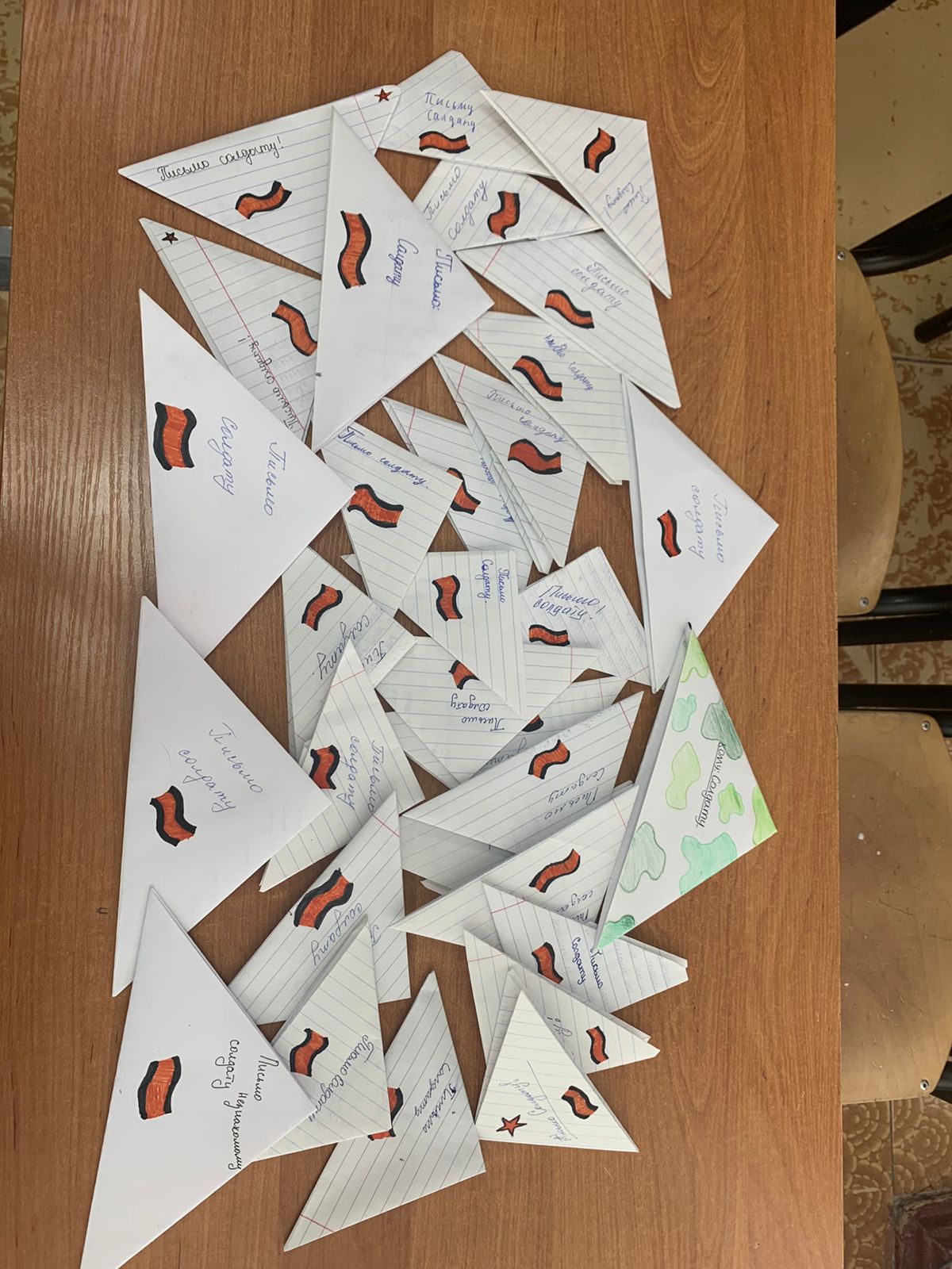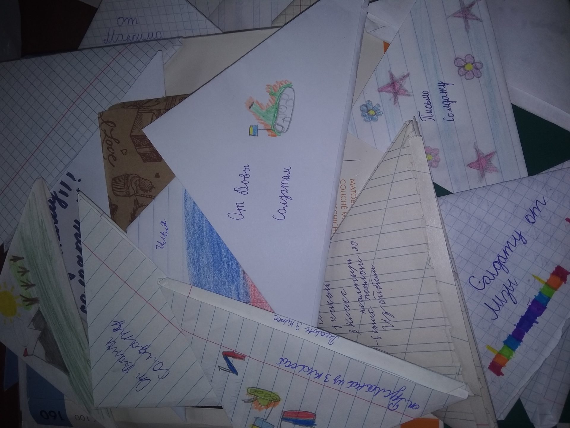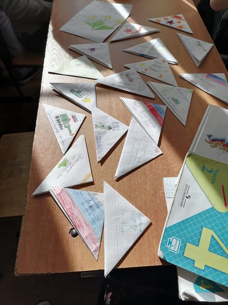 Свои письма ребята сложили в треугольники, как это делали солдаты во время Великой Отечественной войны, а кто-то нарисовал рисунок и сделал надпись для воинов.