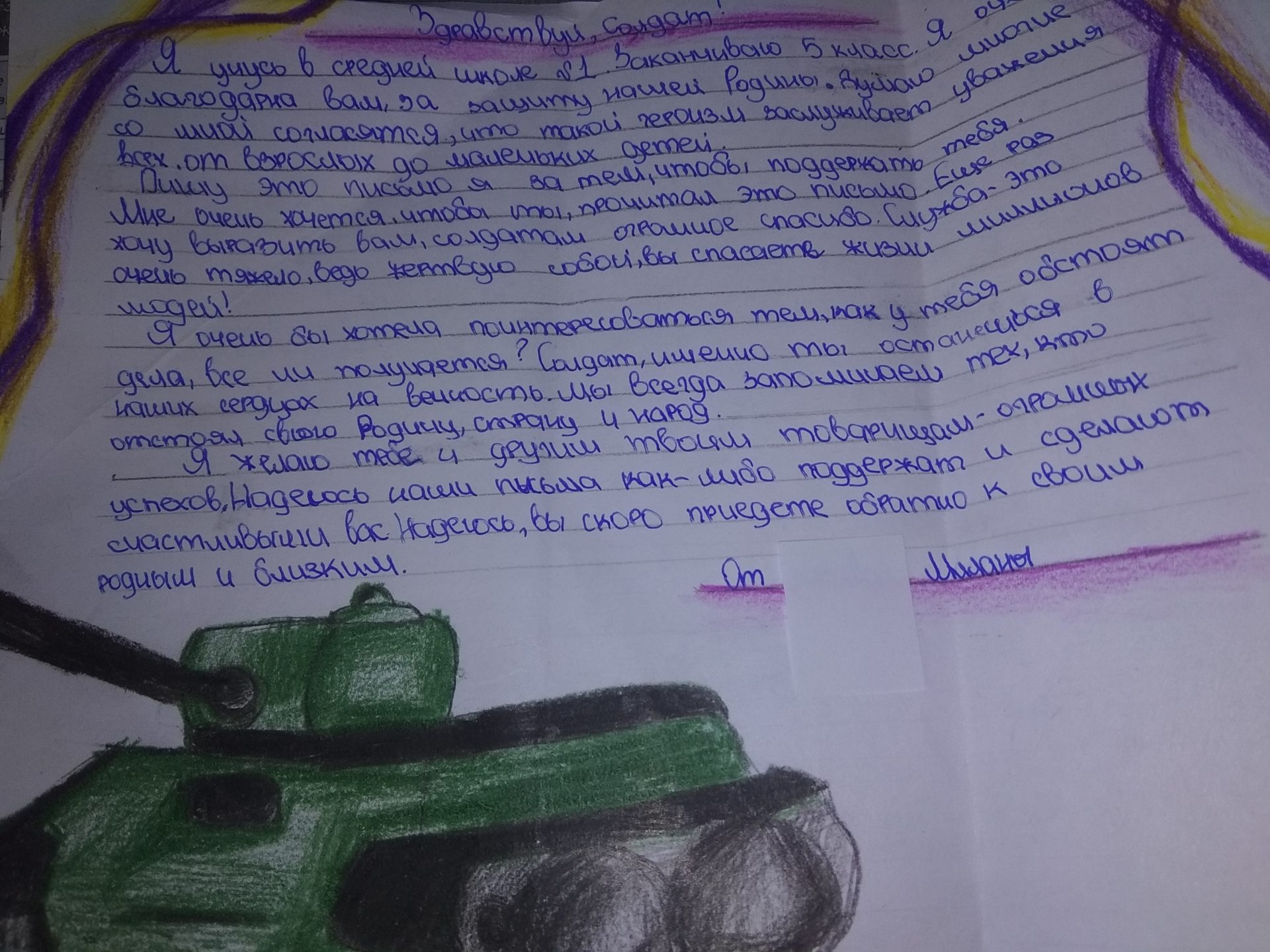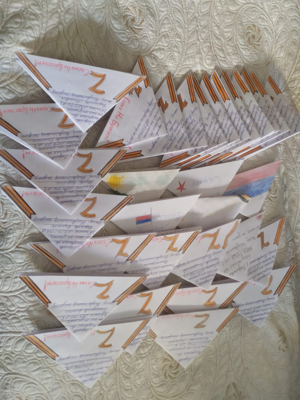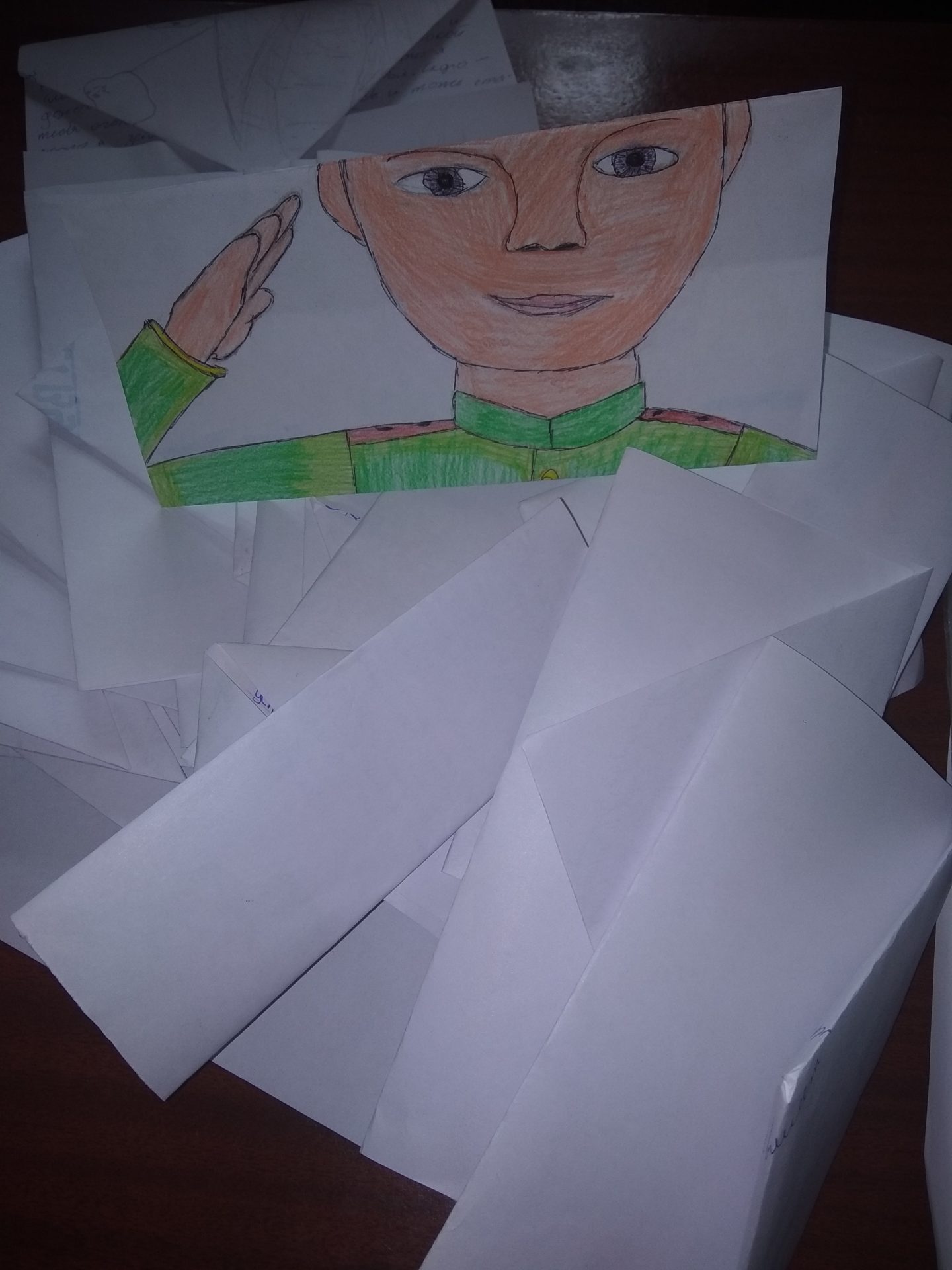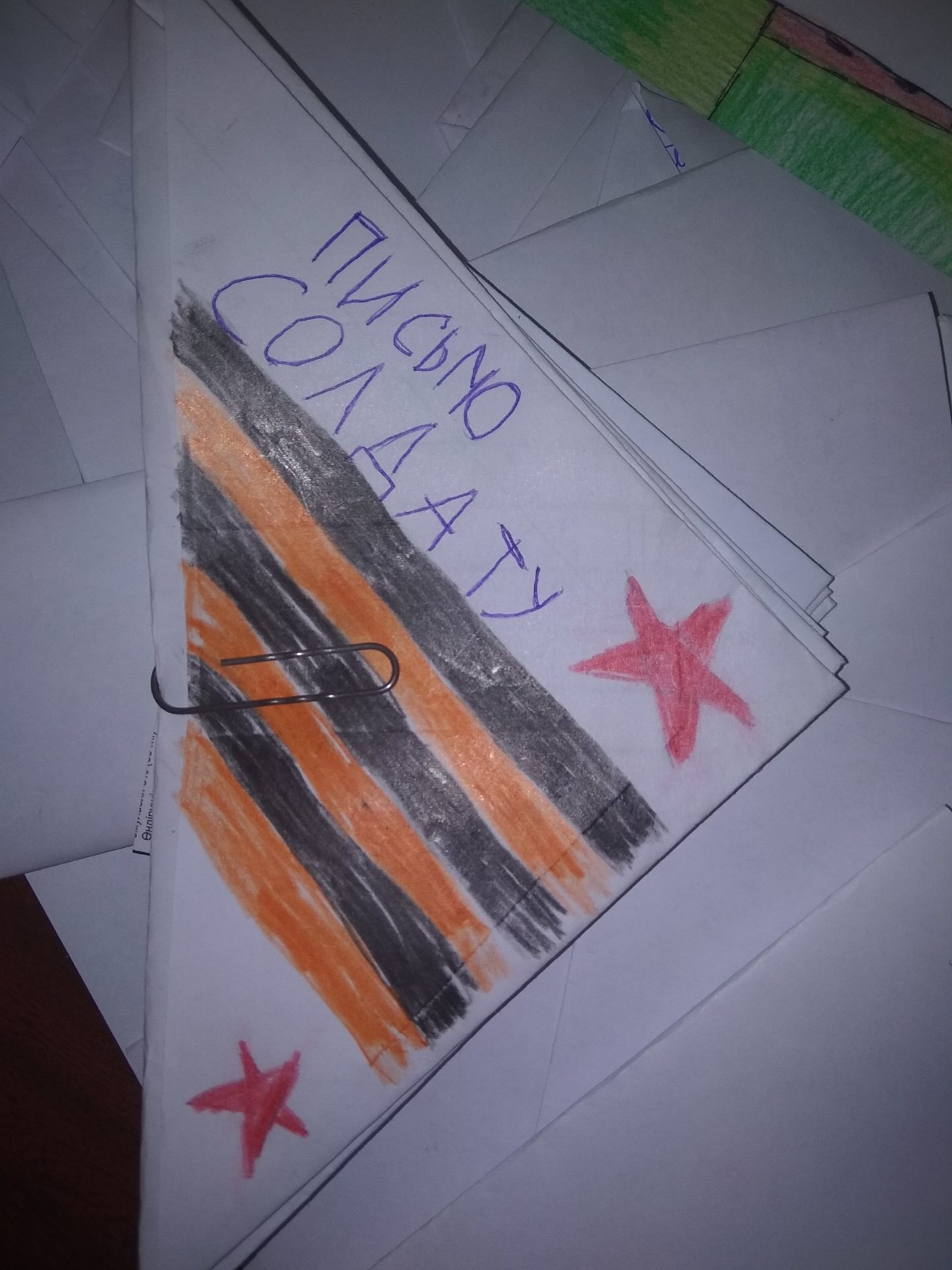 Свои письма ребята сложили в треугольники, как это делали солдаты во время Великой Отечественной войны, а кто-то нарисовал рисунок и сделал надпись для воинов.