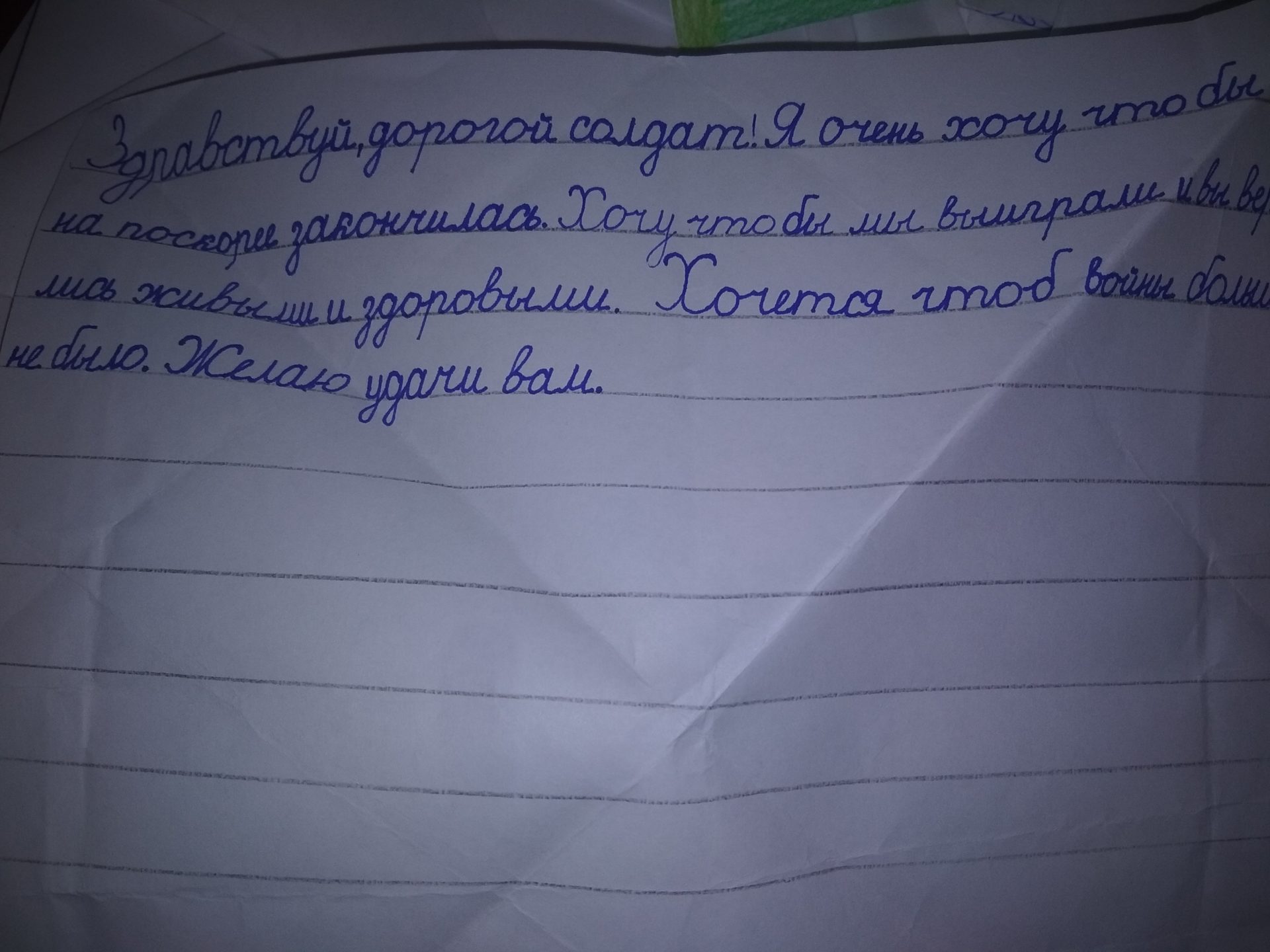 Дети с радостью приняли участие в ДОБРОМ ДЕЛЕ! Детские чистые сердца от души писали в своих письмах слова поддержки солдатам и офицерам, которые исполняют свой воинский долг. Они писали героям, нашим защитникам пожелания от себя: чтобы вернулись домой живыми к своим близким и родным. Некоторые участники акции приносили не только письма, но сладости для наших солдатиков. Беда объединила, помогла еще раз увидеть, как милосердны русские люди. Увидеть надежду, что молодое поколение вырастет неравнодушным и отзывчивым к своему ближнему.