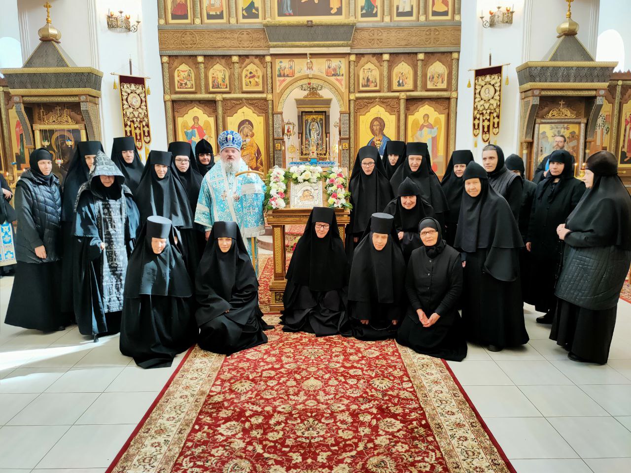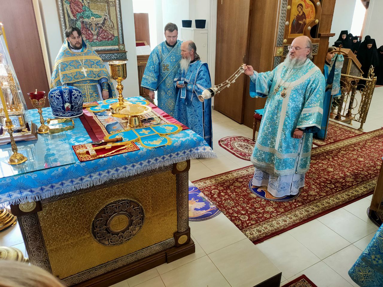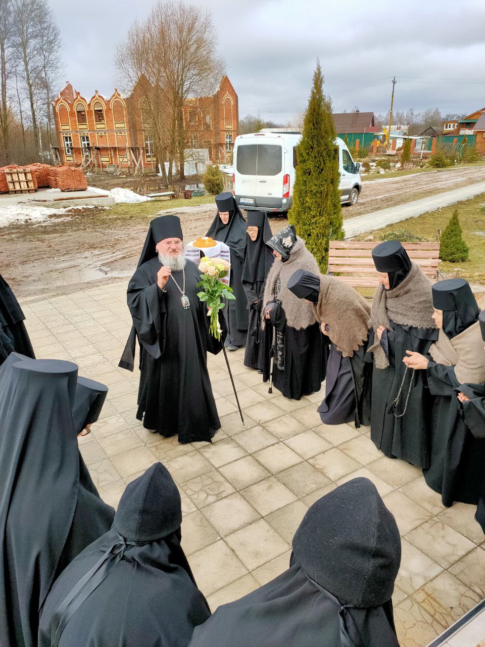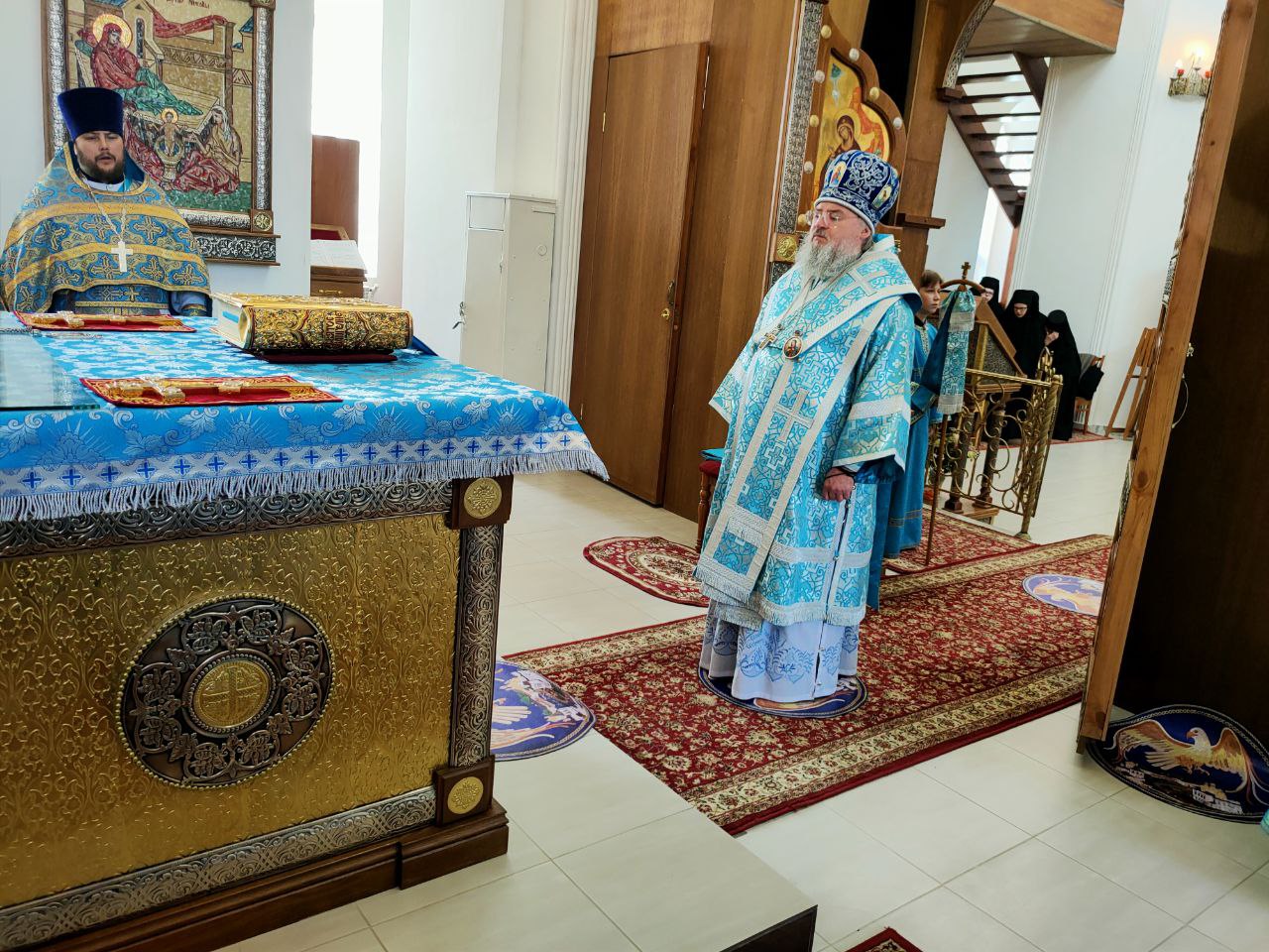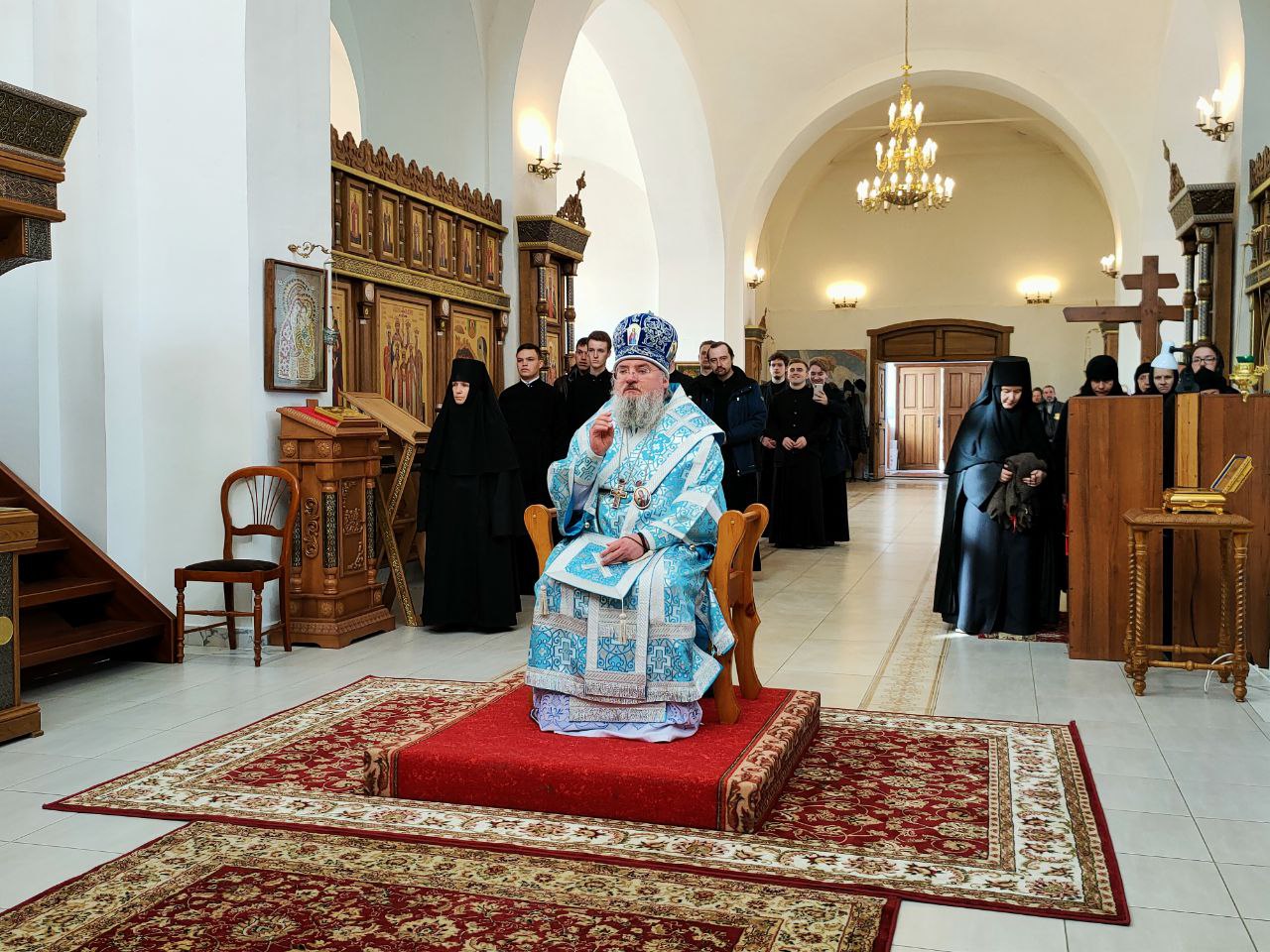 За богослужением молились насельницы обители во главе с исполняющей обязанности игумении монахиней Николаей (Александровой), студенты Калужской духовной семинарии, совершающие паломничество, прихожане и паломники, прибывшие в монастырь на праздник. После сугубой ектении владыка коленопреклонно вознес молитву о восстановлении мира. По отпусте литургии священнослужители совершили славление Пресвятой Богородицы, а затем владыка обратился к богомольцам с архипастырским словом. Епископ Никита поздравил клирика монастыря иерея Антония Лунина с сорокалетием со дня рождения и вручил ему благодарственное Архиерейское письмо. Владыка поблагодарил монахиню Николаю за труды по управлению монастырем и преподнес ей святую просфору.