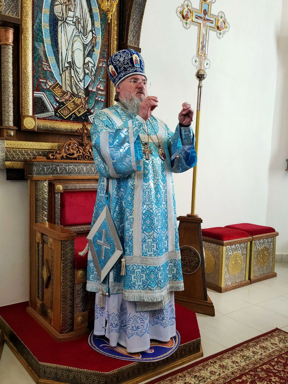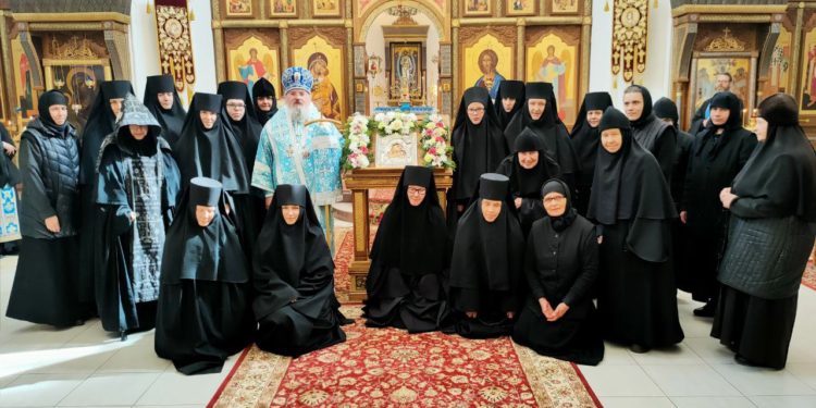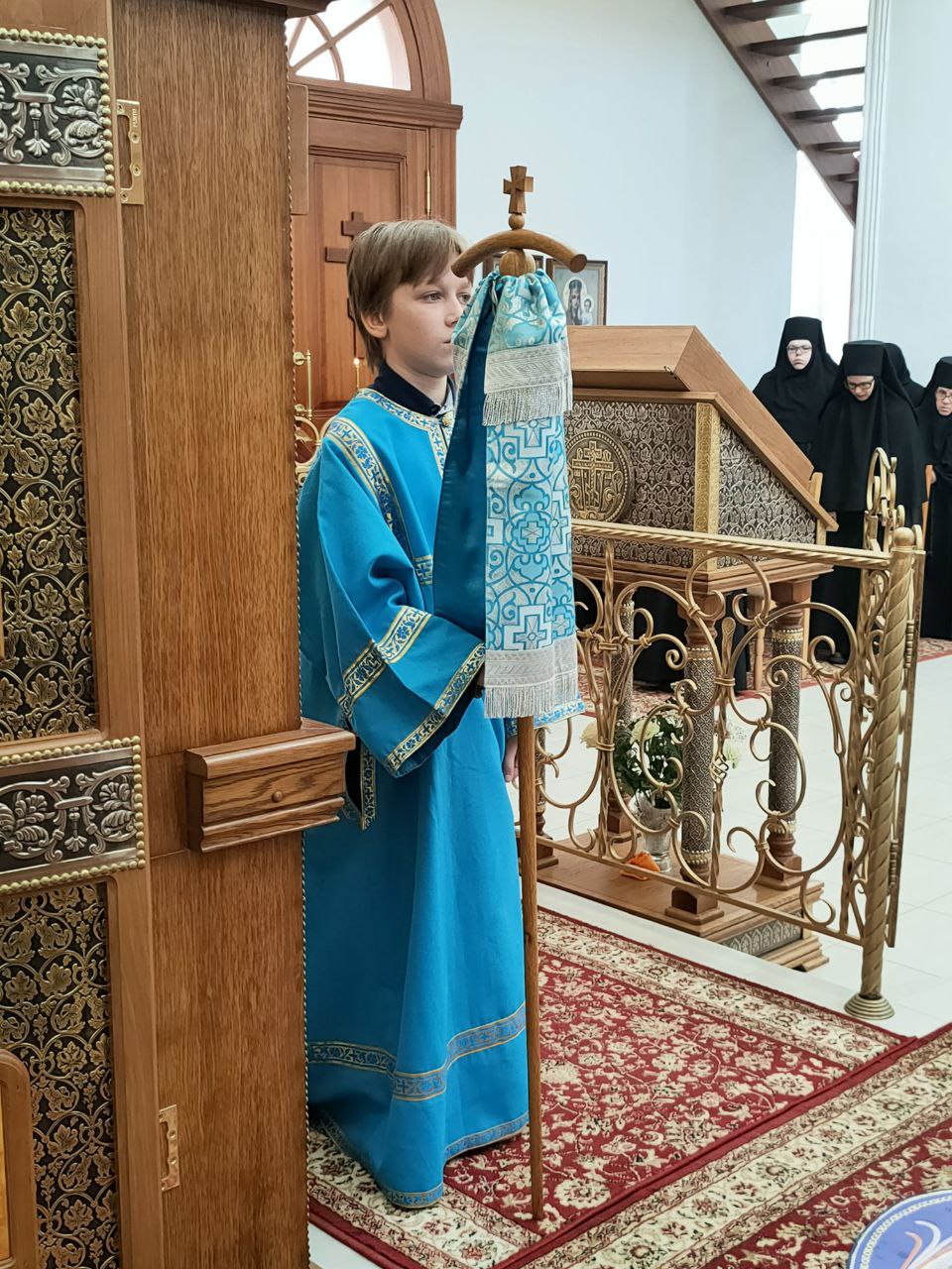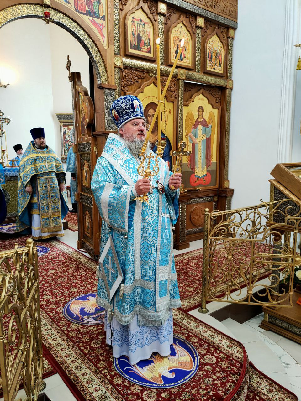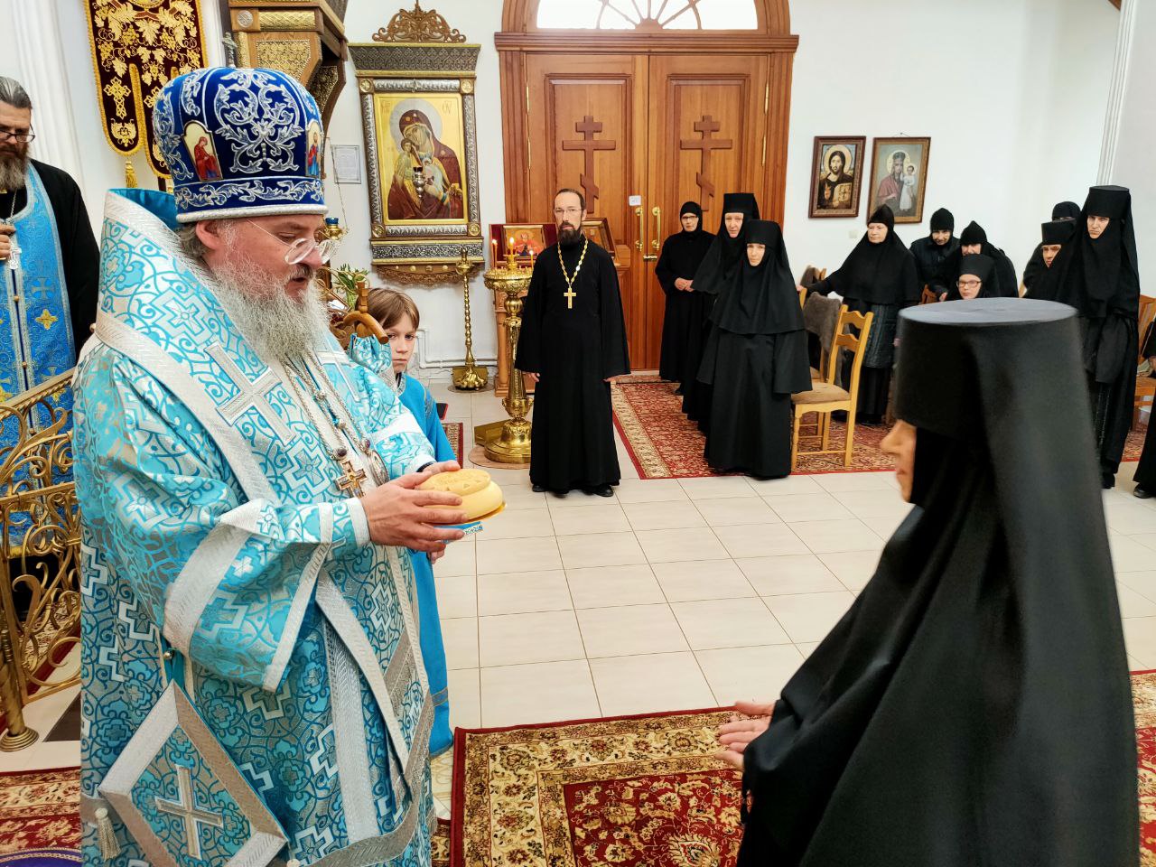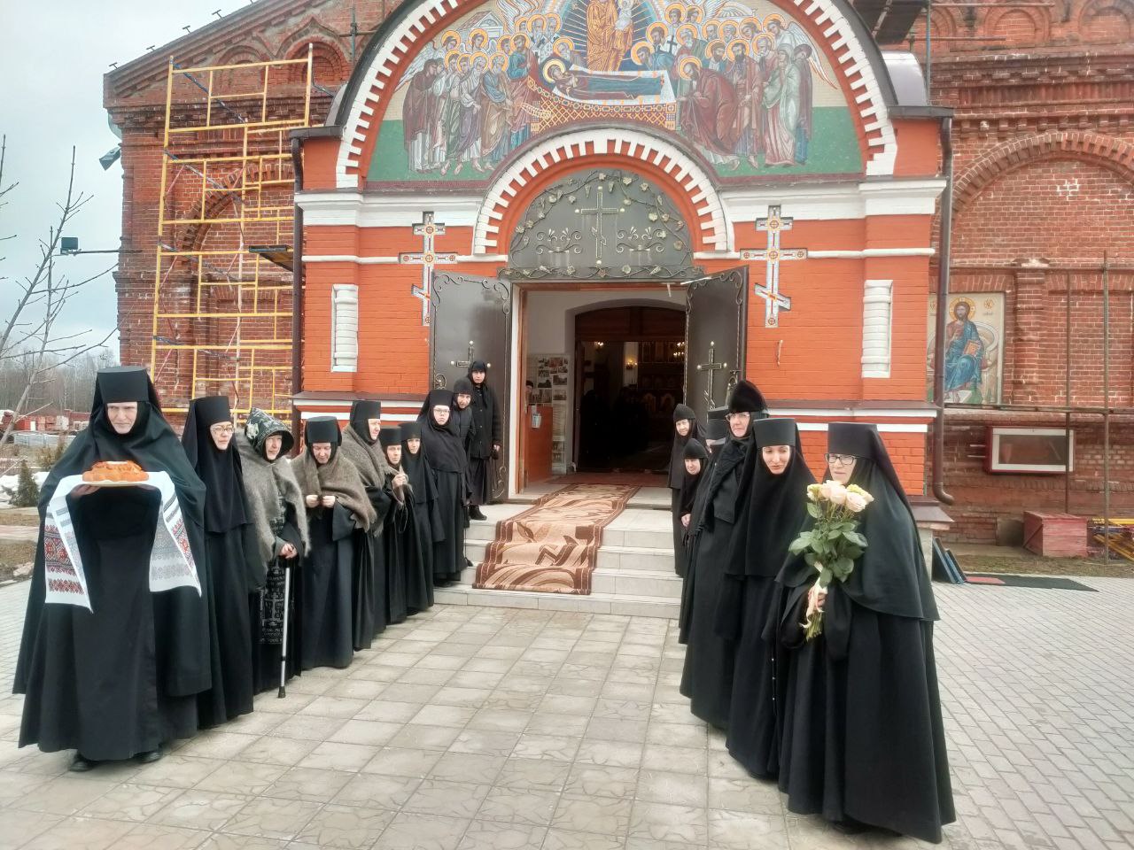 За богослужением молились насельницы обители во главе с исполняющей обязанности игумении монахиней Николаей (Александровой), студенты Калужской духовной семинарии, совершающие паломничество, прихожане и паломники, прибывшие в монастырь на праздник. После сугубой ектении владыка коленопреклонно вознес молитву о восстановлении мира. По отпусте литургии священнослужители совершили славление Пресвятой Богородицы, а затем владыка обратился к богомольцам с архипастырским словом. Епископ Никита поздравил клирика монастыря иерея Антония Лунина с сорокалетием со дня рождения и вручил ему благодарственное Архиерейское письмо. Владыка поблагодарил монахиню Николаю за труды по управлению монастырем и преподнес ей святую просфору.