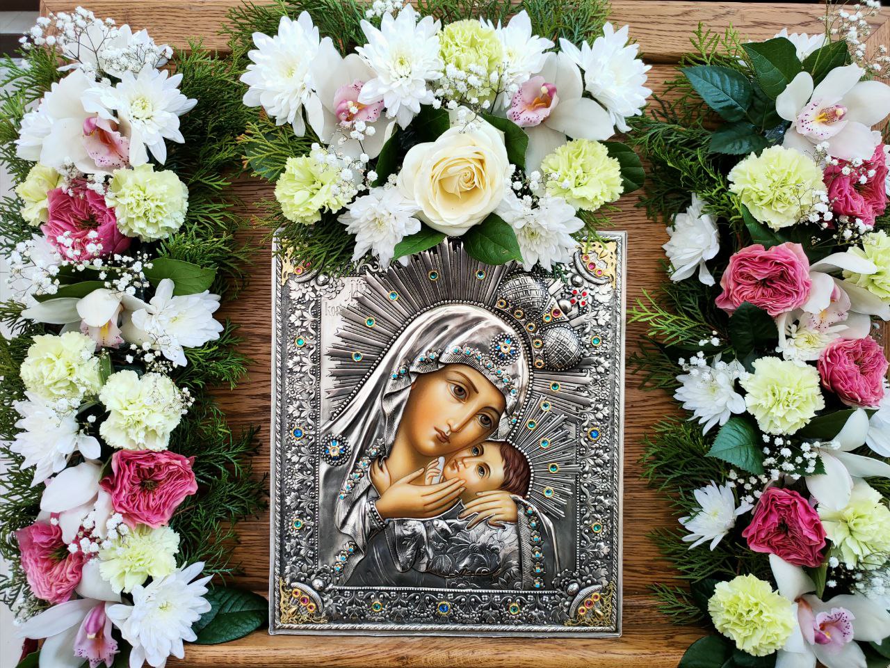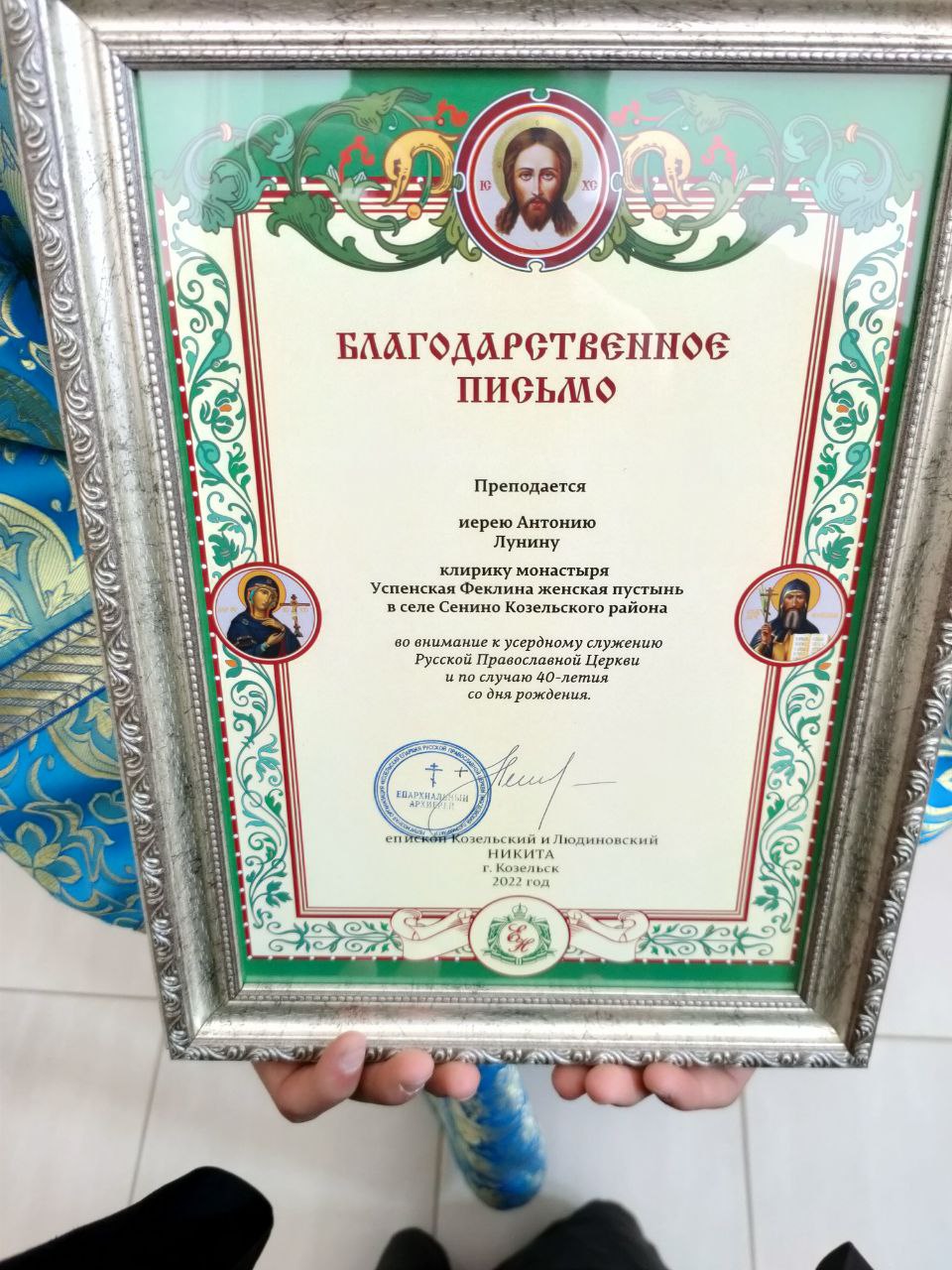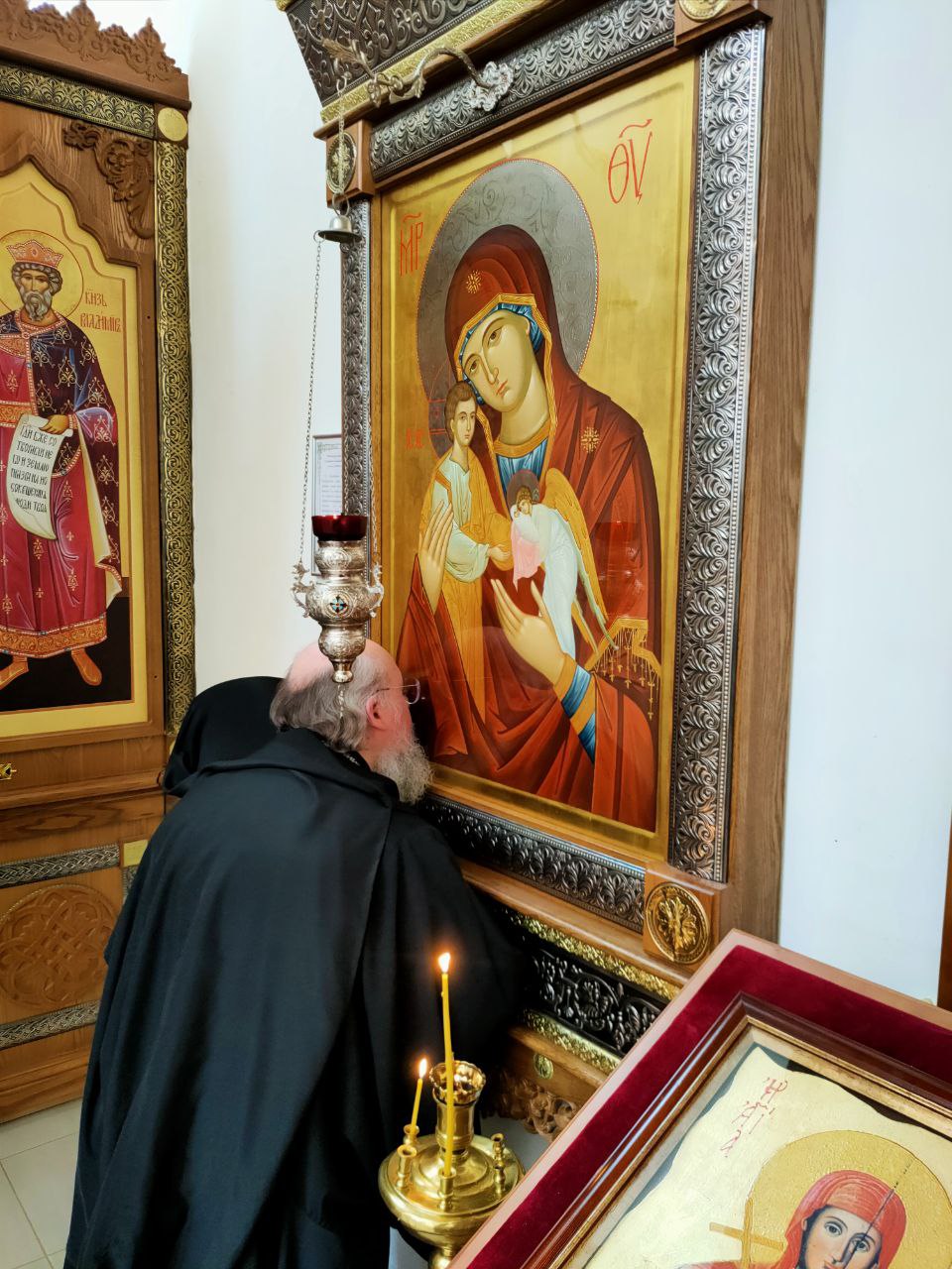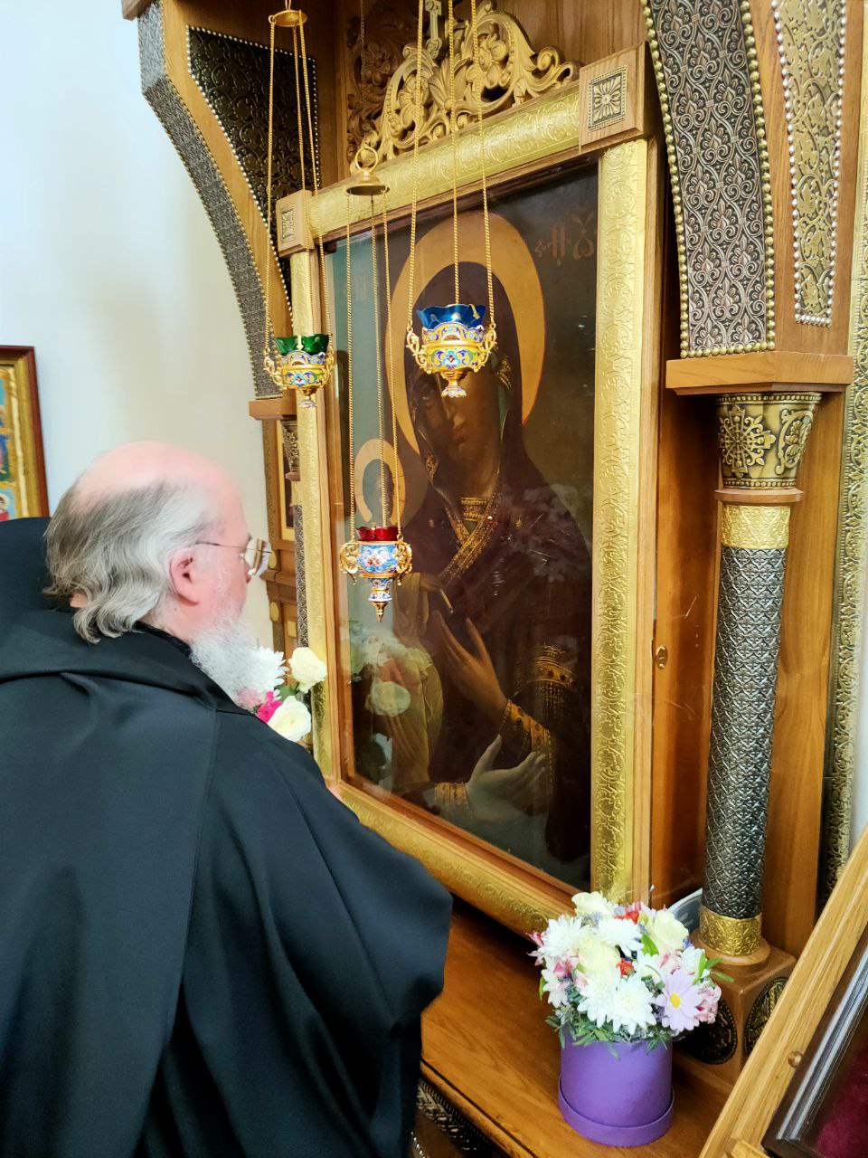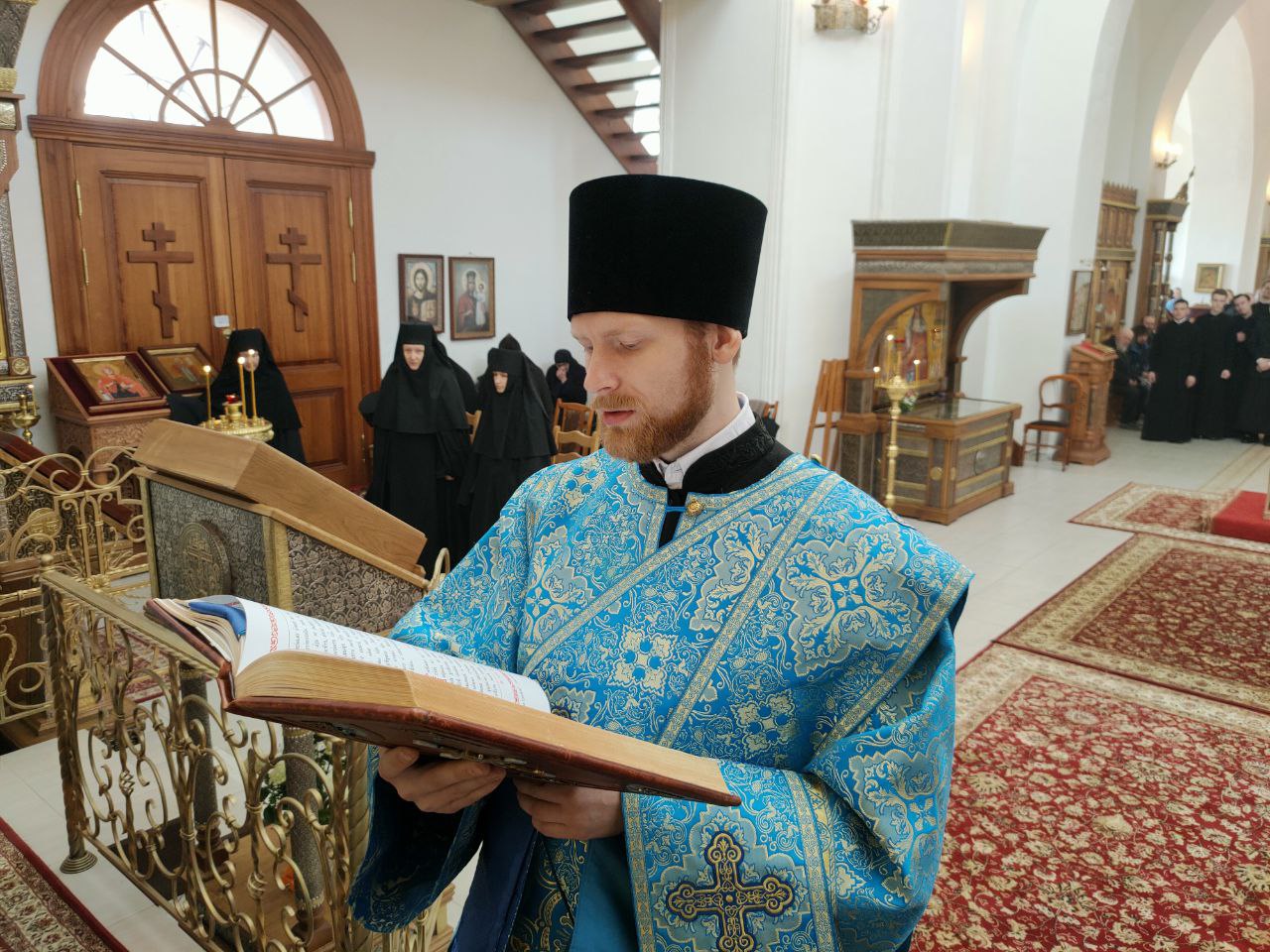 За богослужением молились насельницы обители во главе с исполняющей обязанности игумении монахиней Николаей (Александровой), студенты Калужской духовной семинарии, совершающие паломничество, прихожане и паломники, прибывшие в монастырь на праздник. После сугубой ектении владыка коленопреклонно вознес молитву о восстановлении мира. По отпусте литургии священнослужители совершили славление Пресвятой Богородицы, а затем владыка обратился к богомольцам с архипастырским словом. Епископ Никита поздравил клирика монастыря иерея Антония Лунина с сорокалетием со дня рождения и вручил ему благодарственное Архиерейское письмо. Владыка поблагодарил монахиню Николаю за труды по управлению монастырем и преподнес ей святую просфору.