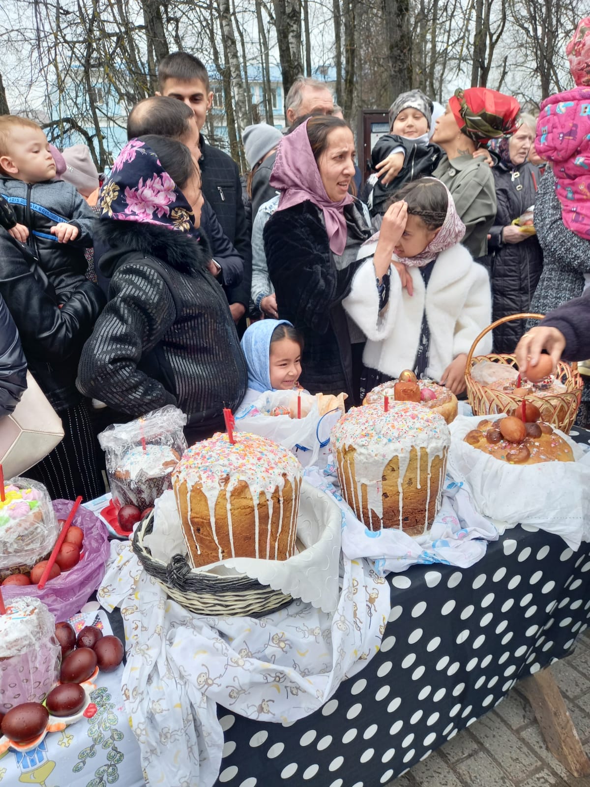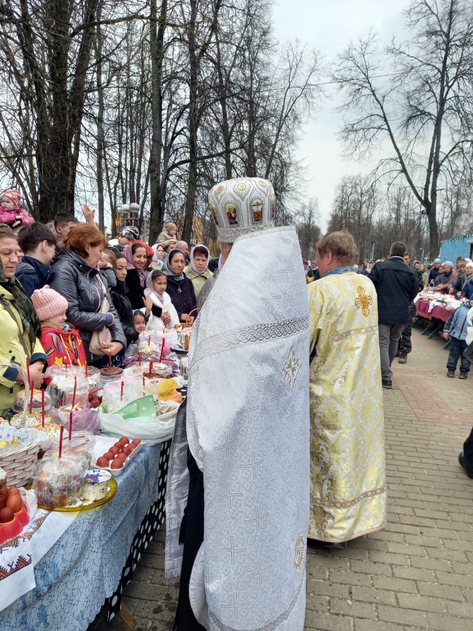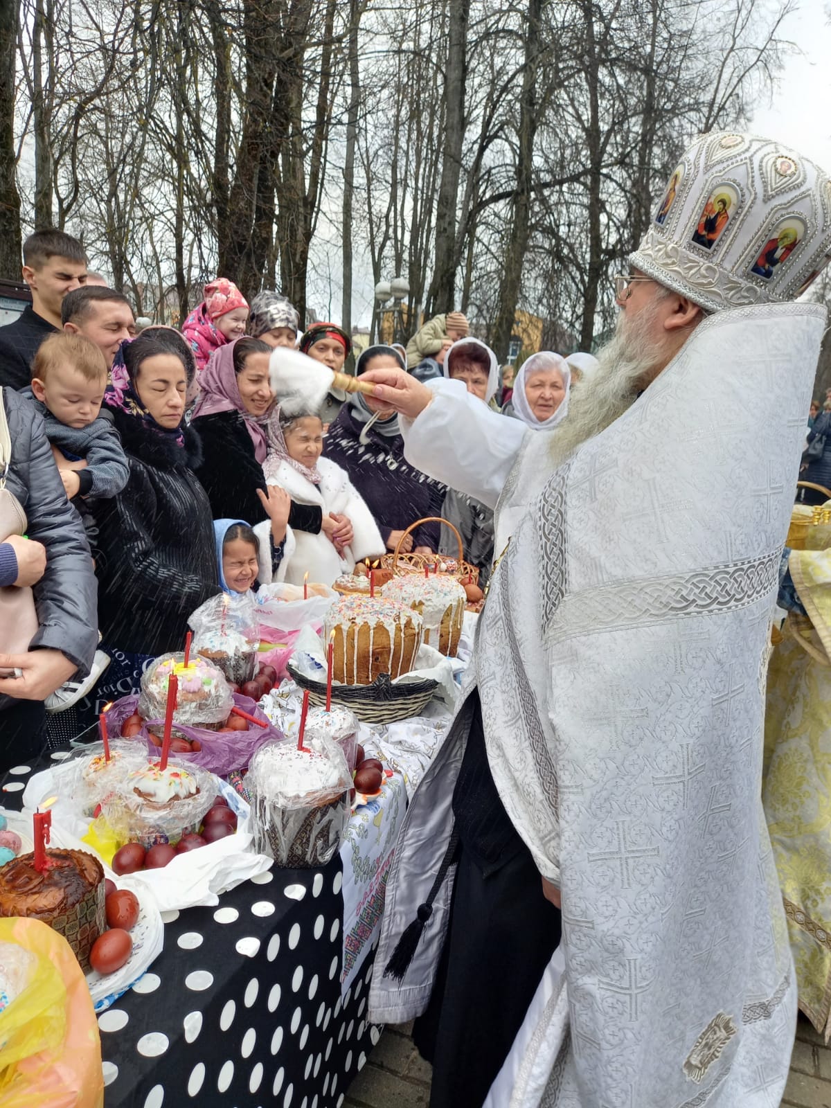 23 апреля 2022 года в Великую Субботу, после богослужений, в ограде Казанского собора города Людиново настоятель храма протоиерей Алексий Жиганов и клирик иерей Алексий Сначёв в течение дня совершали освящение куличей и пасхальных яиц.