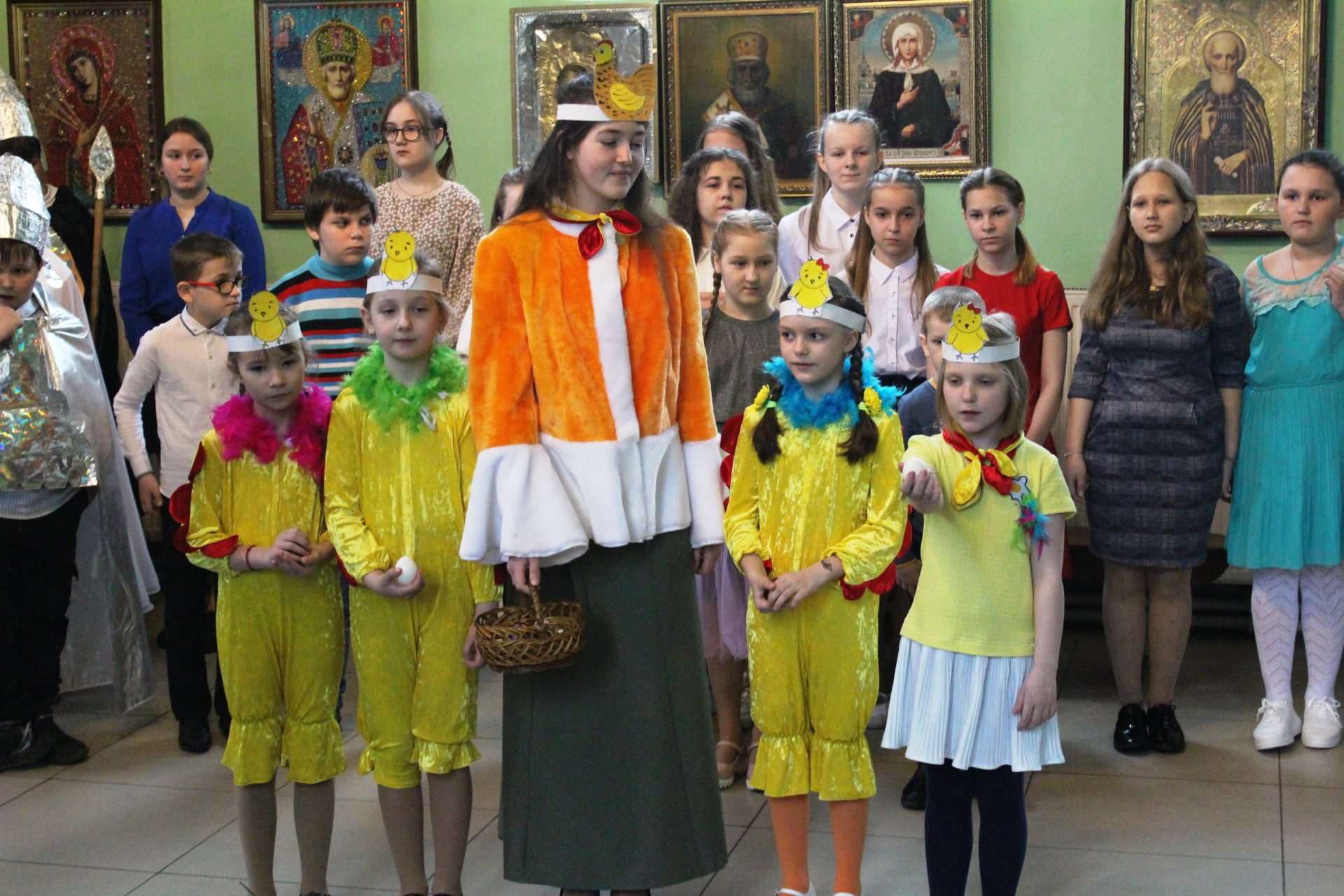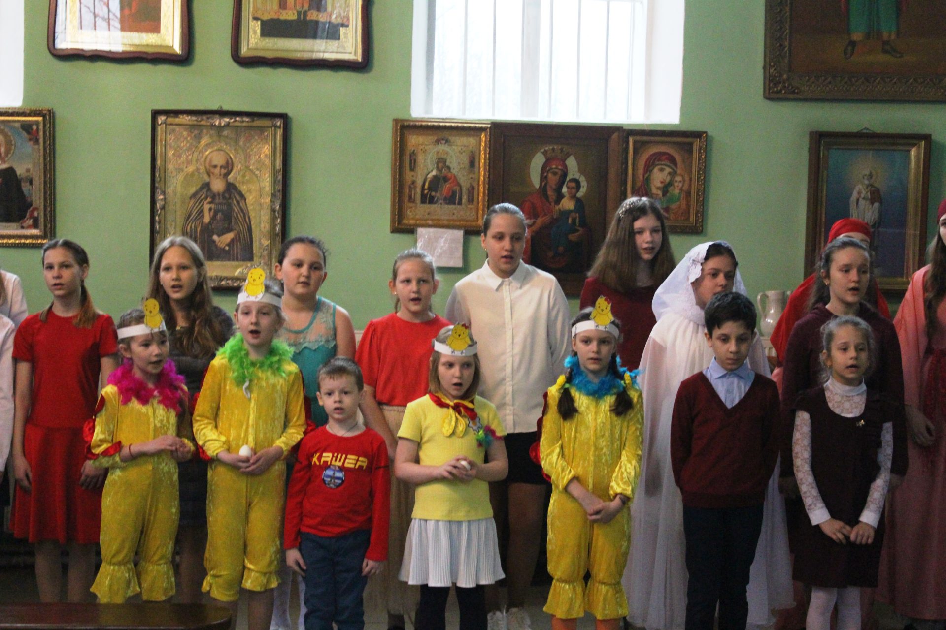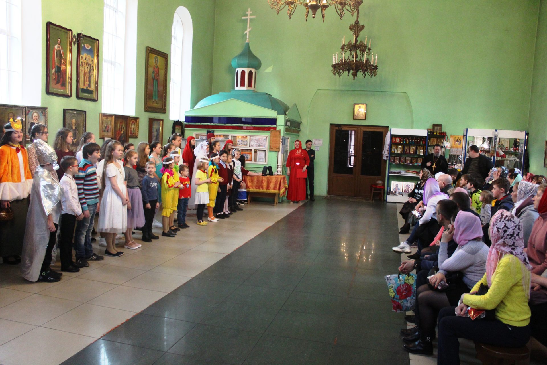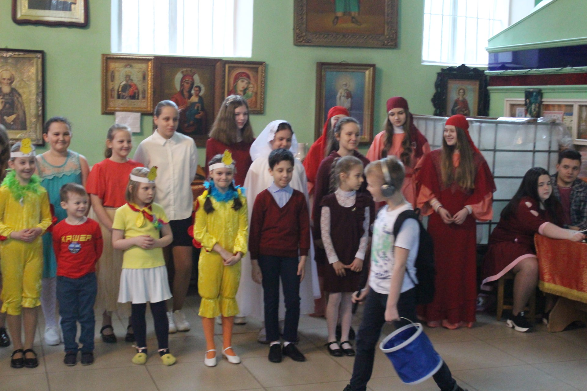 Жены-мироносицы повествовали о земной жизни Иисуса Христа и о Его Воскресении. Внимание зрителей привлекла пасхальная сценка о чуде пасхального яйца. Маленькие цыплятки никого не оставили равнодушными. Необыкновенно трогательный и самый что ни на есть пасхальный сюжет спектакля с проникновенной игрой всех актеров до глубины души поразил зрителей. Были и слёзы, и радость, и искреннее сопереживание во время спектакля. О событиях последних Крестных дней Христа. Ученики читали стихи так, что невозможно было не вспоминать это снова и снова с глубоким чувством. Дети, играющие на сцене, понимали всю важность и ответственность своей роли не только как актеров, но и как проповедников, несущих благую весть об Иисусе Христе. Не обошелся праздник и без стихов. Воспитанники читали стихотворения о Воскресении Спасителя, о радости людей, а также дети порадовали зрителей торжественными пасхальными песнопениями, веселыми детскими песнями о Пасхе! По традиции на празднике присутствовали дети и воспитатели ДРЦ «Чайка». По окончании всех выступлений настоятель храма протоиерей Василий Биляк поблагодарил за проведение праздника детей, преподавателей и родителей. Батюшка поздравил собравшихся воспитанников со Светлым Христовым Воскресением и пожелал сохранять как можно дольше Пасхальную радость и пронести ее до следующей Пасхи. Все присутствовавшие на празднике получили подарки.  По окончании праздника традиционно была сделана общая фотография.