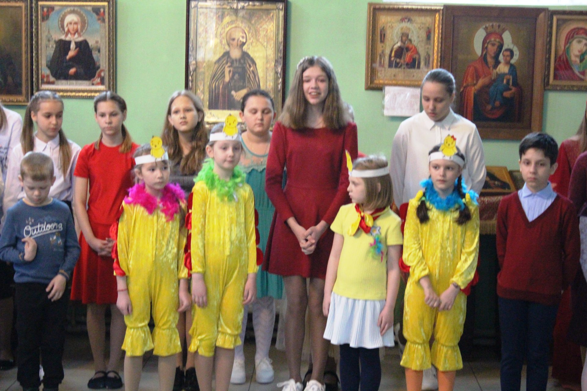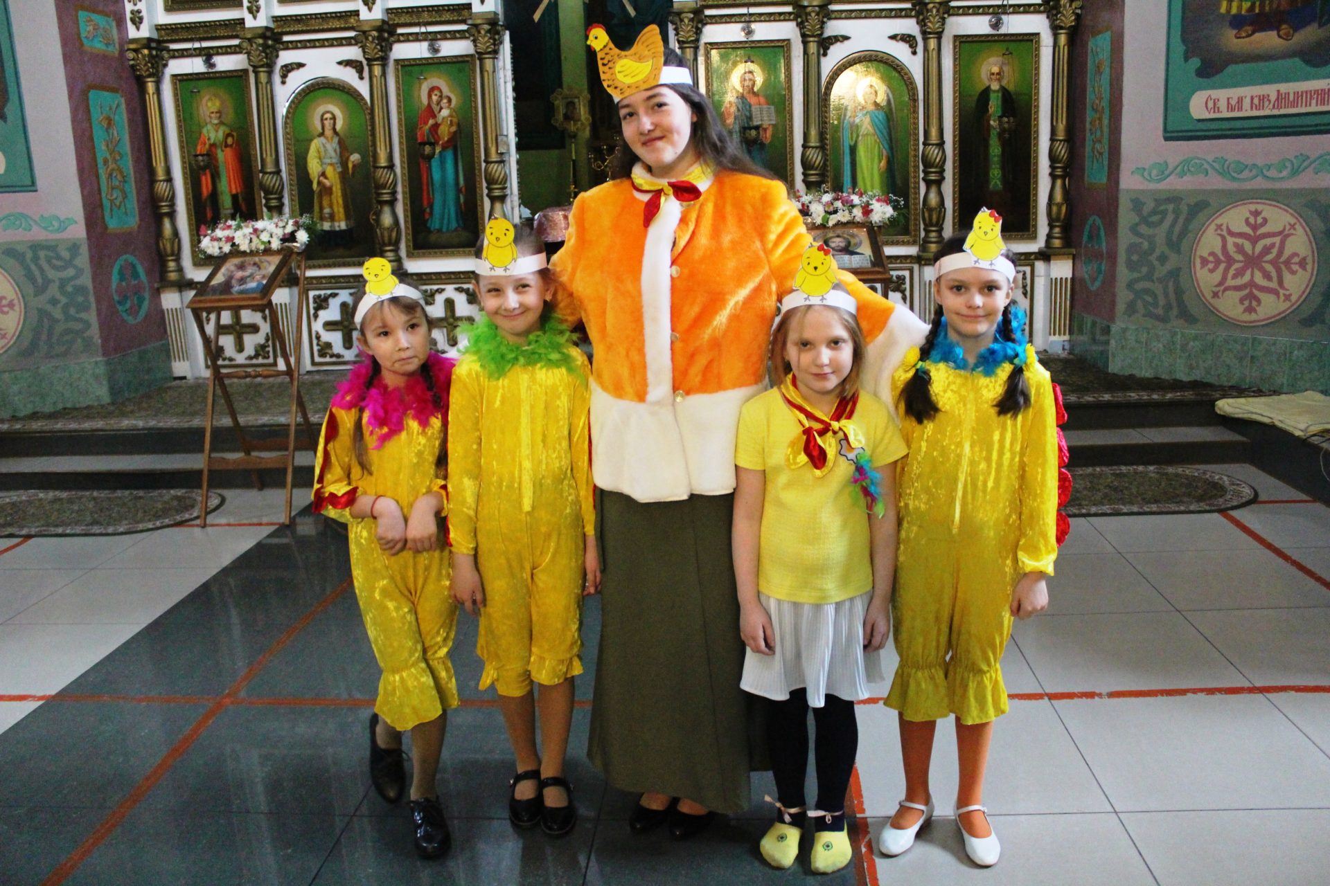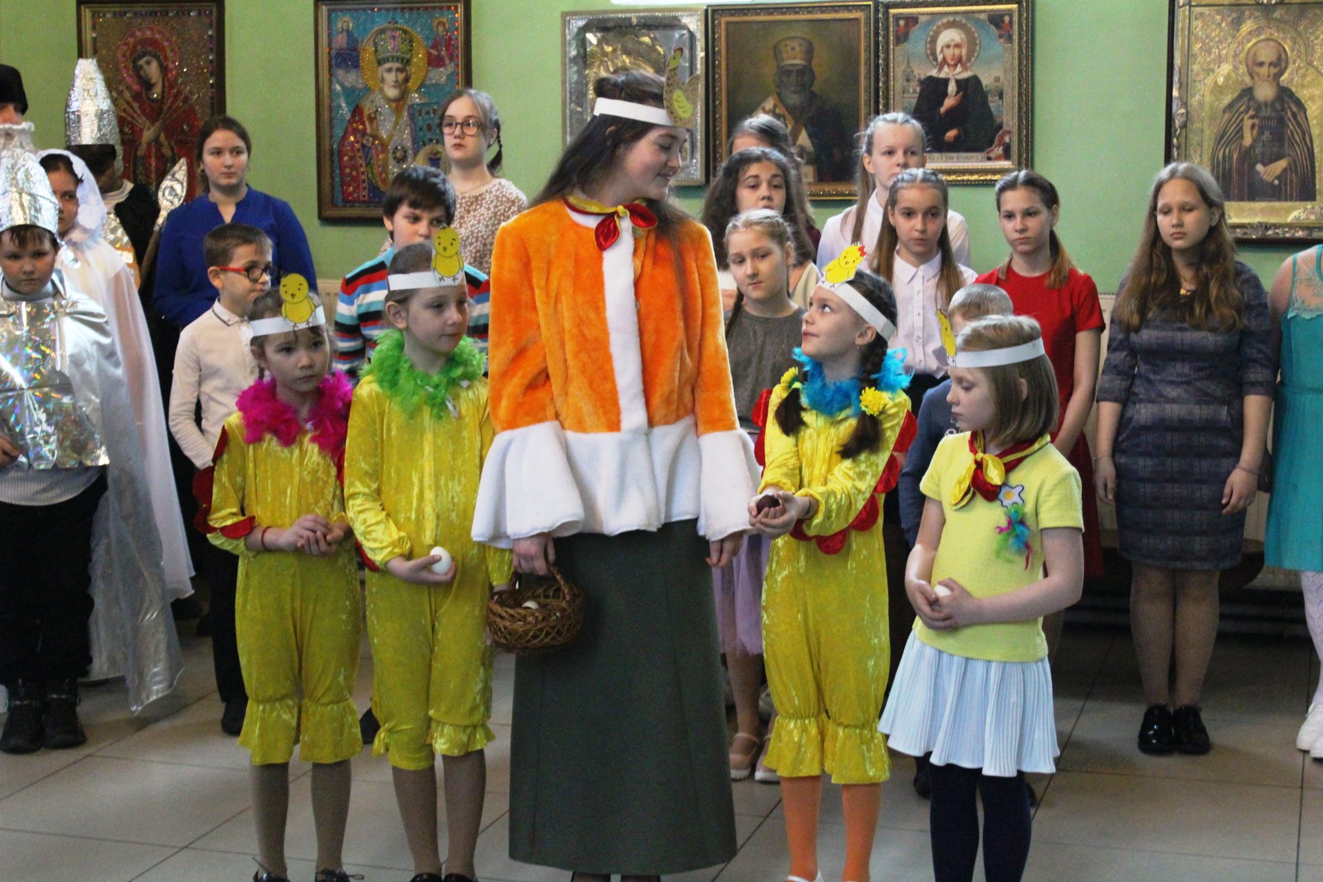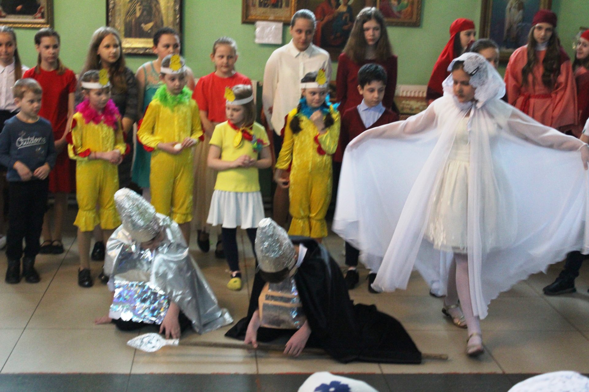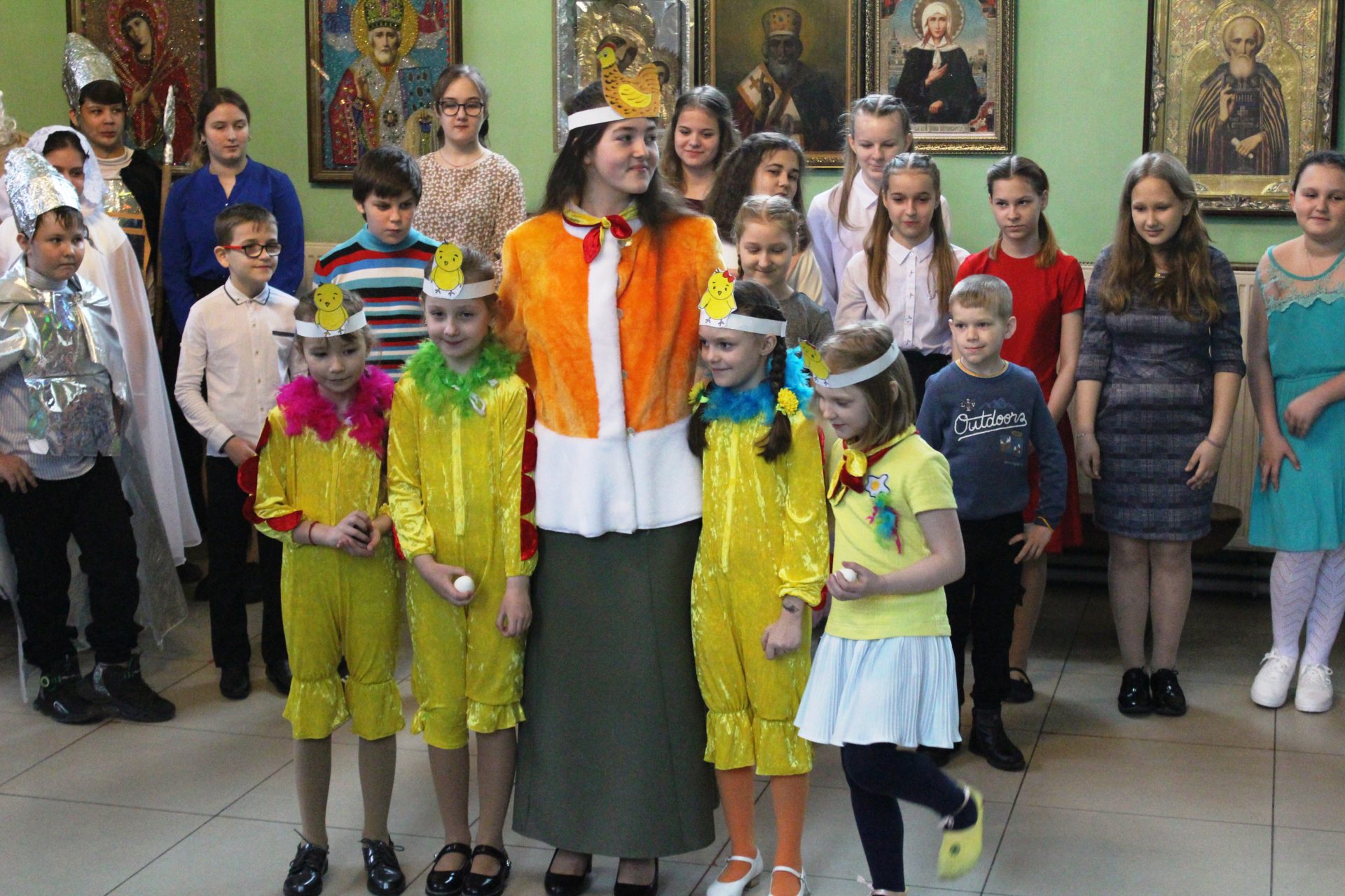 Жены-мироносицы повествовали о земной жизни Иисуса Христа и о Его Воскресении. Внимание зрителей привлекла пасхальная сценка о чуде пасхального яйца. Маленькие цыплятки никого не оставили равнодушными. Необыкновенно трогательный и самый что ни на есть пасхальный сюжет спектакля с проникновенной игрой всех актеров до глубины души поразил зрителей. Были и слёзы, и радость, и искреннее сопереживание во время спектакля. О событиях последних Крестных дней Христа. Ученики читали стихи так, что невозможно было не вспоминать это снова и снова с глубоким чувством. Дети, играющие на сцене, понимали всю важность и ответственность своей роли не только как актеров, но и как проповедников, несущих благую весть об Иисусе Христе. Не обошелся праздник и без стихов. Воспитанники читали стихотворения о Воскресении Спасителя, о радости людей, а также дети порадовали зрителей торжественными пасхальными песнопениями, веселыми детскими песнями о Пасхе! По традиции на празднике присутствовали дети и воспитатели ДРЦ «Чайка». По окончании всех выступлений настоятель храма протоиерей Василий Биляк поблагодарил за проведение праздника детей, преподавателей и родителей. Батюшка поздравил собравшихся воспитанников со Светлым Христовым Воскресением и пожелал сохранять как можно дольше Пасхальную радость и пронести ее до следующей Пасхи. Все присутствовавшие на празднике получили подарки.  По окончании праздника традиционно была сделана общая фотография.
