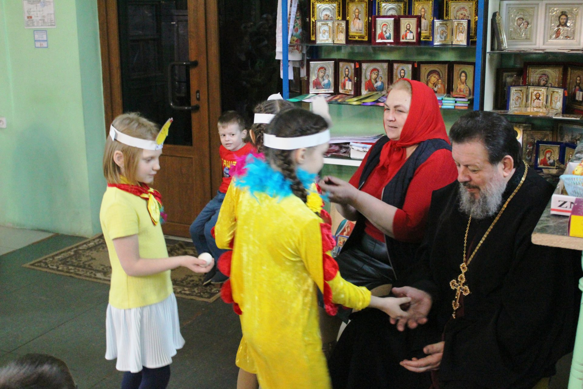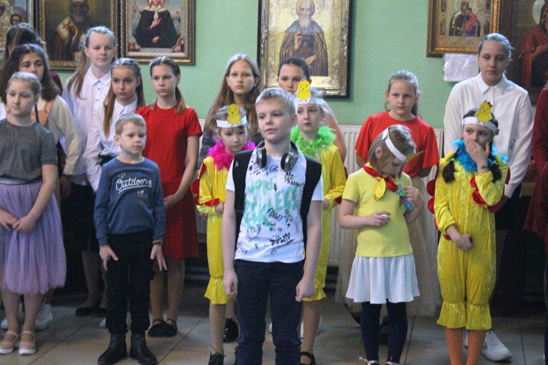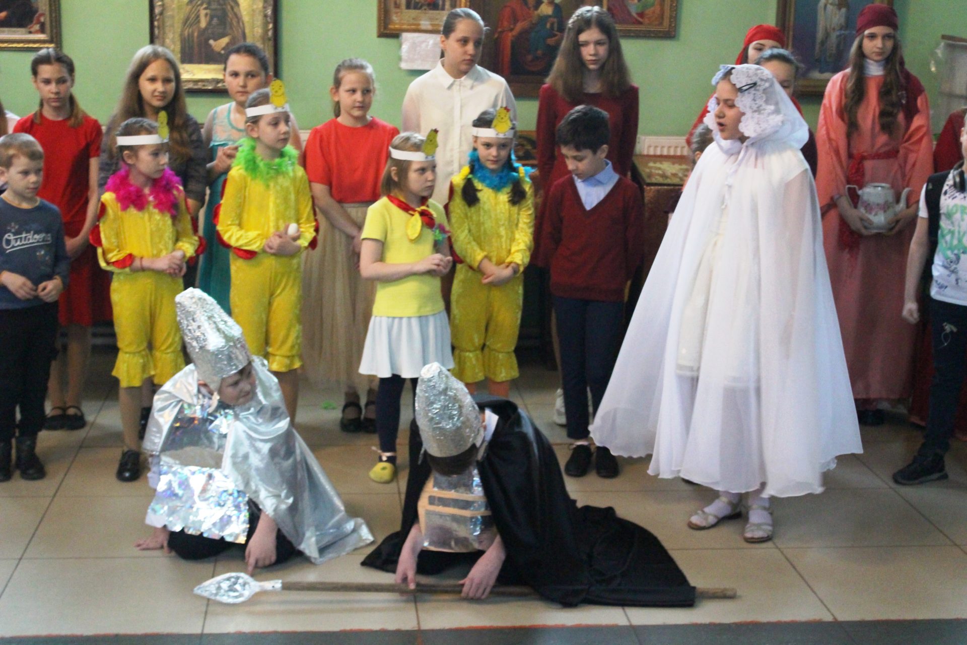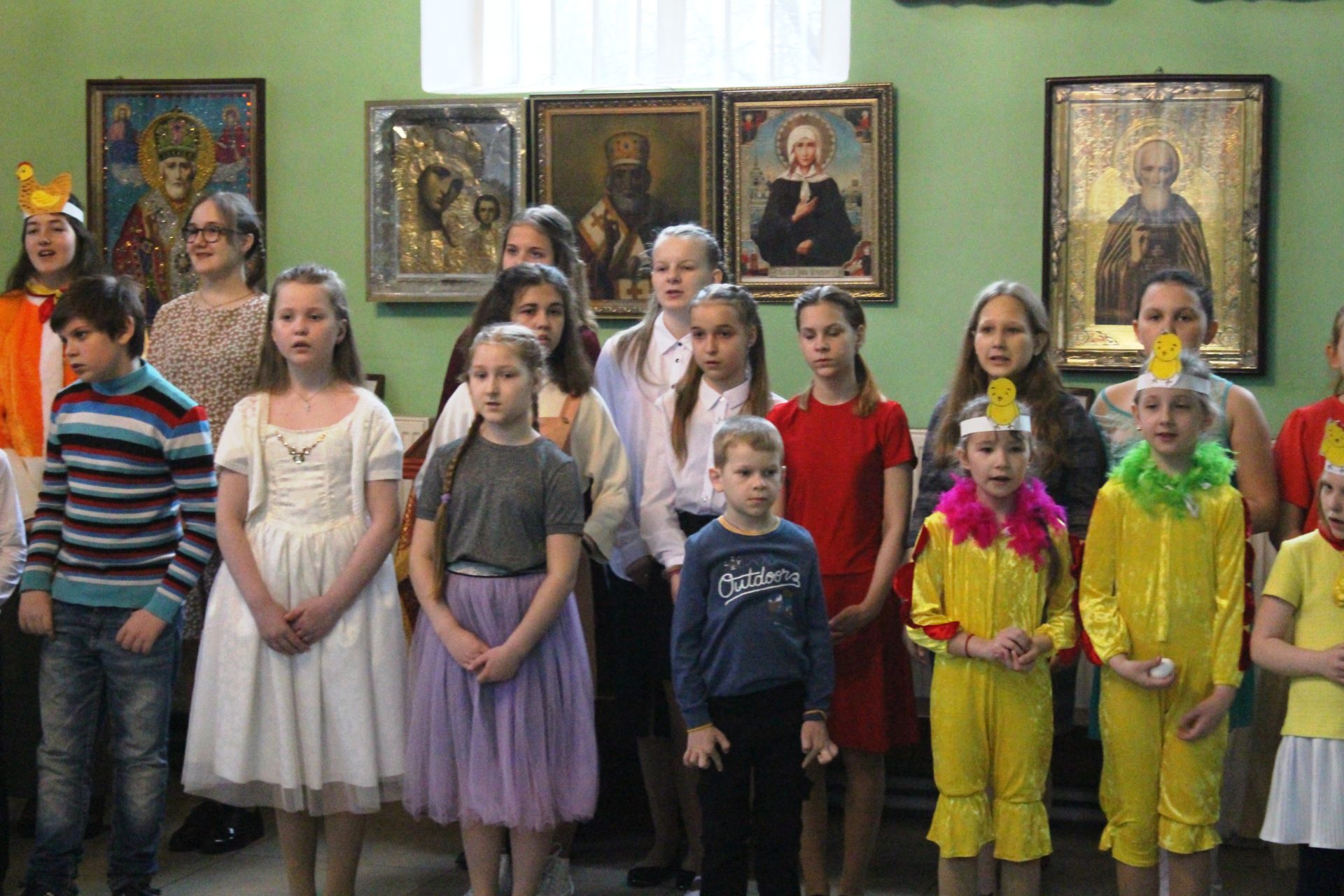 Жены-мироносицы повествовали о земной жизни Иисуса Христа и о Его Воскресении. Внимание зрителей привлекла пасхальная сценка о чуде пасхального яйца. Маленькие цыплятки никого не оставили равнодушными. Необыкновенно трогательный и самый что ни на есть пасхальный сюжет спектакля с проникновенной игрой всех актеров до глубины души поразил зрителей. Были и слёзы, и радость, и искреннее сопереживание во время спектакля. О событиях последних Крестных дней Христа. Ученики читали стихи так, что невозможно было не вспоминать это снова и снова с глубоким чувством. Дети, играющие на сцене, понимали всю важность и ответственность своей роли не только как актеров, но и как проповедников, несущих благую весть об Иисусе Христе. Не обошелся праздник и без стихов. Воспитанники читали стихотворения о Воскресении Спасителя, о радости людей, а также дети порадовали зрителей торжественными пасхальными песнопениями, веселыми детскими песнями о Пасхе! По традиции на празднике присутствовали дети и воспитатели ДРЦ «Чайка». По окончании всех выступлений настоятель храма протоиерей Василий Биляк поблагодарил за проведение праздника детей, преподавателей и родителей. Батюшка поздравил собравшихся воспитанников со Светлым Христовым Воскресением и пожелал сохранять как можно дольше Пасхальную радость и пронести ее до следующей Пасхи. Все присутствовавшие на празднике получили подарки.  По окончании праздника традиционно была сделана общая фотография.
